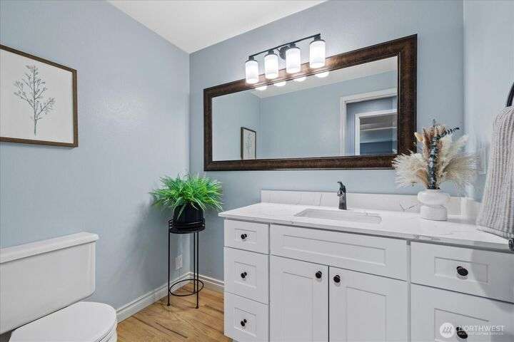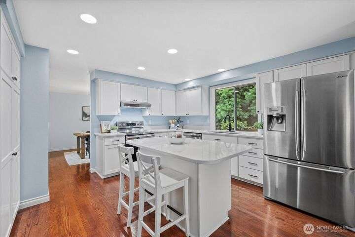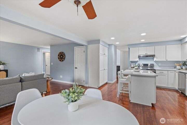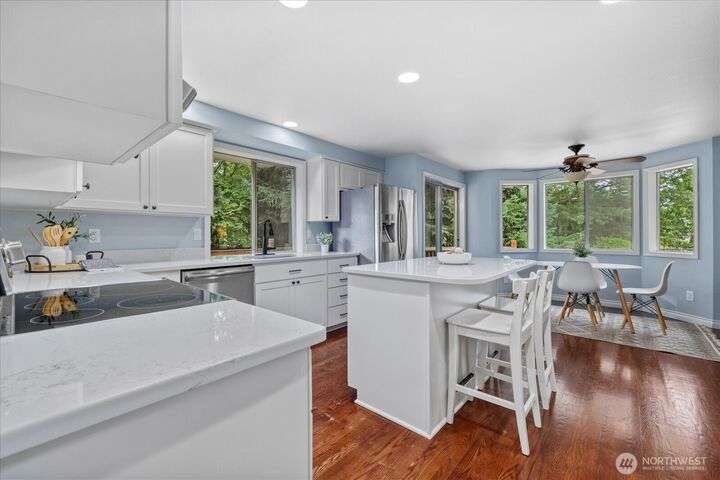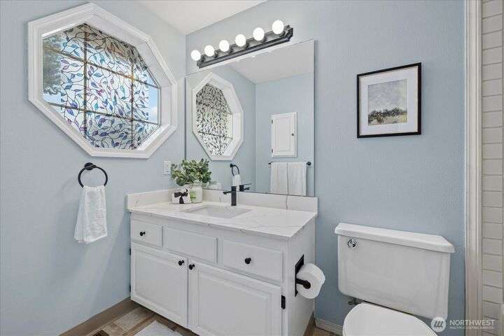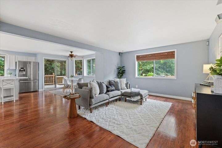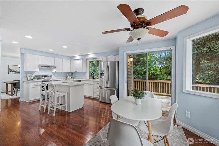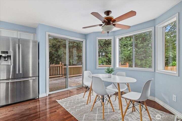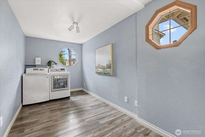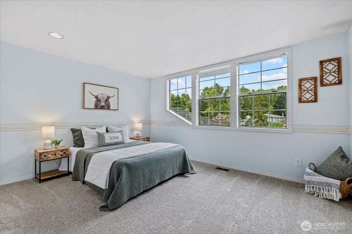 Step inside to light, warmth & spaces crafted for comfortable living. Vaulted ceilings, hardwood floors and a charming wood-burning fireplace set the mood. Walls of windows fill the home with daylight, while open living & dining areas create flow. The kitchen showcases new quartz counters, stainless-steel appliances, refreshed cabinetry & a sunny nook that opens to the deck & fenced yard. Upstairs, the expansive primary retreat offers a seating area, updated bath & versatile loft/office. Bedrooms are spacious, and the oversized laundry adds function & storage. Fresh interior paint, new carpet, wired for hot tub out back & pre-inspected. Peacefully set on a little cul-de-sac near top schools, shopping & commuter routes.