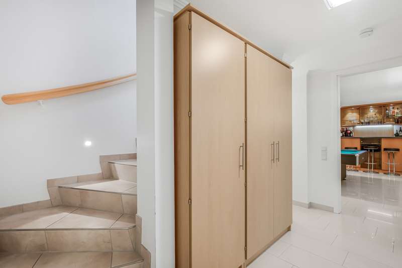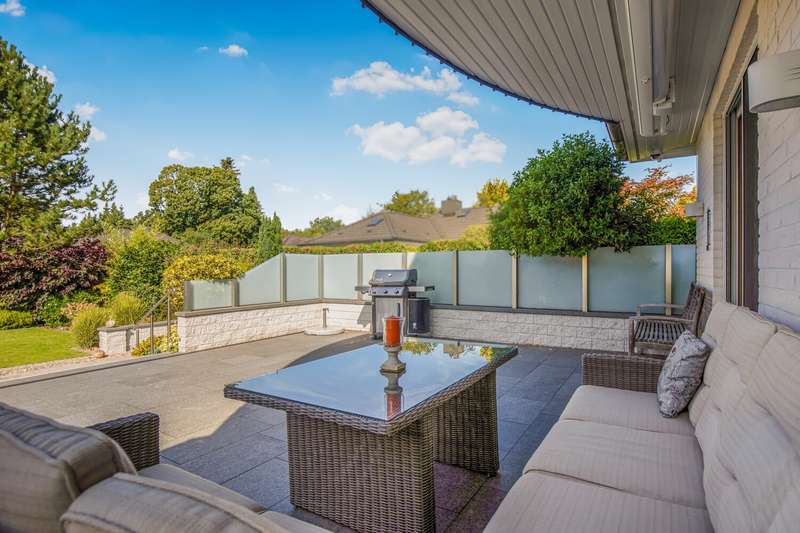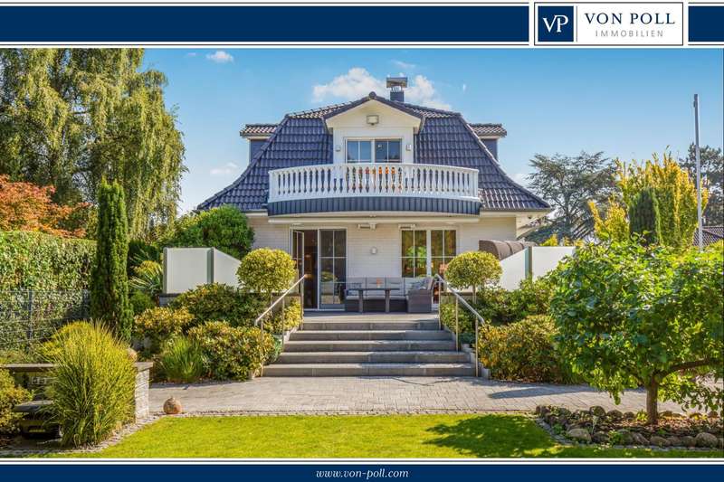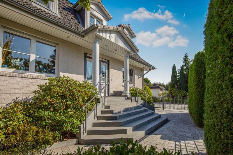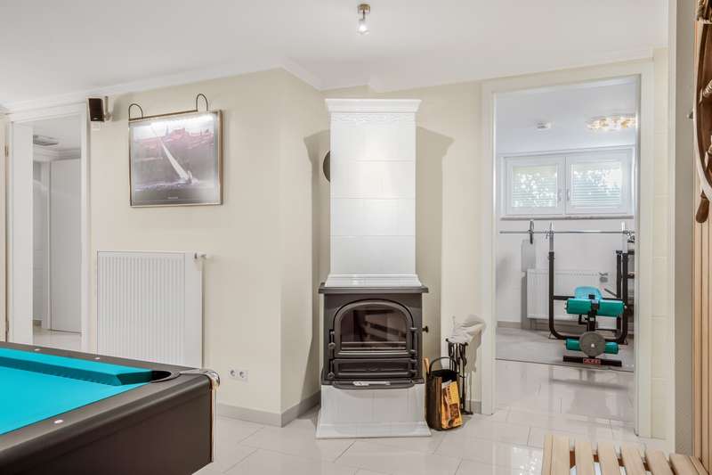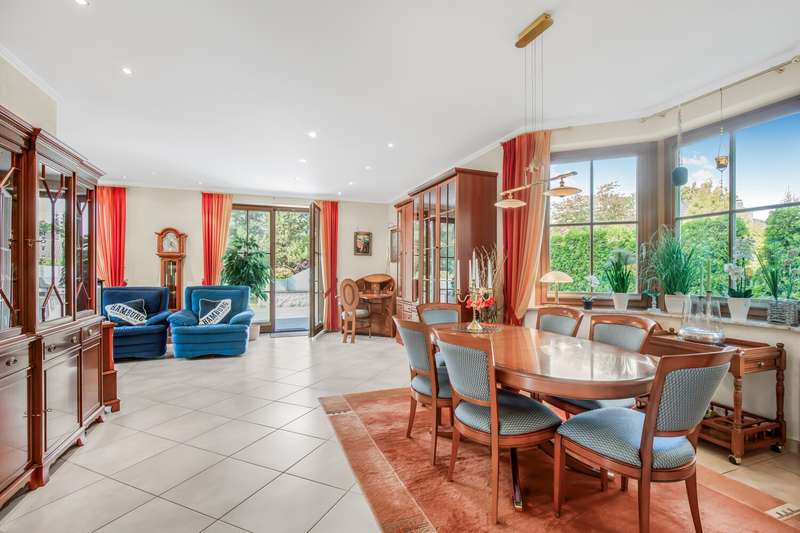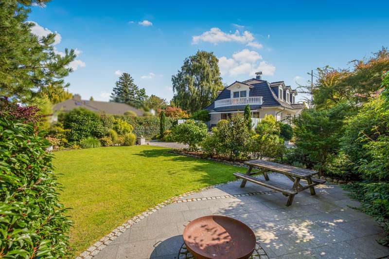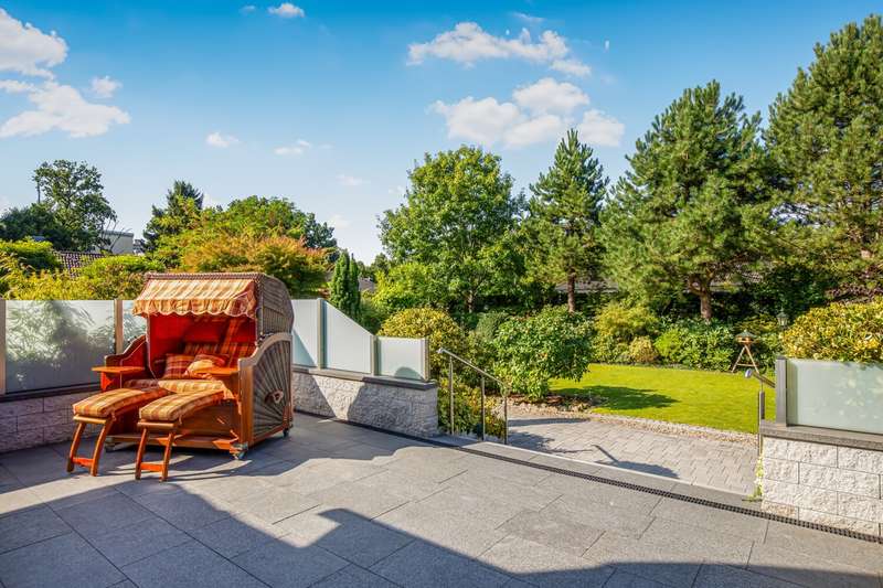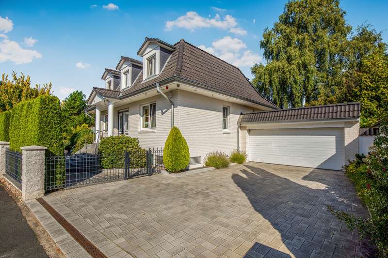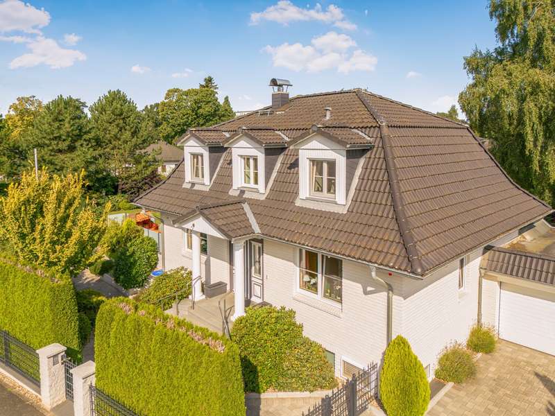 This exceptional town villa with a classic mansard roof was built in 2011 by a renowned construction company using solid construction methods. Situated on a spacious plot of approx. 940 m², it combines modern living with architectural elegance and maximum comfort. The location in the popular district of Norderstedt-Garstedt impresses with its tranquillity, greenery and proximity to the city - a rare balancing act that is impressively achieved here. Prestigious reception and stylish entrance As soon as you enter the property via the electrically controlled access gate and the prestigious front staircase made of flamed natural granite (Oriental Black), it is clear that this property sets standards. The front door with elaborate wooden decorations and artistic glass ornaments opens into a stylish entrance. The spacious entrance area welcomes you with an Italian crystal chandelier, which creates a warm and elegant atmosphere with its golden lighting. To the left, a solid Canadian maple staircase leads to the upper floor; to the right is a tasteful, gilded mirror as well as a practical shoe cupboard and comfortable seating. From here you can access the spacious living area as well as the guest bedroom, the guest shower room and the basement. Spacious living with light, air and quality The first floor impresses with its clear structure, spaciousness and high-quality fittings. The ceiling height was extended by two additional rows of bricks and brought to a clear height of 2.70 m with a suspended false ceiling. Recessed brass spotlights were integrated into these, which - like the exterior lighting - are controlled via the smart home system. The spacious living area with fireplace invites you to relax and opens out onto the generous south-west-facing terrace. The elegant fireplace, made of French marble with a glazed stove insert and gold-plated frame, forms the stylish centerpiece of the room. The open-plan kitchen is equipped with high-quality Miele built-in appliances, including an induction hob, oven, fridge-freezer and dishwasher. The worktops and splashback - like all the windowsills in the house - are made of fine Shivakashi granite. A stylish bay window forms the bright and cozy dining area. A charming, separable patio door provides quick access to the double garage. On the first floor there is also a modern guest shower room and a further room, ideal for use as a guest room, study or children's room. Exclusive upper floor with comfort and privacy The upper floor is dominated by a quiet, homely ambience. High-quality Canadian maple parquet gives all rooms a warm touch. The open hallway area was designed as a reading and library corner - a place of tranquillity and retreat. The master bedroom offers direct access to the sunny balcony with a view of the lovingly landscaped garden. Two further rooms can be used flexibly as a children's room, study or dressing room. The luxurious full bathroom impresses with its exclusive fittings: a corner bath, a spacious shower, a double washbasin made by a carpenter and two cabinets (each based on the "Gloria" model by Burgkama), a seat that also serves as a laundry pouffe and high-quality fittings from the "Delphi" series by Jörger combine functionality with aesthetic appeal. Large windows provide plenty of natural light. There are panic light switches on both floors: the entire interior and exterior lighting is activated at the touch of a button - for an additional sense of security in special situations. Outside, a 1500-watt spotlight, downlights in the underbuild and comprehensive garden lighting reinforce the security concept. Fully-fledged basement - high-quality, functional and close to living space The basement was built in waterproof concrete with a white and black tank and has a perimeter drainage system and comprehensive thermal insulation. The basement was built slightly elevated, resulting in a room height of 2.25 m and a particularly pleasant feeling of space thanks to an additional row of bricks. A practical built-in cupboard for 50 pairs of shoes and a solid steel safe (135 liters, class DIN/EN1143-1), firmly embedded in the wall, have also found their place in the hallway of the basement. The following rooms are located in the basement of this well-designed property:: - A spacious hobby room with pool table, small bar, wood-burning stove for emergency heating, stylish sauna and an adjoining walk-in shower with extractor fan - a real wellness oasis. - A versatile storage and sports room, which also houses some of the building services. - A separate utility room with modern heat pump (Stiebel company), a large hot water tank, washing machine, dryer and central vacuum cleaner system Cyclo Vac. - A utility room with additional hot water tank, large freezer and shelves for storage. - A spacious workshop with electricity - ideal for DIY enthusiasts and hobbyists. Top-level windows, security and smart home technology All windows and doors are from Rekord and are made from certified plantain wood - with a teak look on the inside and a powder-coated aluminum shell on the outside. All windows are triple-glazed, impact-resistant and fitted with burglar protection. High-quality plastic frames were used in the basement. All windows are also fitted with internal, high-quality pleated blinds (model P1415). A modern smart home system reliably controls the shutters, lighting, garden irrigation, awning, gate system and more. Electric shutters are fitted to all windows and can be automatically regulated by time, light levels or sun intensity. State-of-the-art building technology for energy-efficient living In addition to the powerful heat pump heating system (hybrid bus technology), the property offers: - A central vacuum cleaner system with flexible hoses (12.2 m per floor) - Two large hot water tanks - Electric awning - Robot mower - Automatic garden irrigation system - Four garden water connections - External sockets in various areas - The solid mans