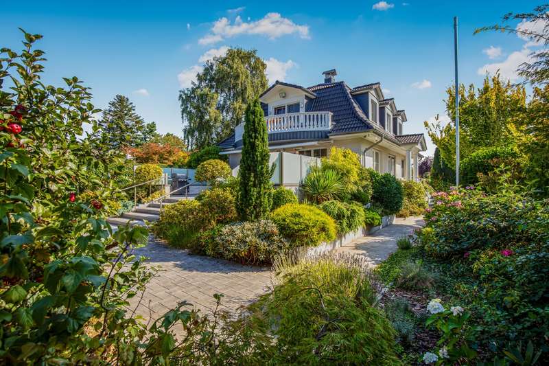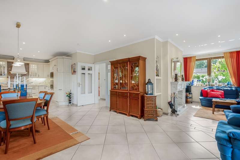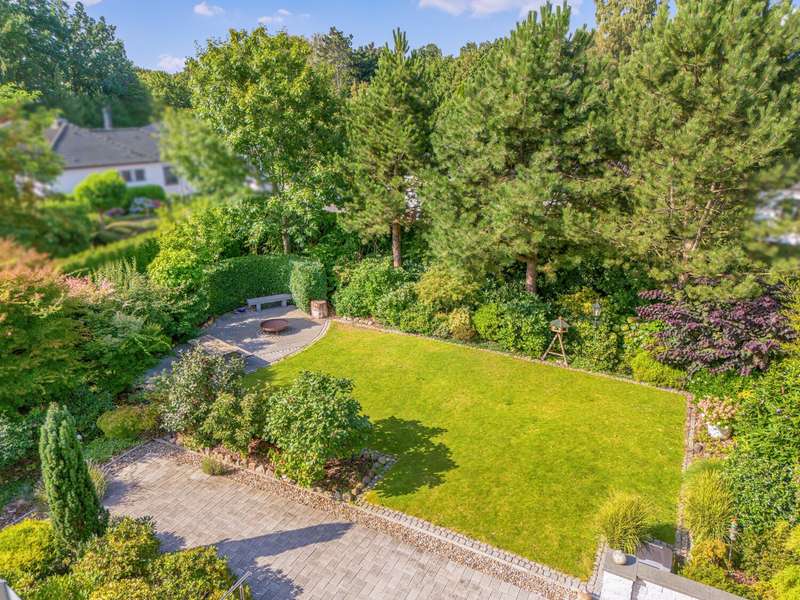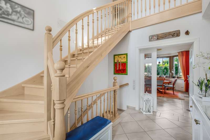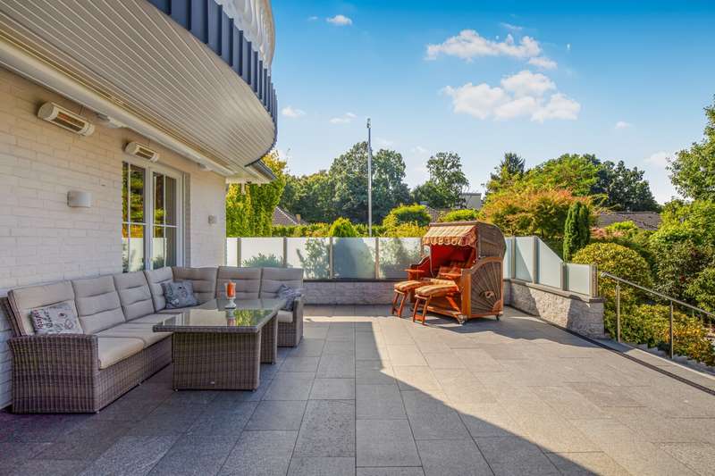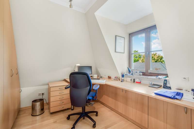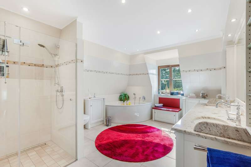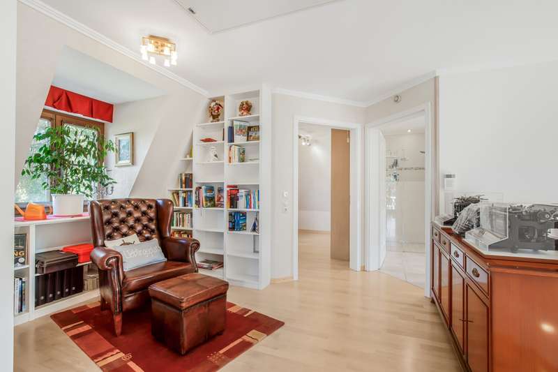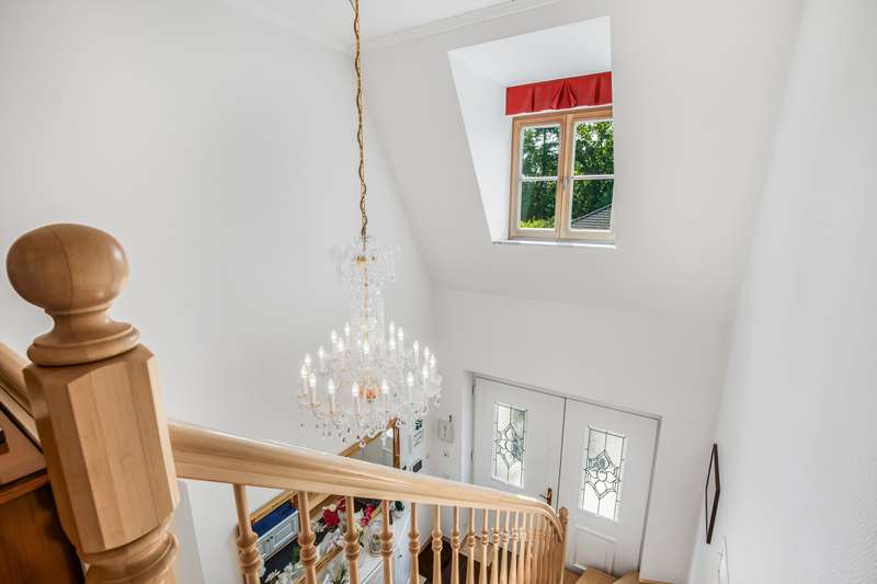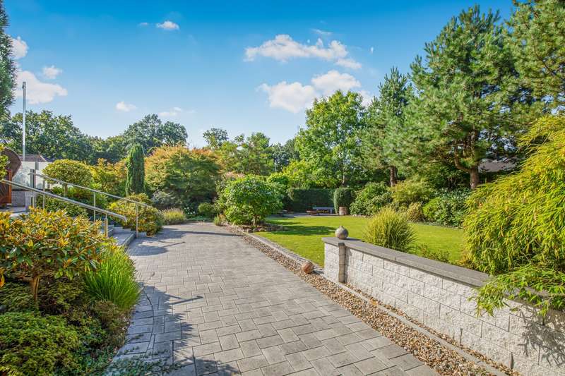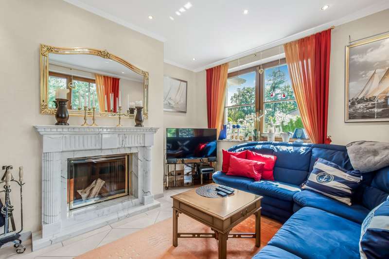 This exceptional town villa with a classic mansard roof was built in 2011 by a renowned construction company using solid construction methods. Situated on a spacious plot of approx. 940 m², it combines modern living with architectural elegance and maximum comfort. The location in the popular district of Norderstedt-Garstedt impresses with its tranquillity, greenery and proximity to the city - a rare balancing act that is impressively achieved here. Prestigious reception and stylish entrance As soon as you enter the property via the electrically controlled access gate and the prestigious front staircase made of flamed natural granite (Oriental Black), it is clear that this property sets standards. The front door with elaborate wooden decorations and artistic glass ornaments opens into a stylish entrance. The spacious entrance area welcomes you with an Italian crystal chandelier, which creates a warm and elegant atmosphere with its golden lighting. To the left, a solid Canadian maple staircase leads to the upper floor; to the right is a tasteful, gilded mirror as well as a practical shoe cupboard and comfortable seating. From here you can access the spacious living area as well as the guest bedroom, the guest shower room and the basement. Spacious living with light, air and quality The first floor impresses with its clear structure, spaciousness and high-quality fittings. The ceiling height was extended by two additional rows of bricks and brought to a clear height of 2.70 m with a suspended false ceiling. Recessed brass spotlights were integrated into these, which - like the exterior lighting - are controlled via the smart home system. The spacious living area with fireplace invites you to relax and opens out onto the generous south-west-facing terrace. The elegant fireplace, made of French marble with a glazed stove insert and gold-plated frame, forms the stylish centerpiece of the room. The open-plan kitchen is equipped with high-quality Miele built-in appliances, including an induction hob, oven, fridge-freezer and dishwasher. The worktops and splashback - like all the windowsills in the house - are made of fine Shivakashi granite. A stylish bay window forms the bright and cozy dining area. A charming, separable patio door provides quick access to the double garage. On the first floor there is also a modern guest shower room and a further room, ideal for use as a guest room, study or children's room. Exclusive upper floor with comfort and privacy The upper floor is dominated by a quiet, homely ambience. High-quality Canadian maple parquet gives all rooms a warm touch. The open hallway area was designed as a reading and library corner - a place of tranquillity and retreat. The master bedroom offers direct access to the sunny balcony with a view of the lovingly landscaped garden. Two further rooms can be used flexibly as a children's room, study or dressing room. The luxurious full bathroom impresses with its exclusive fittings: a corner bath, a spacious shower, a double washbasin made by a carpenter and two cabinets (each based on the "Gloria" model by Burgkama), a seat that also serves as a laundry pouffe and high-quality fittings from the "Delphi" series by Jörger combine functionality with aesthetic appeal. Large windows provide plenty of natural light. There are panic light switches on both floors: the entire interior and exterior lighting is activated at the touch of a button - for an additional sense of security in special situations. Outside, a 1500-watt spotlight, downlights in the underbuild and comprehensive garden lighting reinforce the security concept. Fully-fledged basement - high-quality, functional and close to living space The basement was built in waterproof concrete with a white and black tank and has a perimeter drainage system and comprehensive thermal insulation. The basement was built slightly elevated, resulting in a room height of 2.25 m and a particularly pleasant feeling of space thanks to an additional row of bricks. A practical built-in cupboard for 50 pairs of shoes and a solid steel safe (135 liters, class DIN/EN1143-1), firmly embedded in the wall, have also found their place in the hallway of the basement. The following rooms are located in the basement of this well-designed property:: - A spacious hobby room with pool table, small bar, wood-burning stove for emergency heating, stylish sauna and an adjoining walk-in shower with extractor fan - a real wellness oasis. - A versatile storage and sports room, which also houses some of the building services. - A separate utility room with modern heat pump (Stiebel company), a large hot water tank, washing machine, dryer and central vacuum cleaner system Cyclo Vac. - A utility room with additional hot water tank, large freezer and shelves for storage. - A spacious workshop with electricity - ideal for DIY enthusiasts and hobbyists. Top-level windows, security and smart home technology All windows and doors are from Rekord and are made from certified plantain wood - with a teak look on the inside and a powder-coated aluminum shell on the outside. All windows are triple-glazed, impact-resistant and fitted with burglar protection. High-quality plastic frames were used in the basement. All windows are also fitted with internal, high-quality pleated blinds (model P1415). A modern smart home system reliably controls the shutters, lighting, garden irrigation, awning, gate system and more. Electric shutters are fitted to all windows and can be automatically regulated by time, light levels or sun intensity. State-of-the-art building technology for energy-efficient living In addition to the powerful heat pump heating system (hybrid bus technology), the property offers: - A central vacuum cleaner system with flexible hoses (12.2 m per floor) - Two large hot water tanks - Electric awning - Robot mower - Automatic garden irrigation system - Four garden water connections - External sockets in various areas - The solid mans