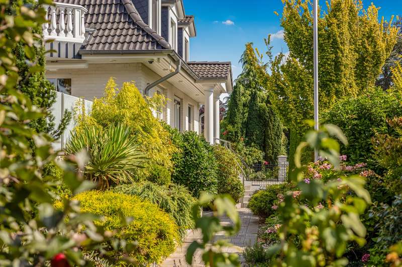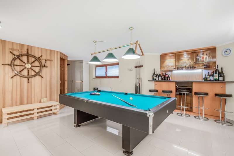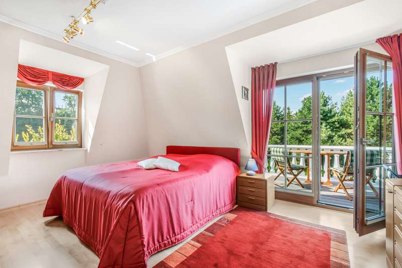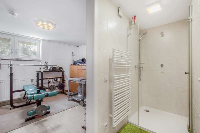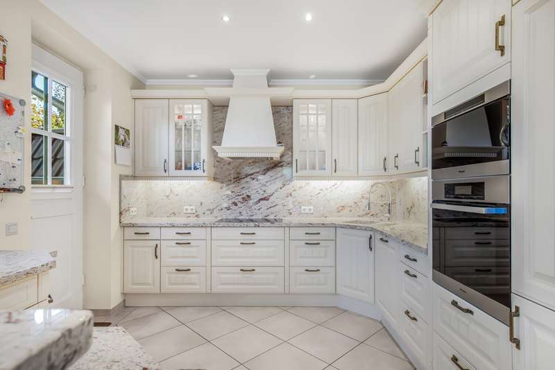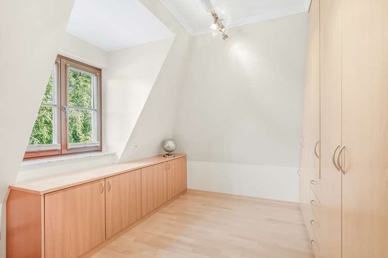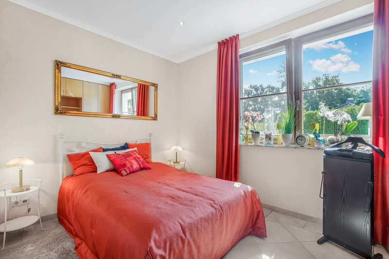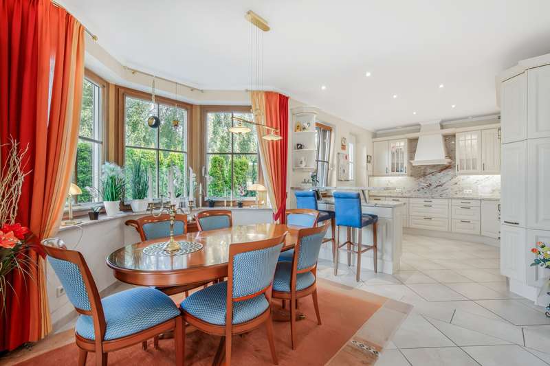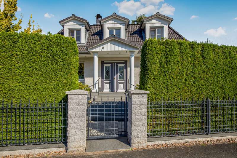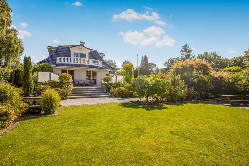 This exceptional town villa with a classic mansard roof was built in 2011 by a renowned construction company using solid construction methods. Situated on a spacious plot of approx. 940 m², it combines modern living with architectural elegance and maximum comfort. The location in the popular district of Norderstedt-Garstedt impresses with its tranquillity, greenery and proximity to the city - a rare balancing act that is impressively achieved here. Prestigious reception and stylish entrance As soon as you enter the property via the electrically controlled access gate and the prestigious front staircase made of flamed natural granite (Oriental Black), it is clear that this property sets standards. The front door with elaborate wooden decorations and artistic glass ornaments opens into a stylish entrance. The spacious entrance area welcomes you with an Italian crystal chandelier, which creates a warm and elegant atmosphere with its golden lighting. To the left, a solid Canadian maple staircase leads to the upper floor; to the right is a tasteful, gilded mirror as well as a practical shoe cupboard and comfortable seating. From here you can access the spacious living area as well as the guest bedroom, the guest shower room and the basement. Spacious living with light, air and quality The first floor impresses with its clear structure, spaciousness and high-quality fittings. The ceiling height was extended by two additional rows of bricks and brought to a clear height of 2.70 m with a suspended false ceiling. Recessed brass spotlights were integrated into these, which - like the exterior lighting - are controlled via the smart home system. The spacious living area with fireplace invites you to relax and opens out onto the generous south-west-facing terrace. The elegant fireplace, made of French marble with a glazed stove insert and gold-plated frame, forms the stylish centerpiece of the room. The open-plan kitchen is equipped with high-quality Miele built-in appliances, including an induction hob, oven, fridge-freezer and dishwasher. The worktops and splashback - like all the windowsills in the house - are made of fine Shivakashi granite. A stylish bay window forms the bright and cozy dining area. A charming, separable patio door provides quick access to the double garage. On the first floor there is also a modern guest shower room and a further room, ideal for use as a guest room, study or children's room. Exclusive upper floor with comfort and privacy The upper floor is dominated by a quiet, homely ambience. High-quality Canadian maple parquet gives all rooms a warm touch. The open hallway area was designed as a reading and library corner - a place of tranquillity and retreat. The master bedroom offers direct access to the sunny balcony with a view of the lovingly landscaped garden. Two further rooms can be used flexibly as a children's room, study or dressing room. The luxurious full bathroom impresses with its exclusive fittings: a corner bath, a spacious shower, a double washbasin made by a carpenter and two cabinets (each based on the "Gloria" model by Burgkama), a seat that also serves as a laundry pouffe and high-quality fittings from the "Delphi" series by Jörger combine functionality with aesthetic appeal. Large windows provide plenty of natural light. There are panic light switches on both floors: the entire interior and exterior lighting is activated at the touch of a button - for an additional sense of security in special situations. Outside, a 1500-watt spotlight, downlights in the underbuild and comprehensive garden lighting reinforce the security concept. Fully-fledged basement - high-quality, functional and close to living space The basement was built in waterproof concrete with a white and black tank and has a perimeter drainage system and comprehensive thermal insulation. The basement was built slightly elevated, resulting in a room height of 2.25 m and a particularly pleasant feeling of space thanks to an additional row of bricks. A practical built-in cupboard for 50 pairs of shoes and a solid steel safe (135 liters, class DIN/EN1143-1), firmly embedded in the wall, have also found their place in the hallway of the basement. The following rooms are located in the basement of this well-designed property:: - A spacious hobby room with pool table, small bar, wood-burning stove for emergency heating, stylish sauna and an adjoining walk-in shower with extractor fan - a real wellness oasis. - A versatile storage and sports room, which also houses some of the building services. - A separate utility room with modern heat pump (Stiebel company), a large hot water tank, washing machine, dryer and central vacuum cleaner system Cyclo Vac. - A utility room with additional hot water tank, large freezer and shelves for storage. - A spacious workshop with electricity - ideal for DIY enthusiasts and hobbyists. Top-level windows, security and smart home technology All windows and doors are from Rekord and are made from certified plantain wood - with a teak look on the inside and a powder-coated aluminum shell on the outside. All windows are triple-glazed, impact-resistant and fitted with burglar protection. High-quality plastic frames were used in the basement. All windows are also fitted with internal, high-quality pleated blinds (model P1415). A modern smart home system reliably controls the shutters, lighting, garden irrigation, awning, gate system and more. Electric shutters are fitted to all windows and can be automatically regulated by time, light levels or sun intensity. State-of-the-art building technology for energy-efficient living In addition to the powerful heat pump heating system (hybrid bus technology), the property offers: - A central vacuum cleaner system with flexible hoses (12.2 m per floor) - Two large hot water tanks - Electric awning - Robot mower - Automatic garden irrigation system - Four garden water connections - External sockets in various areas - The solid mans