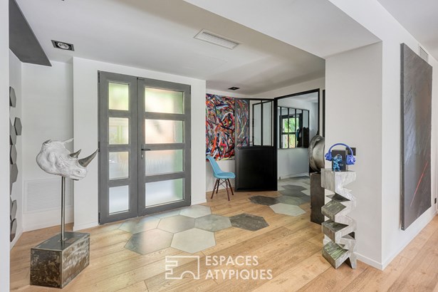 On the lower floor, an art gallery-style home office reveals itself as a confidential space, ideal for working. The atmosphere continues in a room dedicated to evenings, where billiards, pinball, fireplace and sofas create a convivial setting.