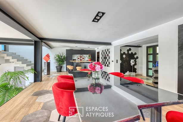 The theatrical dining room harmoniously complements the living room, connected to a fitted and equipped kitchen, ingeniously designed for entertaining with its counter.
