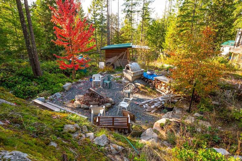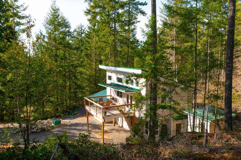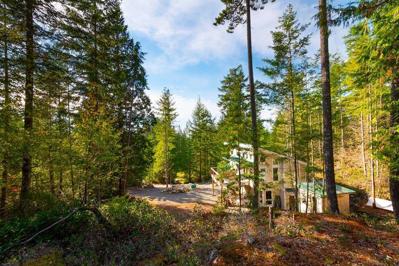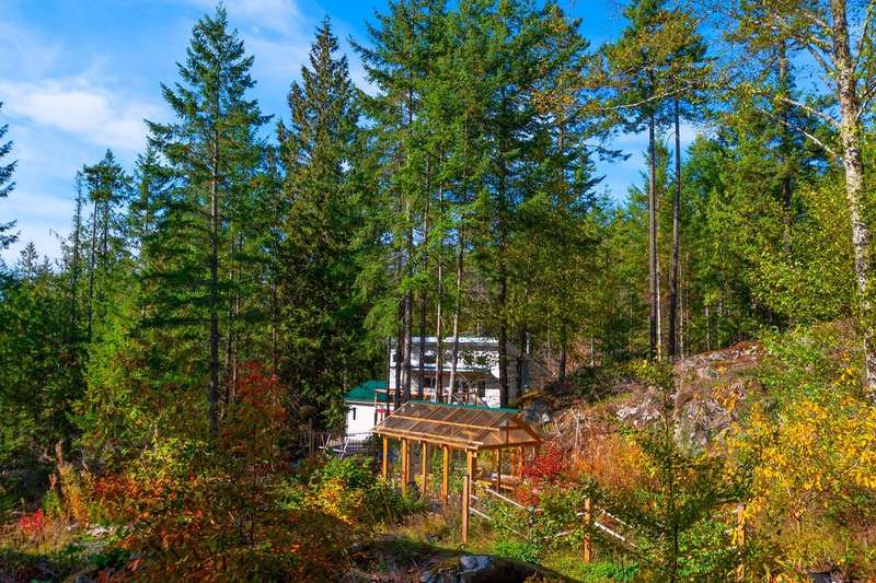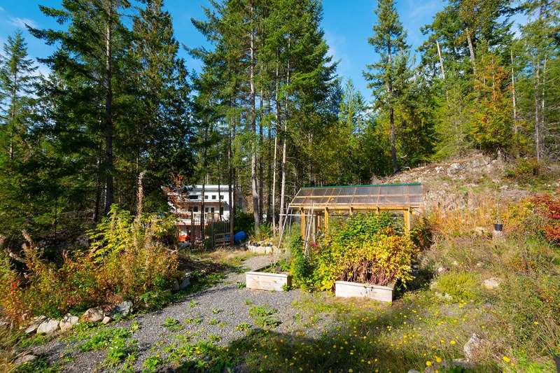 Bordering parks on two sides and forested crownland on a third, this property and home exude privacy. Non-strata, 3.38 acres, and built in 2023. The 1,500 sf home sits just above Aaron's Field, and features a reverse floor plan, sun-soaked deck off the open plan LR/DR/kitchen, and a rough in for an elevator. The fenced-in veggie garden features fire pit, pizza oven, green house and water collection into a large storage tank. There is a cleared, 2nd build site for another potential home up at the top of the property, and plenty of potential for hobby farming and living off the land. Close to trails down to Bowen Bay beach, up Mt Gardner, and more.
