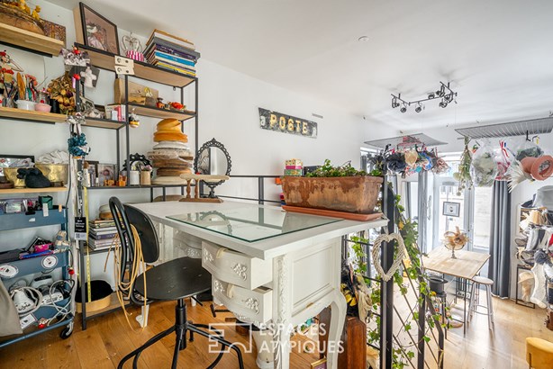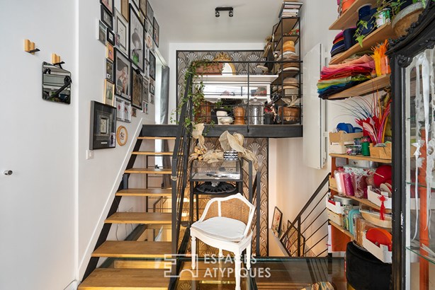 Upon entry, the glass blocks filter subtle light, enhancing the impressive ceiling height and generous volumes. An elegant mezzanine overlooks the space, adding an airy dimension and extra charm to this unique location.