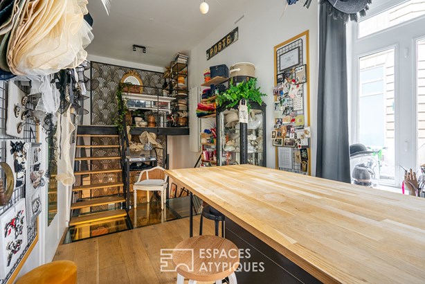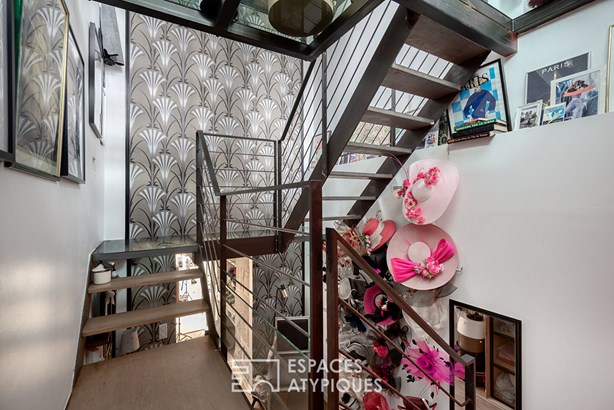 With its atypical layout, this rare property presents an exceptional opportunity for a commercial activity or a bold reinterpretation of the space. Exotic wallpaper designs blend with brushed steel stairs. The lower level hosts a kitchen area and a functional, minimalist bathroom.