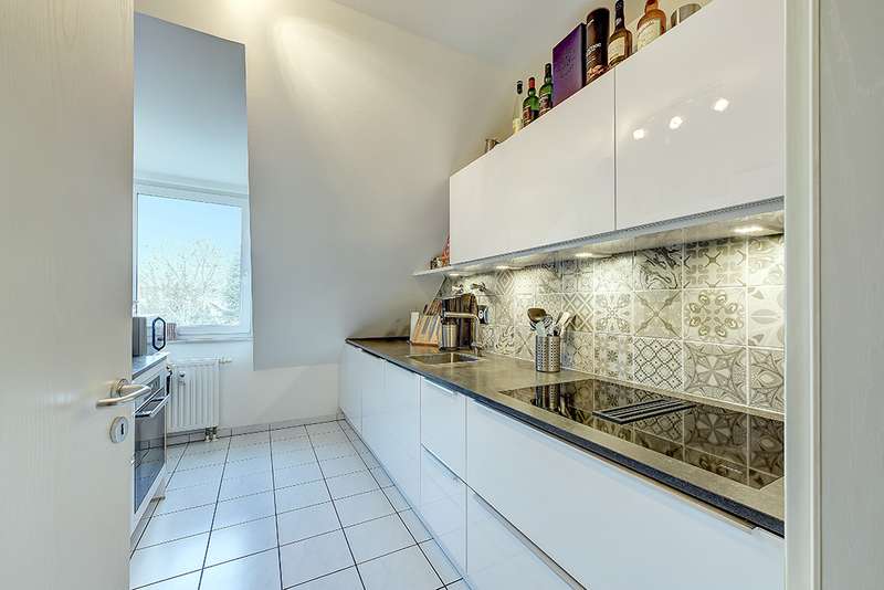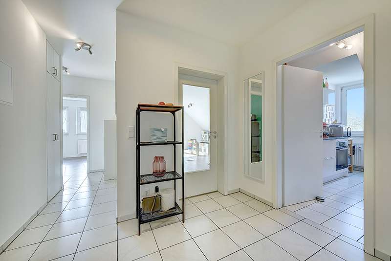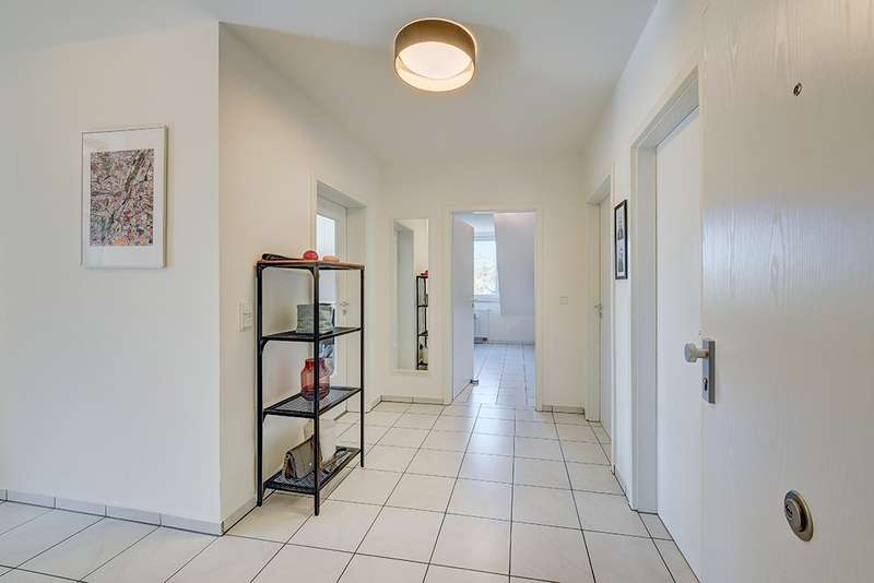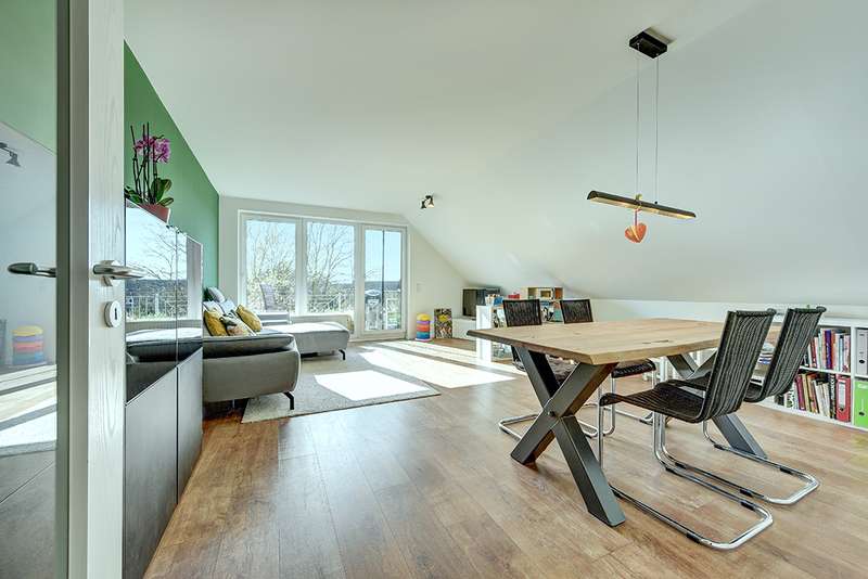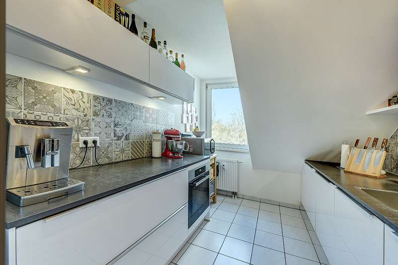 This well-kept penthouse apartment, which was built ready for occupancy in 2000, offers modern living comfort on just under 90 m² of living space. The sloping ceilings make it appear significantly larger. Extensively modernized in 2020, the apartment impresses with a clever room layout and high-quality furnishings that combine both functionality and aesthetics. Upon entering the apartment, you are greeted by an open-plan living area with large windows that ensure a pleasant level of brightness. The living room offers enough space for a comfortable seating area and a dining area. From here, you have direct access to the balcony, which offers an incomparable view of the adjacent fields. An awning provides shade on sunny days and increases living comfort. The modern Thelen fitted kitchen, which was also installed as part of the last renovation in 2020, is characterized by high quality and functionality. It is equipped with all the necessary electrical appliances and offers plenty of storage space and work surfaces for preparing culinary delights. All appliances and materials are from renowned manufacturers and meet the highest standards. Two well-equipped bedrooms allow for individual use, whether as a children's room, guest room or quiet retreat. Both rooms offer ample space for wardrobes and personal decoration. Two existing bathrooms with shower and bath solutions further enhance living comfort. The apartment offers practical amenities in addition to its residential benefits: Two parking spaces in the underground garage belong to the apartment and can be purchased. A separate bicycle parking space is also available. The apartment is heated by an efficient central heating system. The solid building fabric of the house is up to date thanks to continuous maintenance and modernization, which ensures a pleasant living atmosphere. In summary, this apartment offers a high standard of living in an attractive environment. The well thought-out layout and high-quality fittings make this property ideal for couples or small families who appreciate a modern home. If you are looking for a comfortable living solution that impresses with both design and functionality, please arrange a viewing to see for yourself.