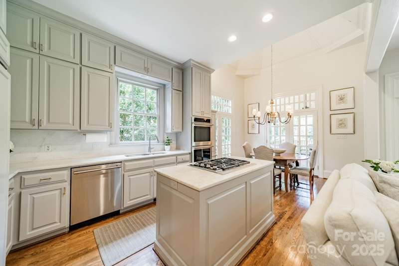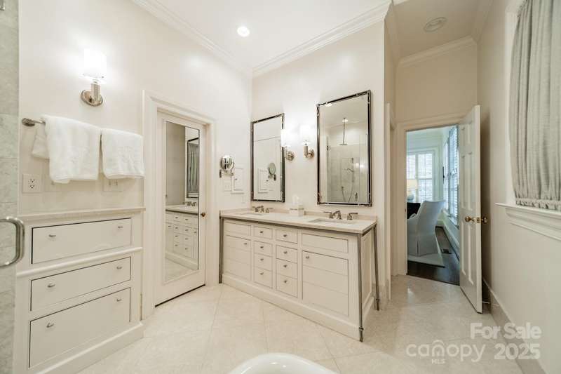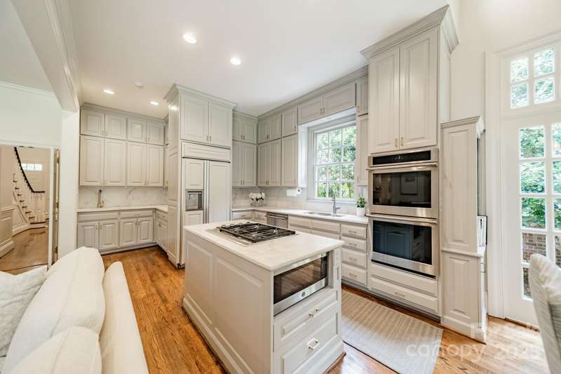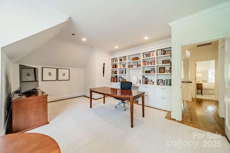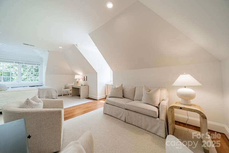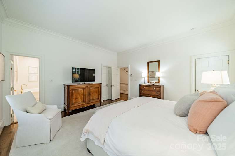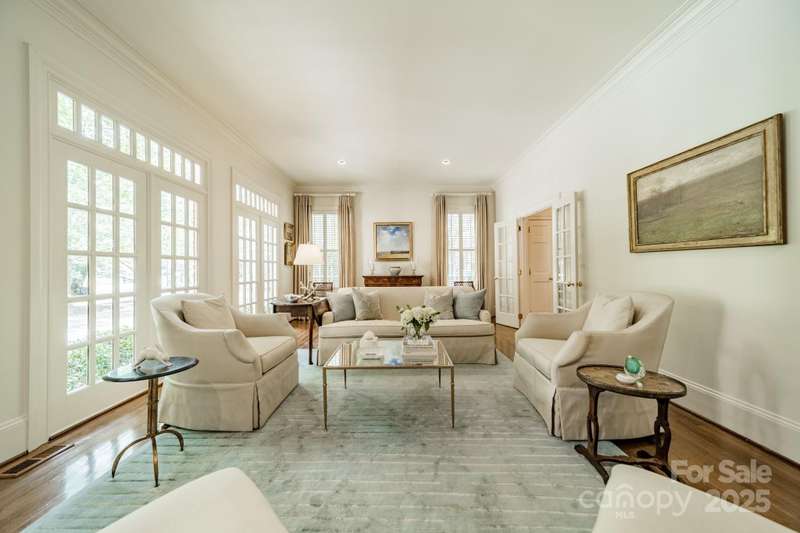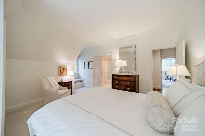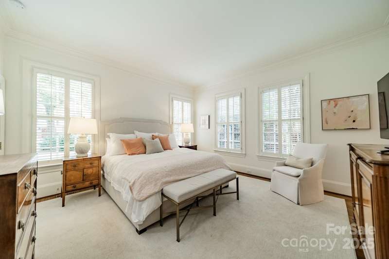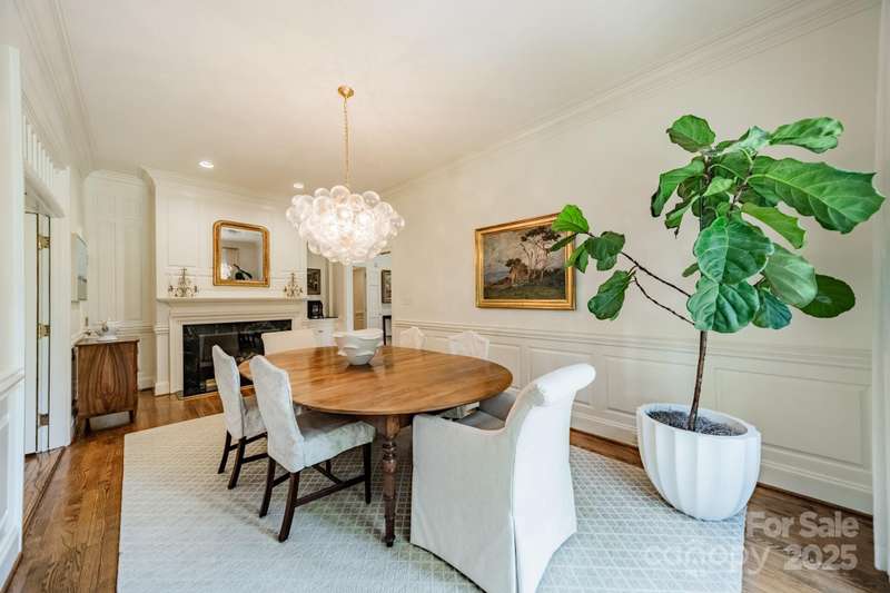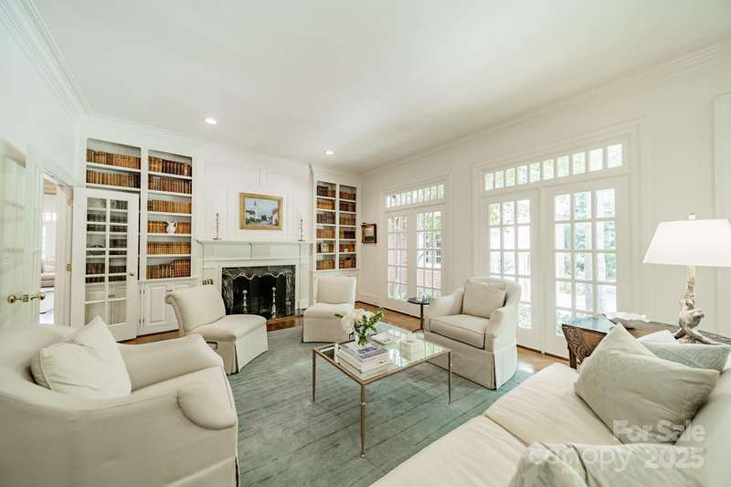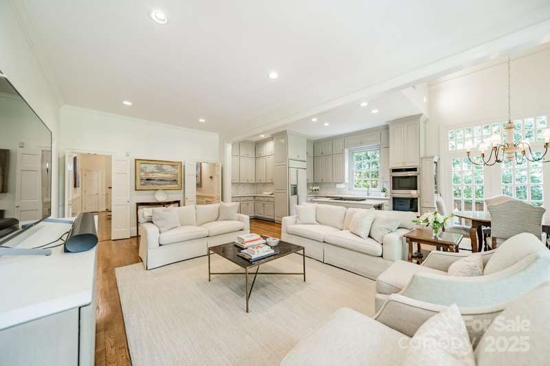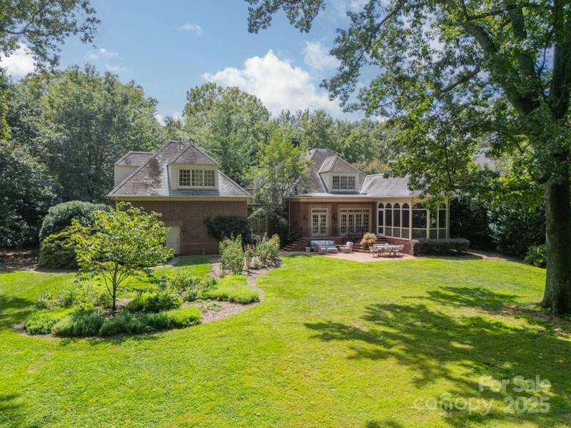 Located in the prestigious Eastover neighborhood, this exquisite residence combines timeless elegance with modern livability. Situated on a rare 1.25-acre lot, the home offers expansive open grounds framed by mature trees and protected by a sight easement, ensuring uninterrupted views and privacy.Inside, soaring ceilings and an open floor plan create an inviting flow. Both the living room and dining room feature fireplaces, adding warmth and sophistication to the heart of the home. The primary suite is conveniently located on the main level, while upstairs youll find three spacious guest roomsone with a private ensuite bath.A unique highlight is the private guest quarters over the attached garage, complete with a kitchenette, ideal for extended stays or a home office retreat.This is a rare opportunity to own a remarkable estate in one of Charlottes most coveted neighborhood