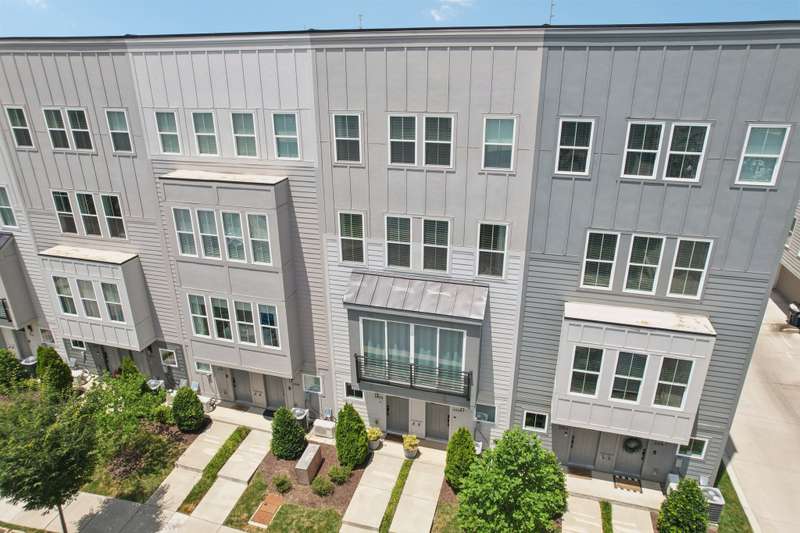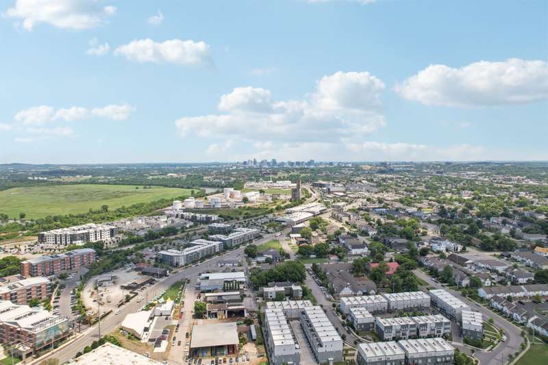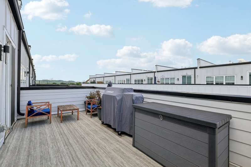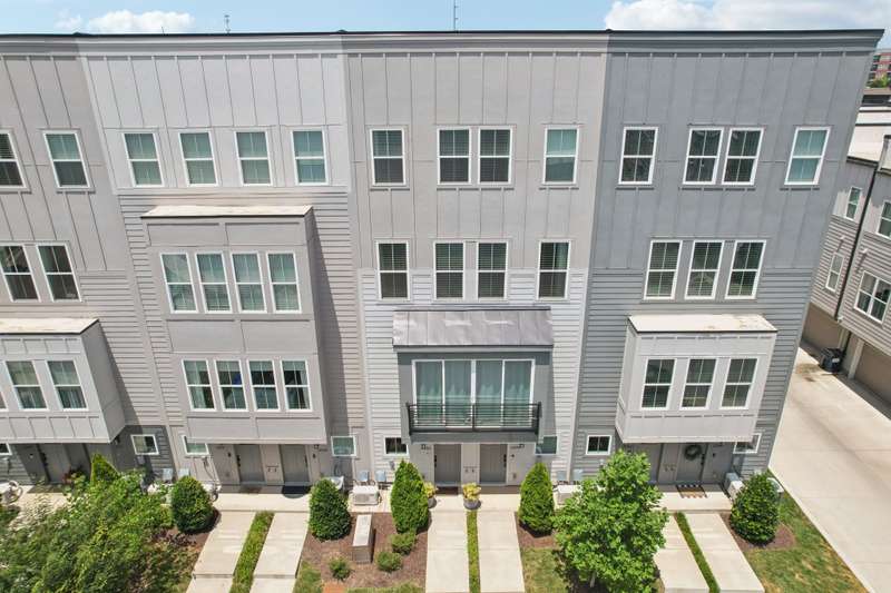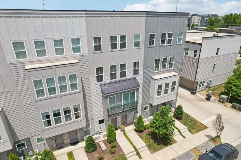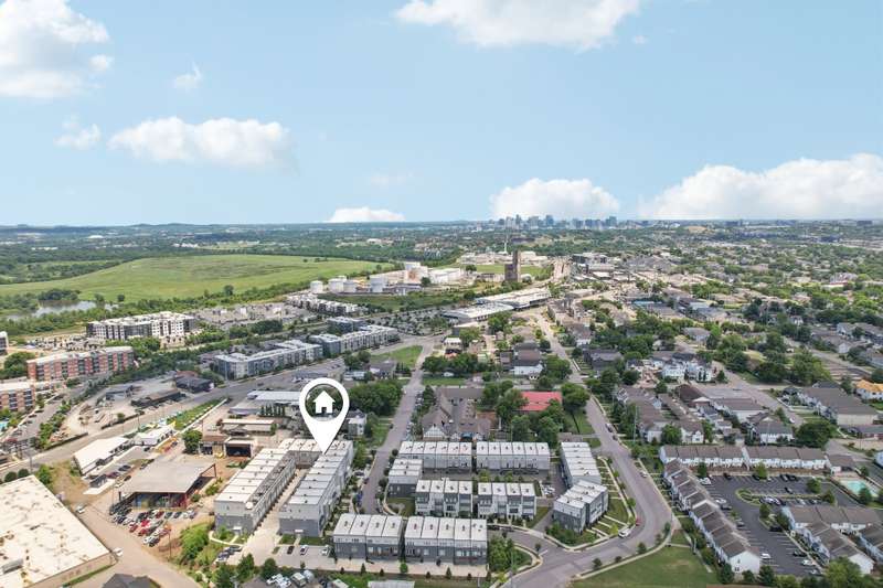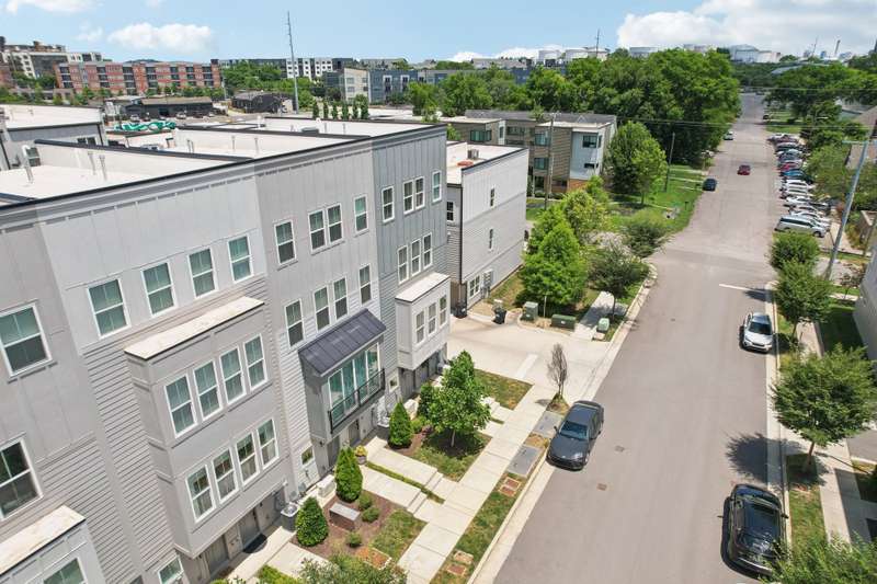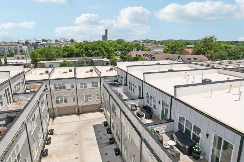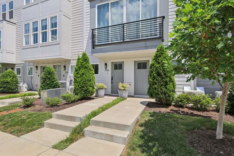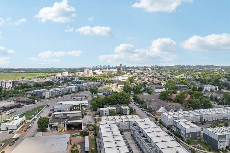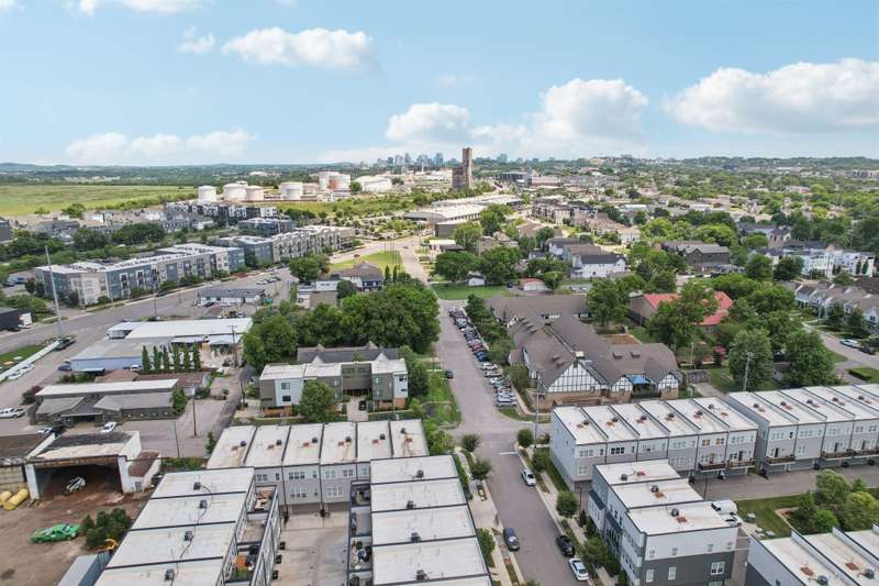 Move-in ready home in the Nations! This interior stacked flat built in 2022 features 3 beds, 3 baths, 2,274 sq. feet and a 2-car tandem garage. Exquisite condition. Entry foyer w/ drop-zone & closet located on the first floor. On the main level you've got a great spacious open living area. Kitchen w/ eat-in island, backsplash, stainless steel appliances, and a large pantry! Dining area w/ custom built-in bar w/ wine fridge flows into the living room w/ custom shelving and four large windows providing abundant natural light. Main level also features a bedroom w/ attached full bathroom and walk-in closet. Upstairs you'll find a large primary suite with two separate walk-in closets. Primary bathroom features a tiled walk-in shower and double vanities. Bedroom #3 w/ attached full bathroom and walk-in closet. Plus you'll be able to enjoy your own rooftop terrace! Custom closet systems installed in all closets. Installed blinds, curtains, and window screens throughout. All appliances included. Outdoor community amenities include a fire pit and dog run. So many great restaurants, shops, bars, and more within a 10-minute walk or bike ride, and this property is located only 5 miles from Downtown Nashville! 3D tour link available in media section.