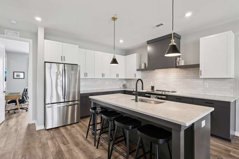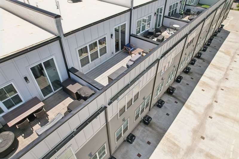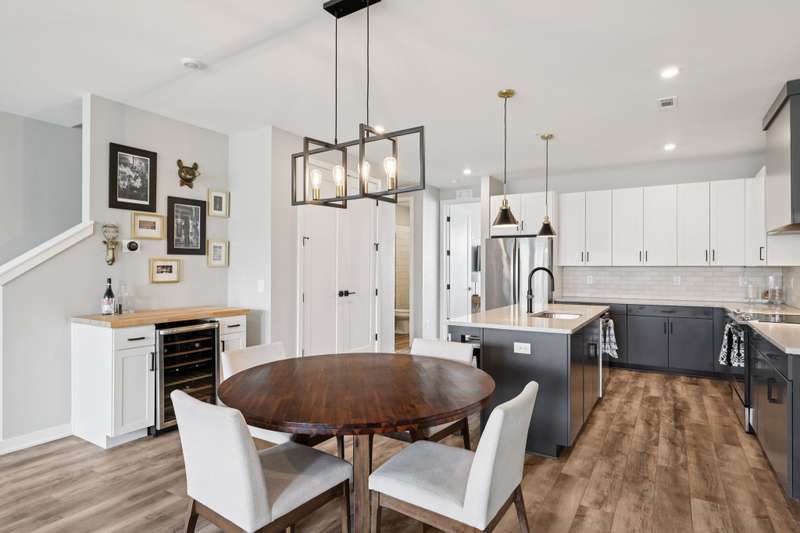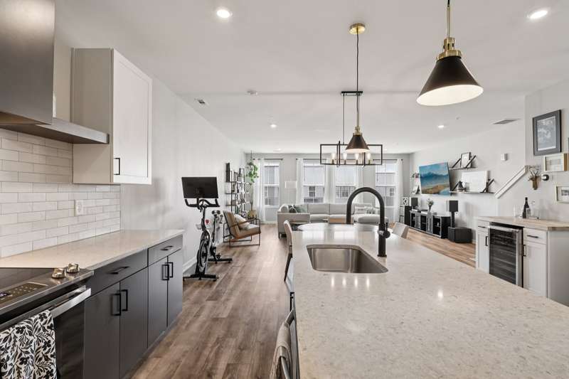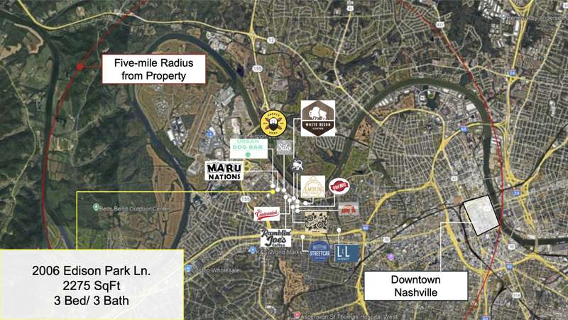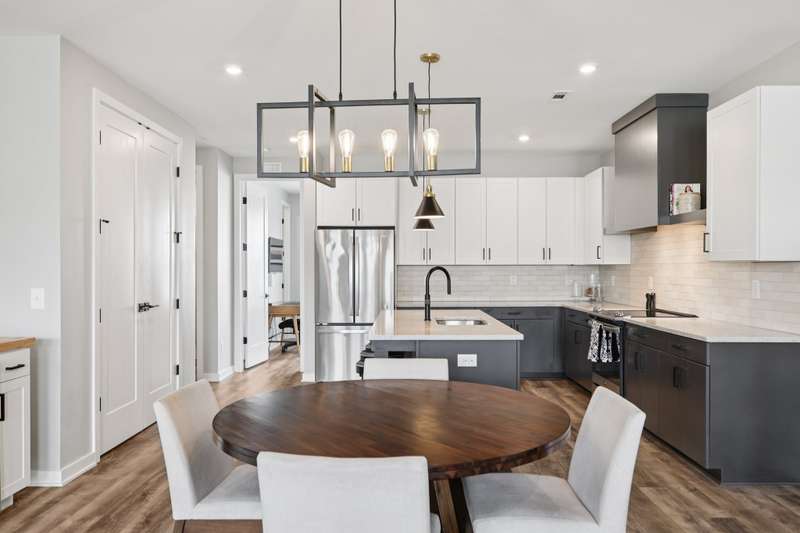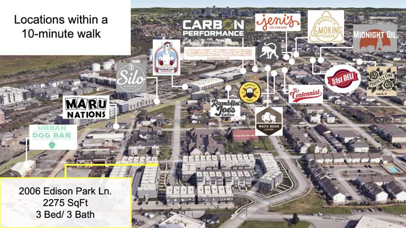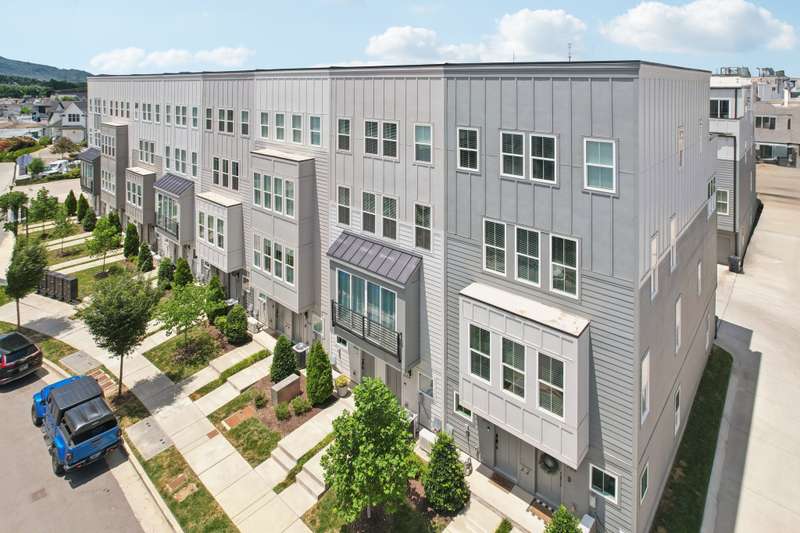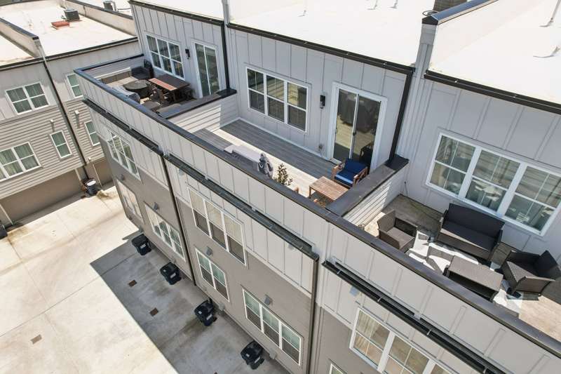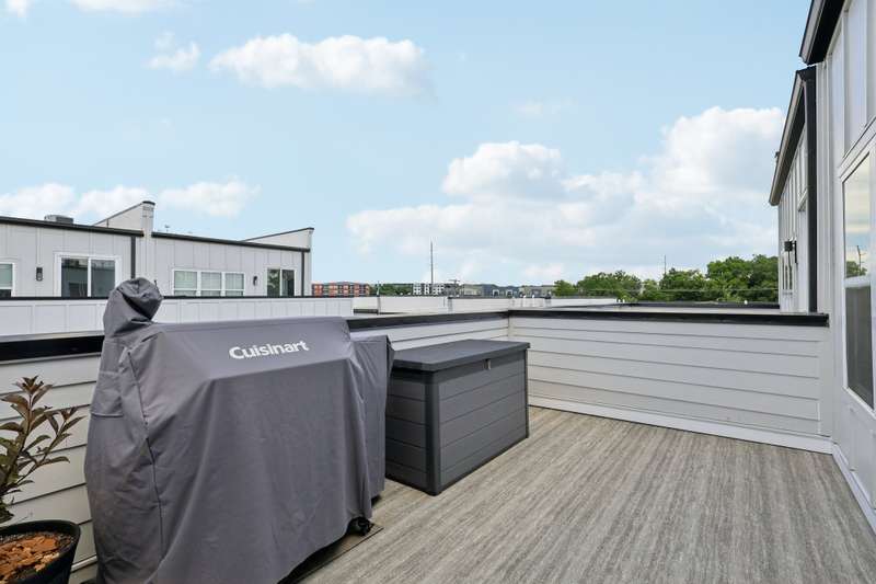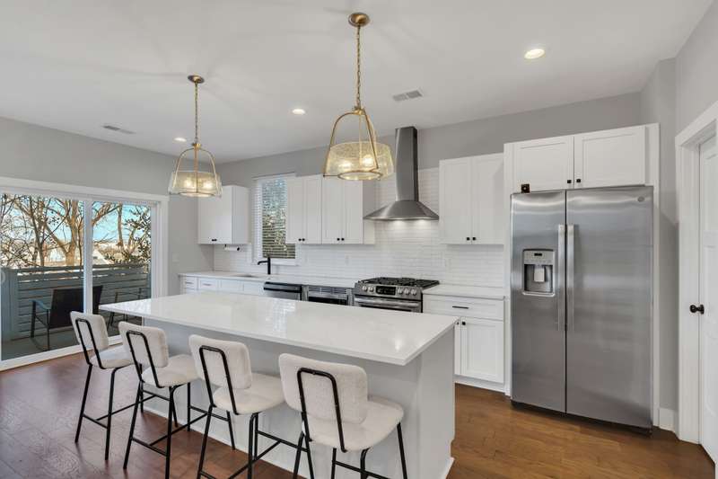 Move-in ready home in the Nations! This interior stacked flat built in 2022 features 3 beds, 3 baths, 2,274 sq. feet and a 2-car tandem garage. Exquisite condition. Entry foyer w/ drop-zone & closet located on the first floor. On the main level you've got a great spacious open living area. Kitchen w/ eat-in island, backsplash, stainless steel appliances, and a large pantry! Dining area w/ custom built-in bar w/ wine fridge flows into the living room w/ custom shelving and four large windows providing abundant natural light. Main level also features a bedroom w/ attached full bathroom and walk-in closet. Upstairs you'll find a large primary suite with two separate walk-in closets. Primary bathroom features a tiled walk-in shower and double vanities. Bedroom #3 w/ attached full bathroom and walk-in closet. Plus you'll be able to enjoy your own rooftop terrace! Custom closet systems installed in all closets. Installed blinds, curtains, and window screens throughout. All appliances included. Outdoor community amenities include a fire pit and dog run. So many great restaurants, shops, bars, and more within a 10-minute walk or bike ride, and this property is located only 5 miles from Downtown Nashville! 3D tour link available in media section.