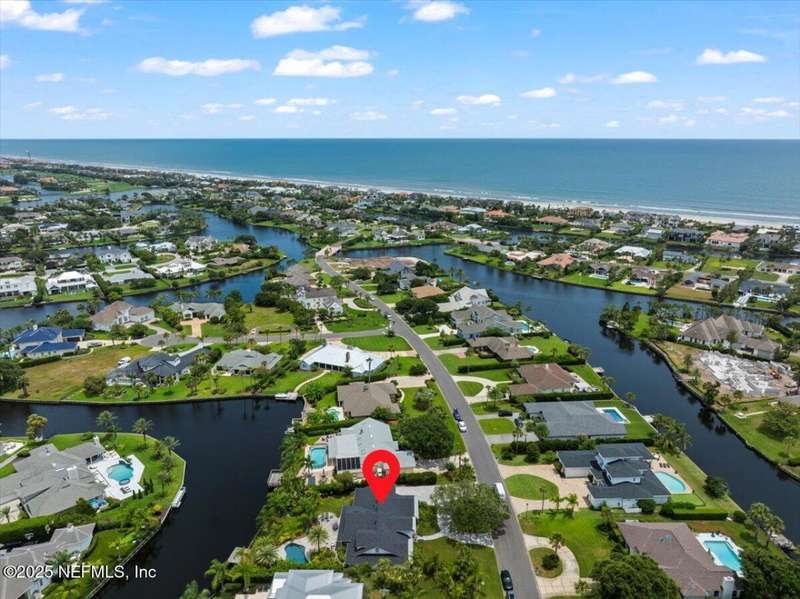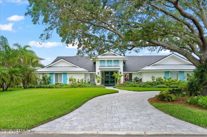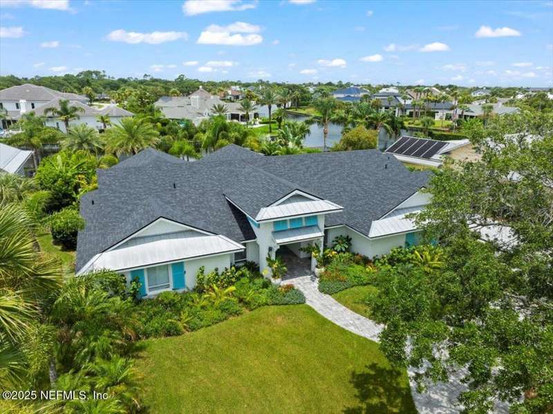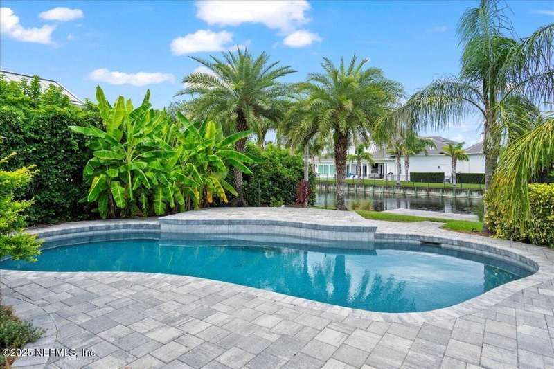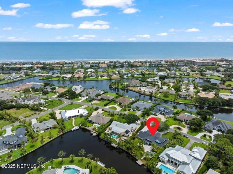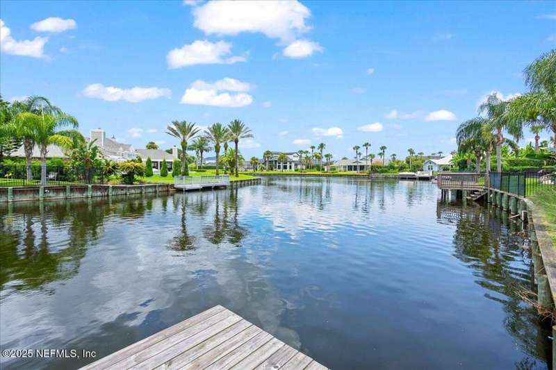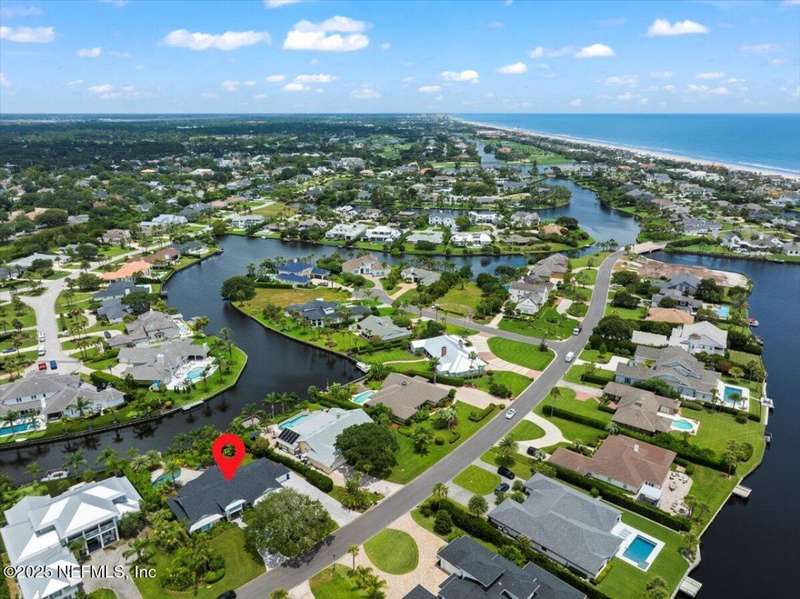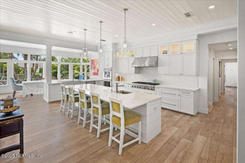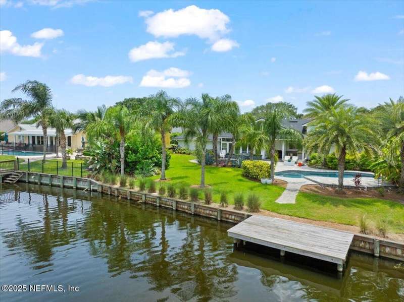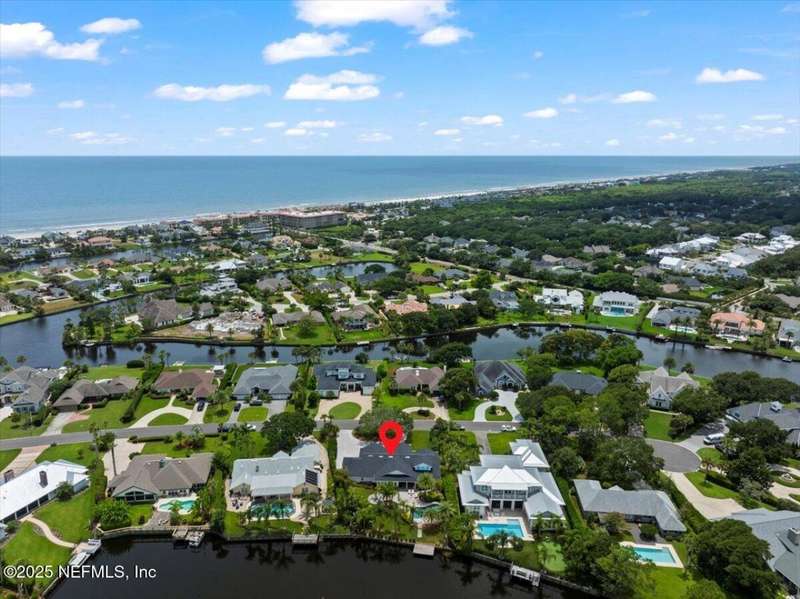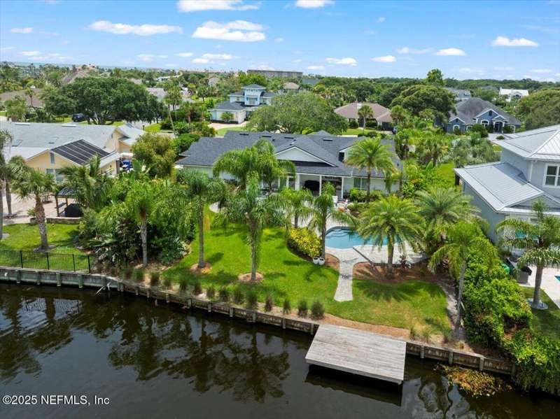 Live the ultimate Ponte Vedra Beach lifestyle in this beautifully updated pool home. Located on one of the most private cul de sac streets in Old Ponte Vedra, you are just a short walk to the beach or a quick bike ride to the Ponte Vedra Inn & Club or Lodge. This home features five bedrooms, four full bathrooms, and two half baths (including a pool bath) and offers thoughtful design and luxury finishes throughout. Step inside to find wood plank tile flooring and tongue and groove ceilings that add warmth and coastal charm to the main living areas. The amazing chef's kitchen is equipped with top-of-the-line Thermador appliances including a 48-inch gas cooktop with griddle, double ovens, separate built-in refrigerator and freezer, and an abundance of cabinetry and counter space. Adjacent to the kitchen is a custom wet bar with undercounter fridge drawers, a built-in nugget ice machine and a 98-bottle wine cooler. Also adjacent to the kitchen is the dining area which is surrounded by wrap-around windows overlooking the backyard's lush foliage and lagoon creating an incredible set up for entertaining family and friends. The large primary suite is a private retreat with separate his and hers walk-in closets and direct access to the laundry room for convenience. Two front bedrooms share a Jack and Jill bathroom, while a third downstairs bedroom features its own en suite bath. There is a spacious sitting area off the secondary bedrooms, ideal for a sitting room, study space or playroom. Upstairs, a private bedroom with en suite bath provides the perfect getaway for guests or older children. Additional features include a brand-new roof (April 2025) and a versatile mud room off the garage with ample storage that could easily be used as an office. Outside, enjoy your own tropical oasis with a pavered patio, large outdoor kitchen, beautiful landscaping, and a private dock overlooking the tranquil lagoon. Don't miss this rare opportunity to own a stunning home in one of Ponte Vedra Beach's most sought-after locations, just steps from the sand and waves.