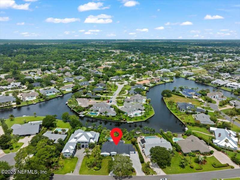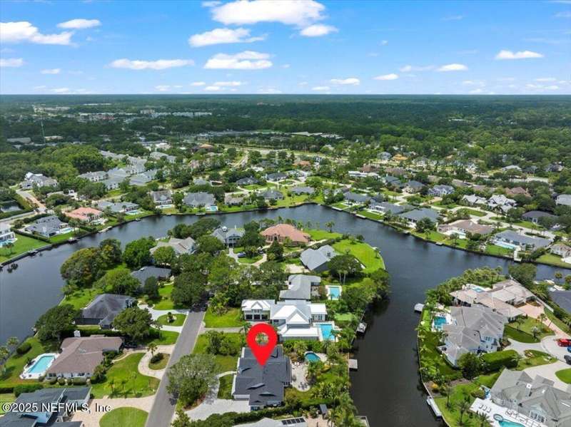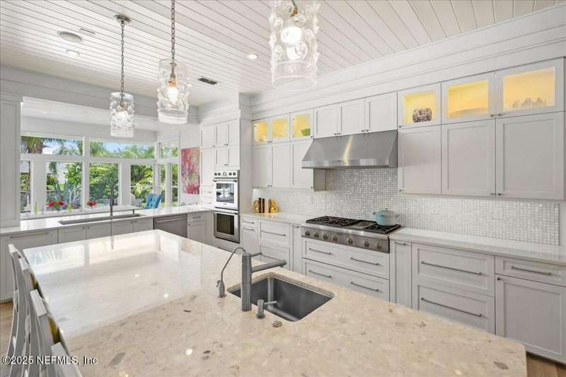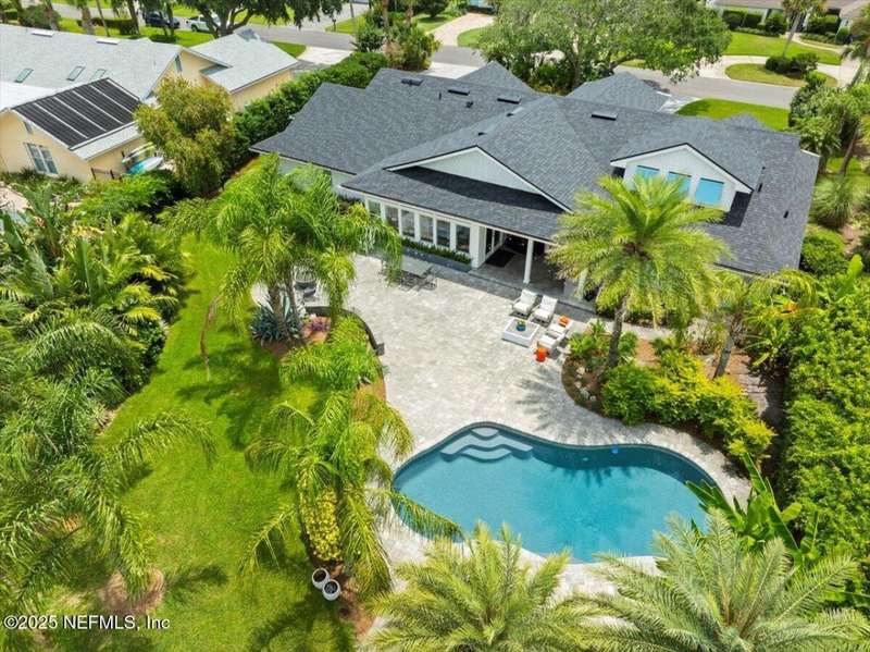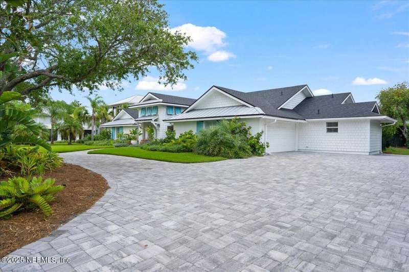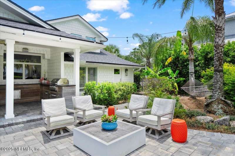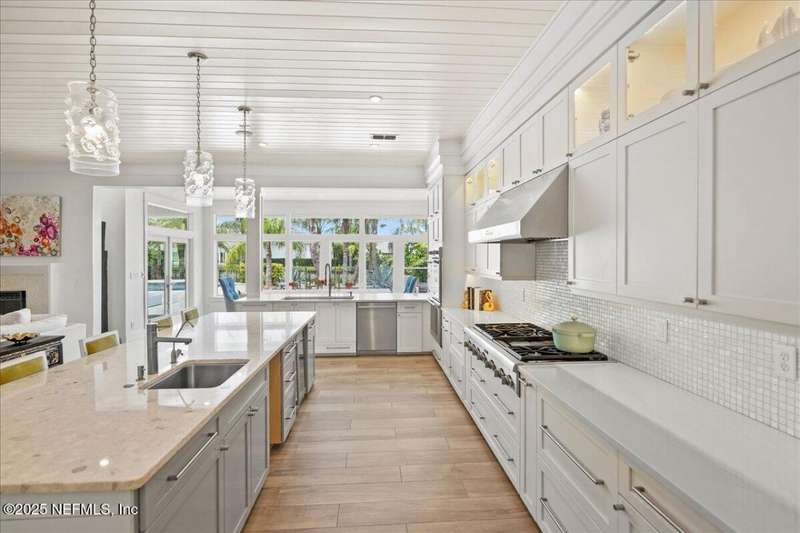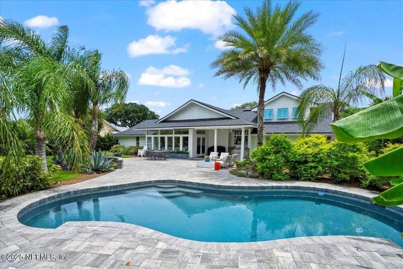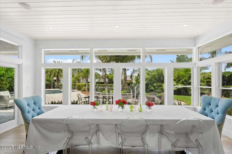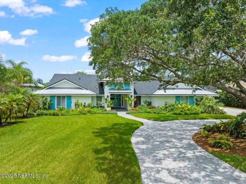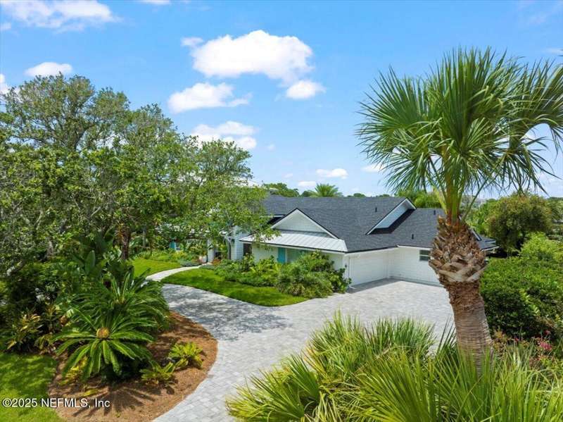 Live the ultimate Ponte Vedra Beach lifestyle in this beautifully updated pool home. Located on one of the most private cul de sac streets in Old Ponte Vedra, you are just a short walk to the beach or a quick bike ride to the Ponte Vedra Inn & Club or Lodge. This home features five bedrooms, four full bathrooms, and two half baths (including a pool bath) and offers thoughtful design and luxury finishes throughout. Step inside to find wood plank tile flooring and tongue and groove ceilings that add warmth and coastal charm to the main living areas. The amazing chef's kitchen is equipped with top-of-the-line Thermador appliances including a 48-inch gas cooktop with griddle, double ovens, separate built-in refrigerator and freezer, and an abundance of cabinetry and counter space. Adjacent to the kitchen is a custom wet bar with undercounter fridge drawers, a built-in nugget ice machine and a 98-bottle wine cooler. Also adjacent to the kitchen is the dining area which is surrounded by wrap-around windows overlooking the backyard's lush foliage and lagoon creating an incredible set up for entertaining family and friends. The large primary suite is a private retreat with separate his and hers walk-in closets and direct access to the laundry room for convenience. Two front bedrooms share a Jack and Jill bathroom, while a third downstairs bedroom features its own en suite bath. There is a spacious sitting area off the secondary bedrooms, ideal for a sitting room, study space or playroom. Upstairs, a private bedroom with en suite bath provides the perfect getaway for guests or older children. Additional features include a brand-new roof (April 2025) and a versatile mud room off the garage with ample storage that could easily be used as an office. Outside, enjoy your own tropical oasis with a pavered patio, large outdoor kitchen, beautiful landscaping, and a private dock overlooking the tranquil lagoon. Don't miss this rare opportunity to own a stunning home in one of Ponte Vedra Beach's most sought-after locations, just steps from the sand and waves.