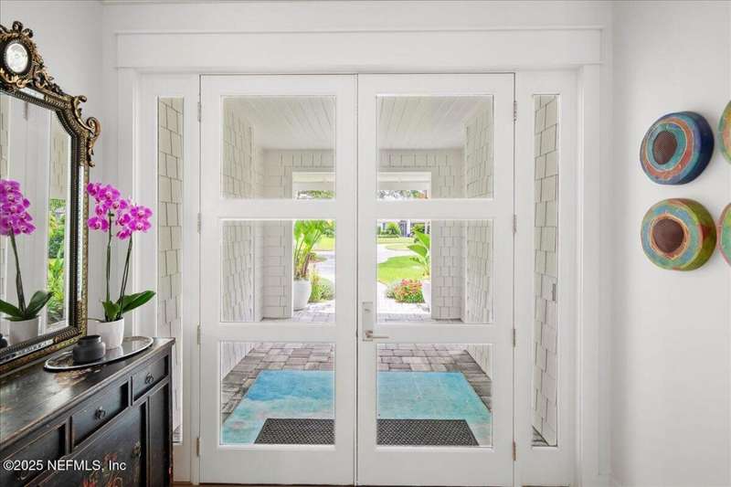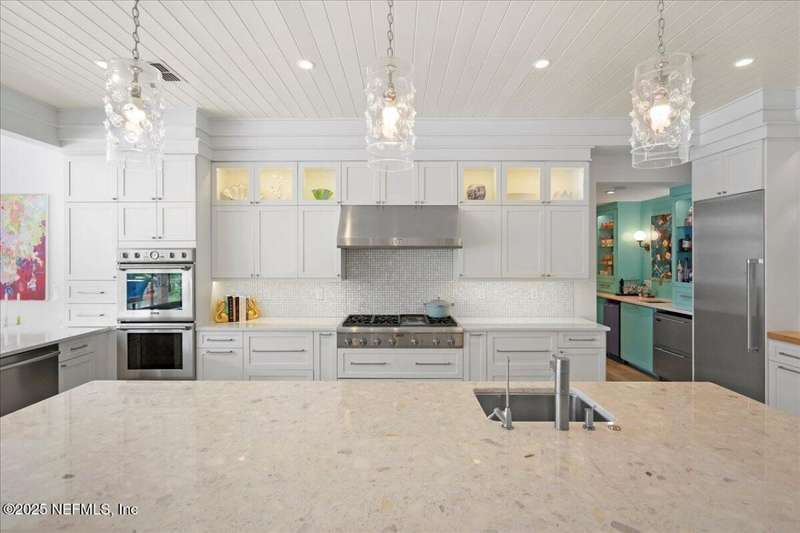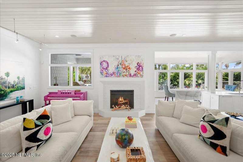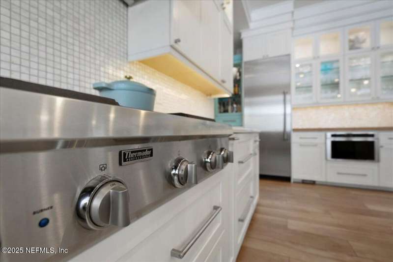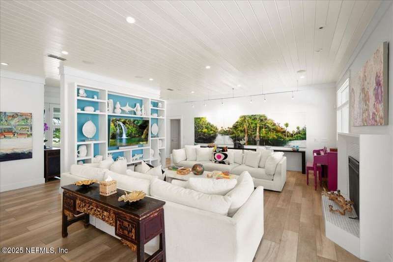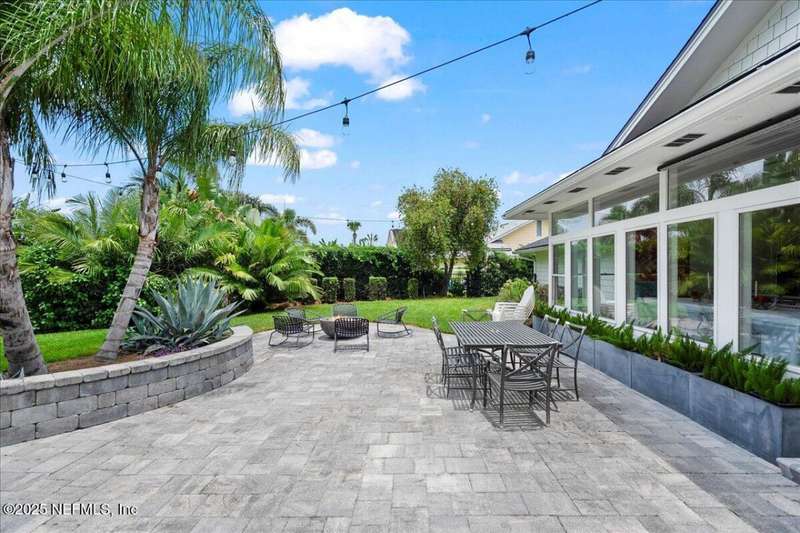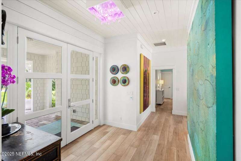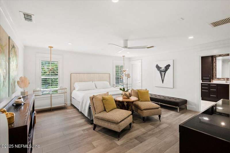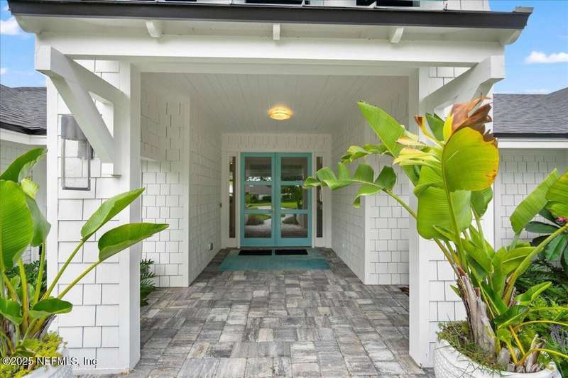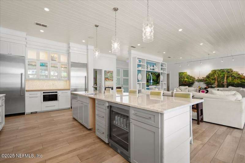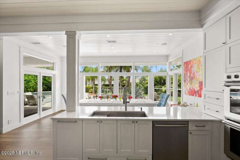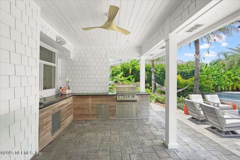 Live the ultimate Ponte Vedra Beach lifestyle in this beautifully updated pool home. Located on one of the most private cul de sac streets in Old Ponte Vedra, you are just a short walk to the beach or a quick bike ride to the Ponte Vedra Inn & Club or Lodge. This home features five bedrooms, four full bathrooms, and two half baths (including a pool bath) and offers thoughtful design and luxury finishes throughout. Step inside to find wood plank tile flooring and tongue and groove ceilings that add warmth and coastal charm to the main living areas. The amazing chef's kitchen is equipped with top-of-the-line Thermador appliances including a 48-inch gas cooktop with griddle, double ovens, separate built-in refrigerator and freezer, and an abundance of cabinetry and counter space. Adjacent to the kitchen is a custom wet bar with undercounter fridge drawers, a built-in nugget ice machine and a 98-bottle wine cooler. Also adjacent to the kitchen is the dining area which is surrounded by wrap-around windows overlooking the backyard's lush foliage and lagoon creating an incredible set up for entertaining family and friends. The large primary suite is a private retreat with separate his and hers walk-in closets and direct access to the laundry room for convenience. Two front bedrooms share a Jack and Jill bathroom, while a third downstairs bedroom features its own en suite bath. There is a spacious sitting area off the secondary bedrooms, ideal for a sitting room, study space or playroom. Upstairs, a private bedroom with en suite bath provides the perfect getaway for guests or older children. Additional features include a brand-new roof (April 2025) and a versatile mud room off the garage with ample storage that could easily be used as an office. Outside, enjoy your own tropical oasis with a pavered patio, large outdoor kitchen, beautiful landscaping, and a private dock overlooking the tranquil lagoon. Don't miss this rare opportunity to own a stunning home in one of Ponte Vedra Beach's most sought-after locations, just steps from the sand and waves.