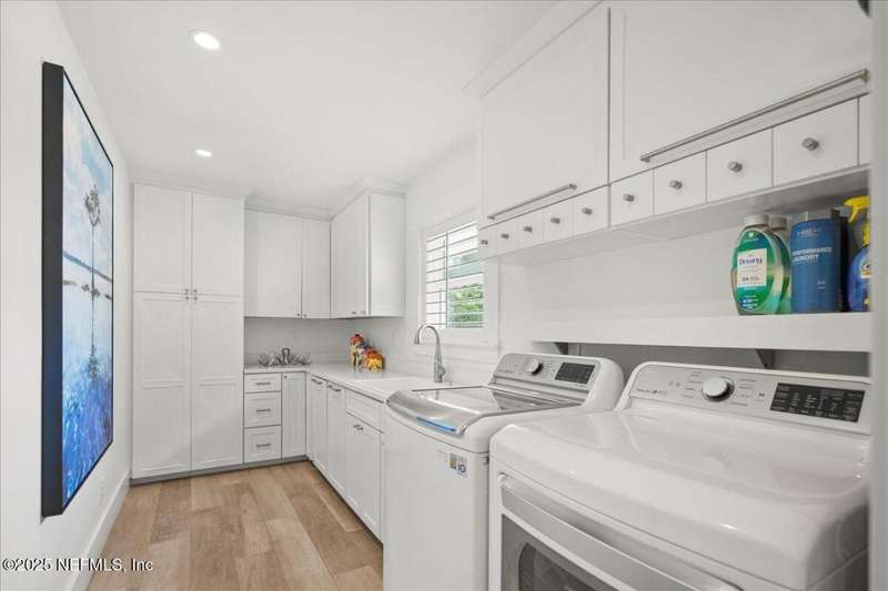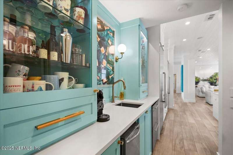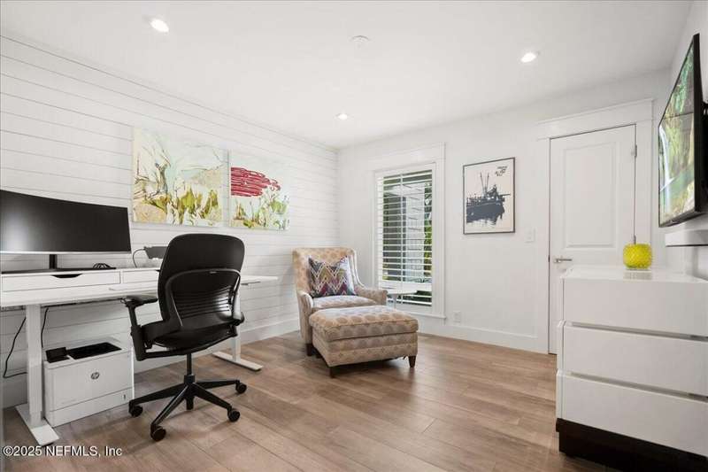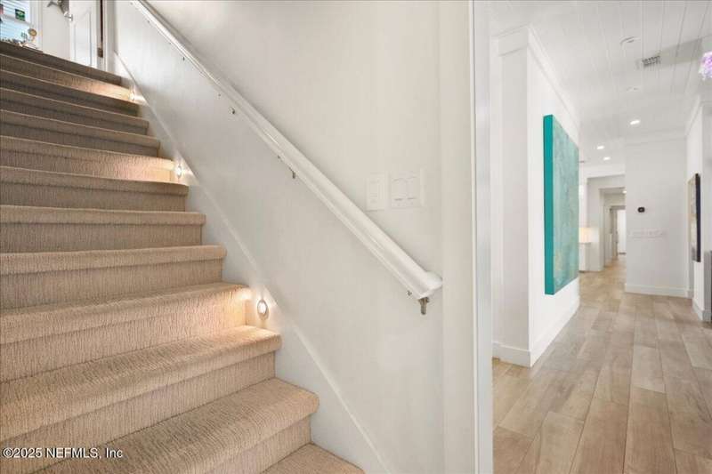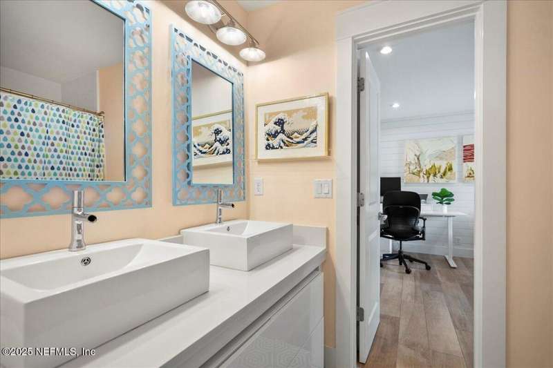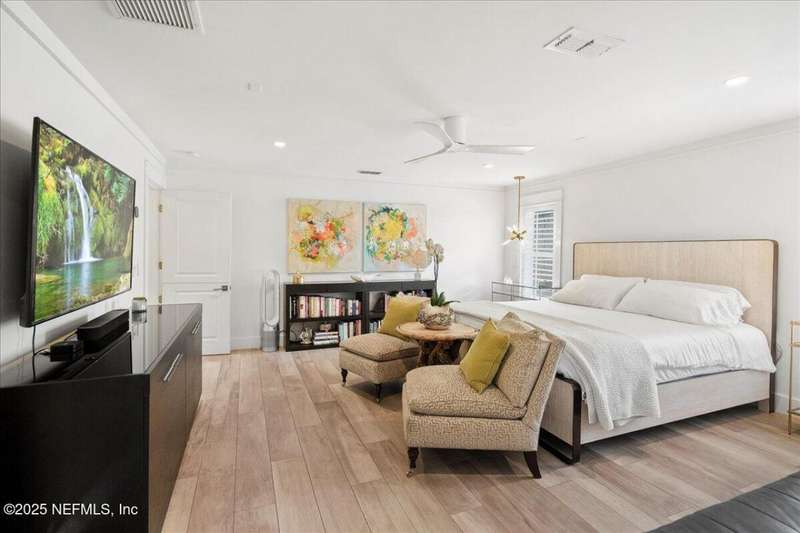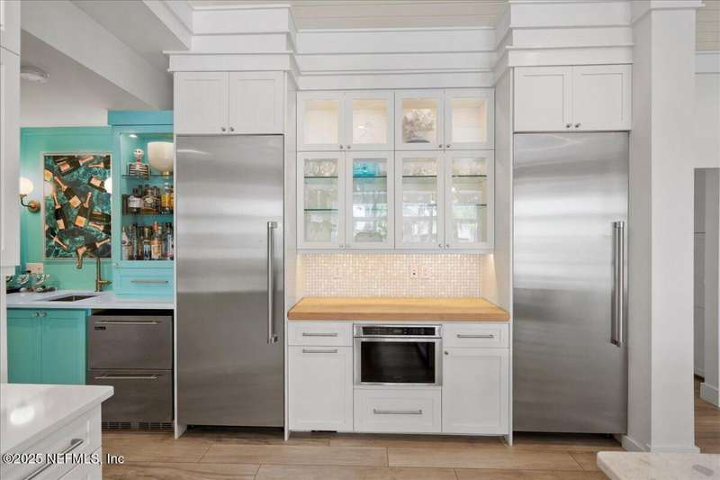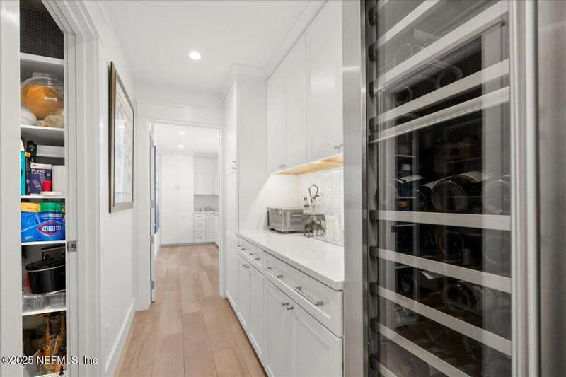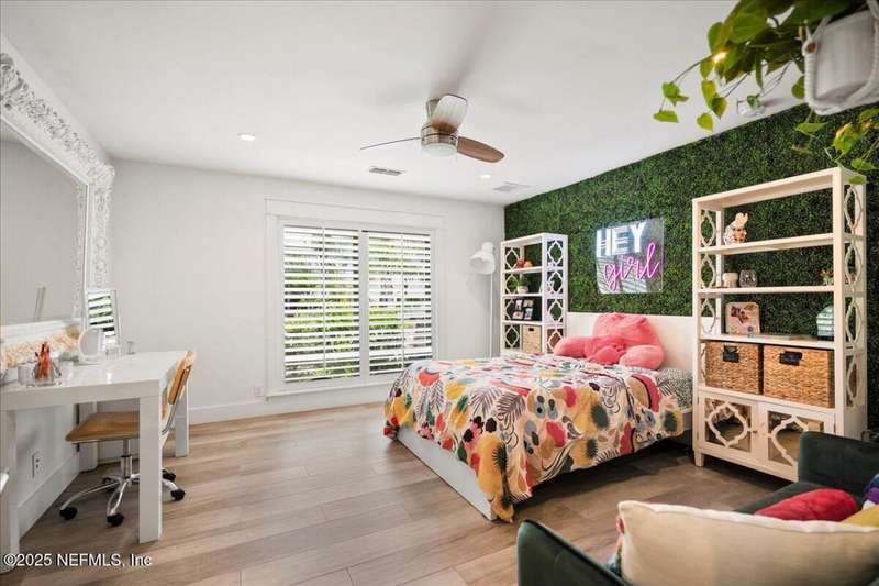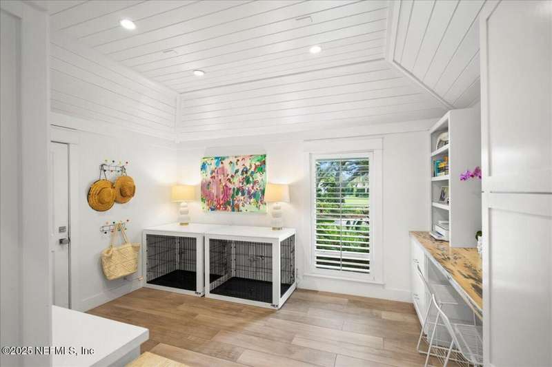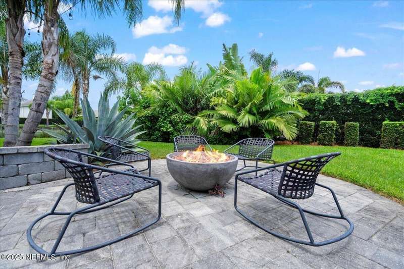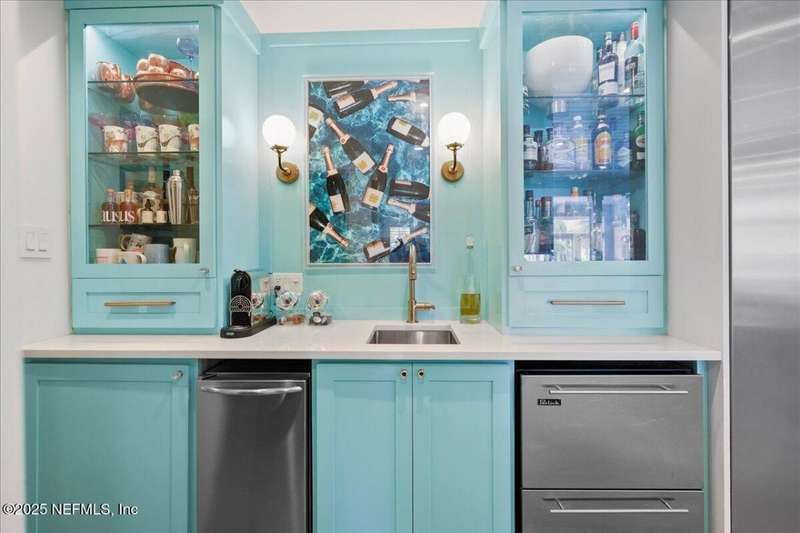 Live the ultimate Ponte Vedra Beach lifestyle in this beautifully updated pool home. Located on one of the most private cul de sac streets in Old Ponte Vedra, you are just a short walk to the beach or a quick bike ride to the Ponte Vedra Inn & Club or Lodge. This home features five bedrooms, four full bathrooms, and two half baths (including a pool bath) and offers thoughtful design and luxury finishes throughout. Step inside to find wood plank tile flooring and tongue and groove ceilings that add warmth and coastal charm to the main living areas. The amazing chef's kitchen is equipped with top-of-the-line Thermador appliances including a 48-inch gas cooktop with griddle, double ovens, separate built-in refrigerator and freezer, and an abundance of cabinetry and counter space. Adjacent to the kitchen is a custom wet bar with undercounter fridge drawers, a built-in nugget ice machine and a 98-bottle wine cooler. Also adjacent to the kitchen is the dining area which is surrounded by wrap-around windows overlooking the backyard's lush foliage and lagoon creating an incredible set up for entertaining family and friends. The large primary suite is a private retreat with separate his and hers walk-in closets and direct access to the laundry room for convenience. Two front bedrooms share a Jack and Jill bathroom, while a third downstairs bedroom features its own en suite bath. There is a spacious sitting area off the secondary bedrooms, ideal for a sitting room, study space or playroom. Upstairs, a private bedroom with en suite bath provides the perfect getaway for guests or older children. Additional features include a brand-new roof (April 2025) and a versatile mud room off the garage with ample storage that could easily be used as an office. Outside, enjoy your own tropical oasis with a pavered patio, large outdoor kitchen, beautiful landscaping, and a private dock overlooking the tranquil lagoon. Don't miss this rare opportunity to own a stunning home in one of Ponte Vedra Beach's most sought-after locations, just steps from the sand and waves.