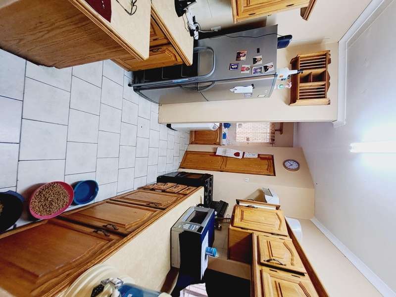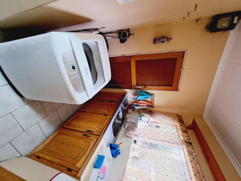 The kitchen has a area for the laundry, with a door leading out to the back yard.