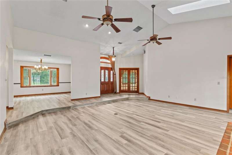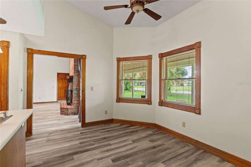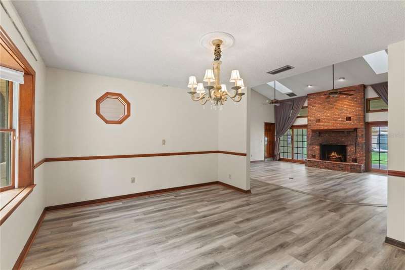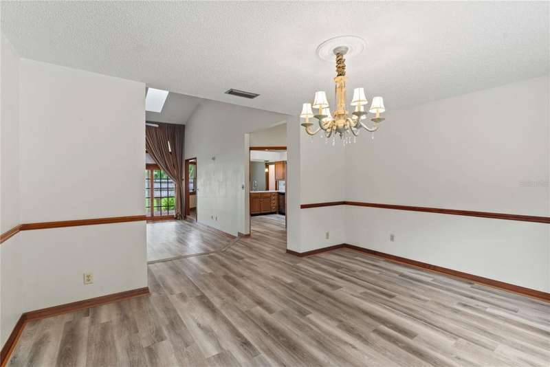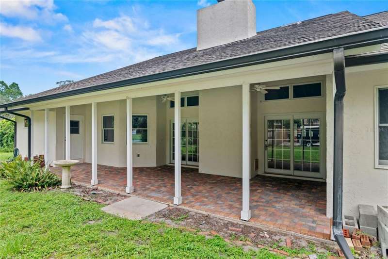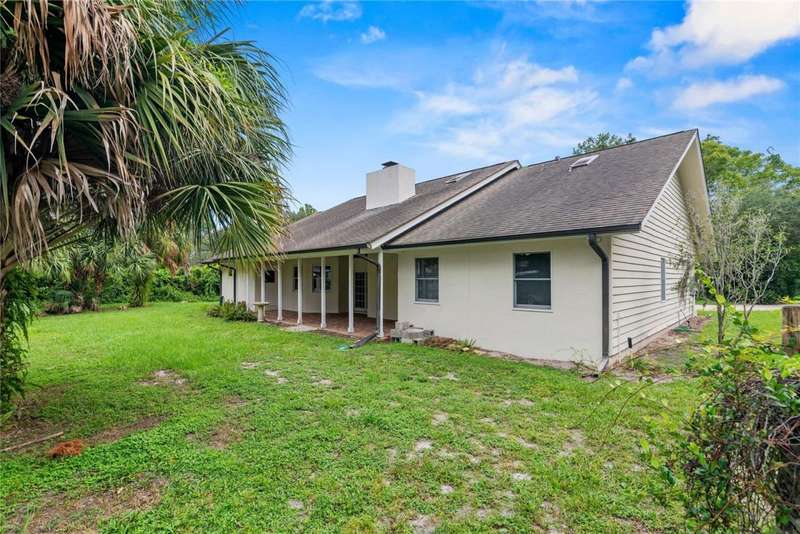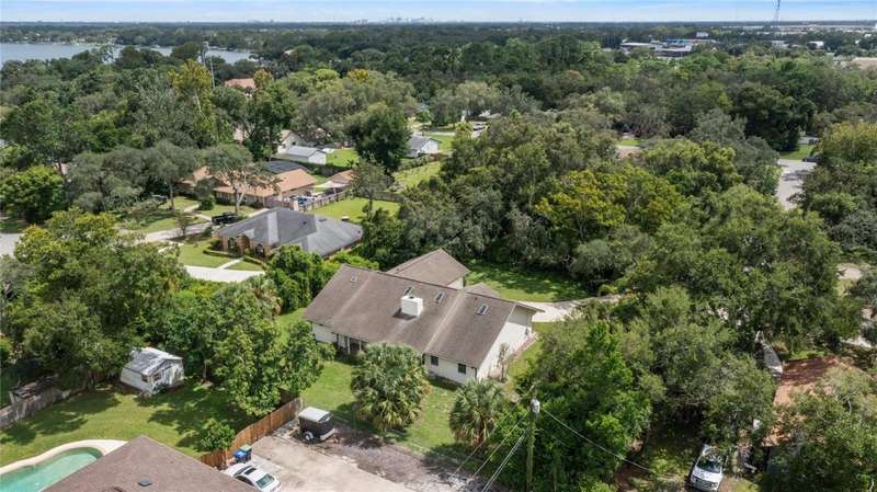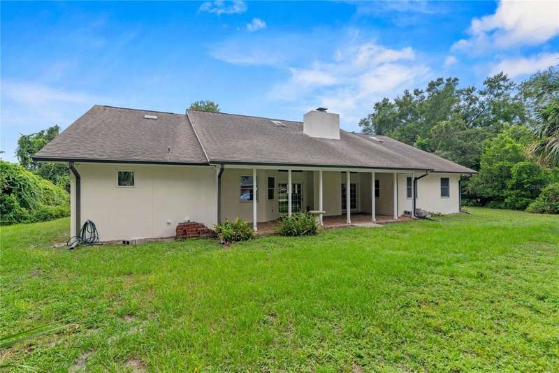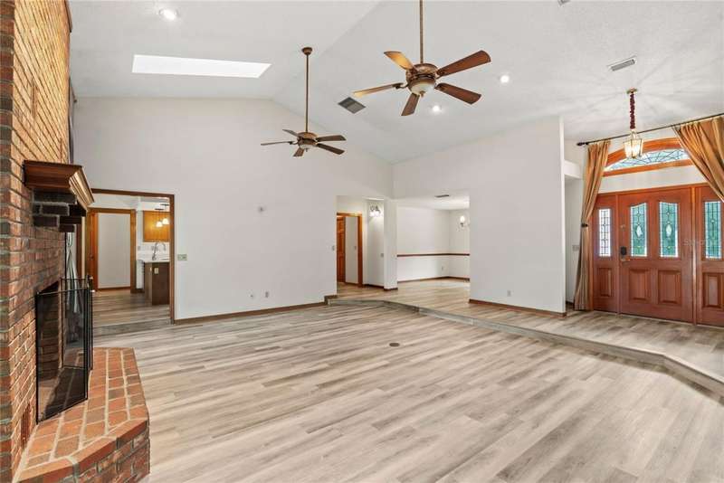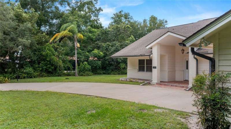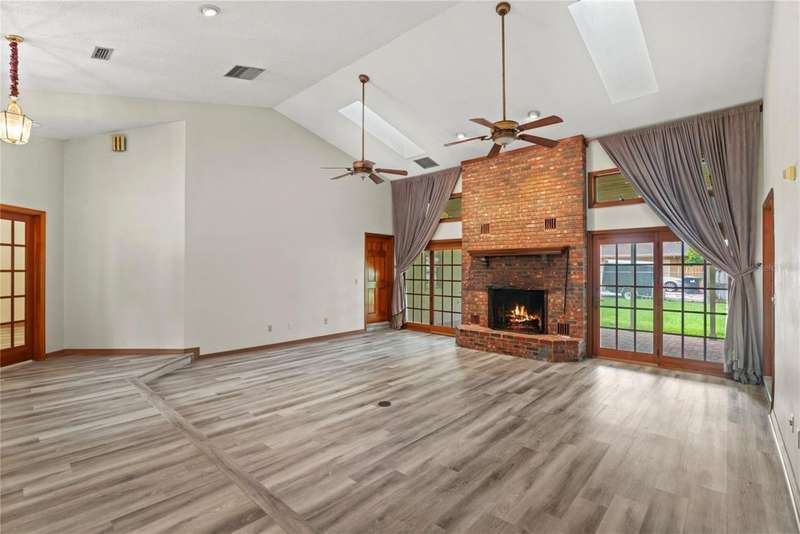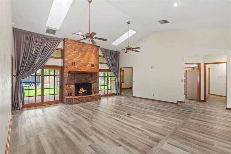 Under contract-accepting backup offers. Charming 3 bed/3 bath home in Apopka's Greenacres Estates community! This home features wood trim and doors that adds to the charm, sits on a large, 0.50 acre lot on a cul-de-sac, has an open floor plan, oversized 2 car garage, vaulted ceilings and NO HOA! This home features laminate flooring throughout the living areas with ceramic tile in the bathrooms - no carpet! When you walk in, the foyer will welcome you inside with a sunken living room featuring vaulted ceilings and skylights. The office will be on your left with glass French doors for privacy and has a closet so it can be used as a bedroom, if needed. The formal dining room is on the right, on your way to the kitchen that features newer stainless steel appliances with a wi-fi enabled fridge, wood cabinets with hardware, corian counters, a closet pantry, breakfast bar and dinette with a window overlooking the backyard. The living room features a wood burning, brick fireplace, two French doors on either side of the fireplace lead to the covered patio. What a great space to enjoy your morning coffee or unwind at the end of a long day! The owner's suite is off the living room, has lots of windows that let in a lot of natural light. The en-suite bath features a two sink vanity, wood cabinets, a ceramic tiled walk-in shower, separate garden tub and water closet. The guest bedrooms are on the other side of the home for privacy. Each bedroom has its own bathroom for convenience. One guest bath has a taller toilet. The laundry room leads to the oversized 2-car garage that is wired for an exterior generator. This home has been lovingly maintained. Additional updates include newer kitchen appliances and remote fans. Centrally located to major roads and highways, yet you can experience quiet country living with great shopping and dining close by in Altamonte Springs. Make this home yours today!