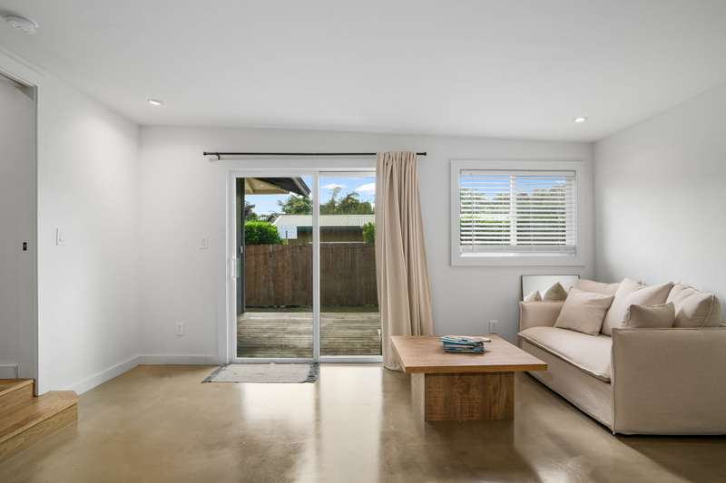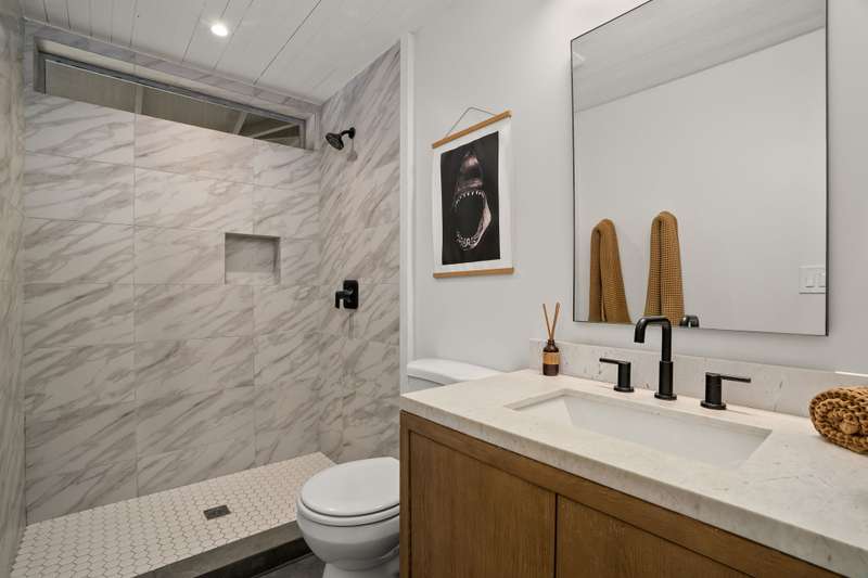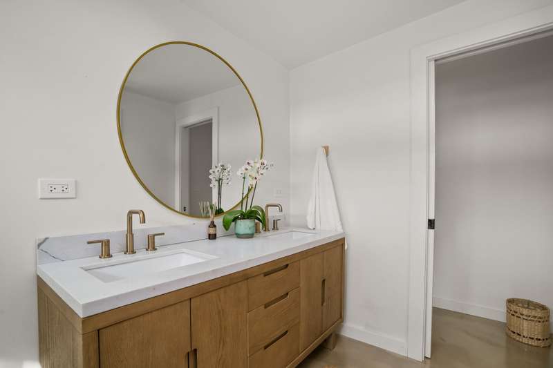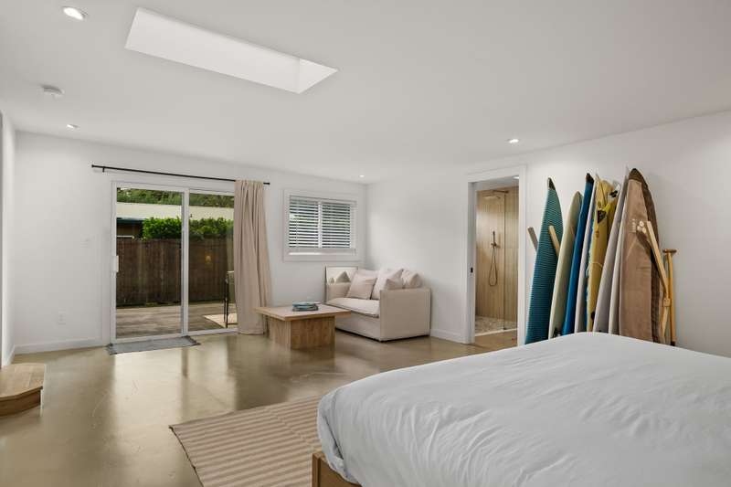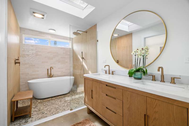 The spacious primary suite has polished concrete floors, a sitting area that leads to an outdoor lanai and a new bathroom with dual-sink vanity, walk-in shower, soaking tub, and Delta bronze fixtures with a rain shower head.