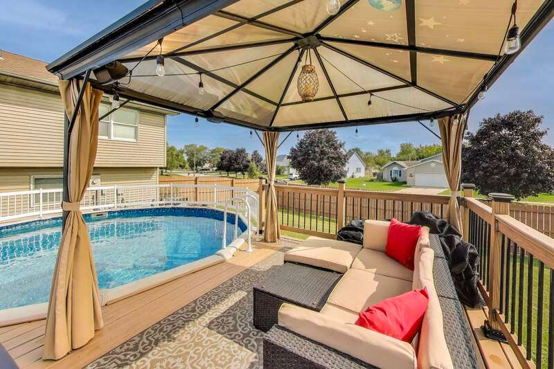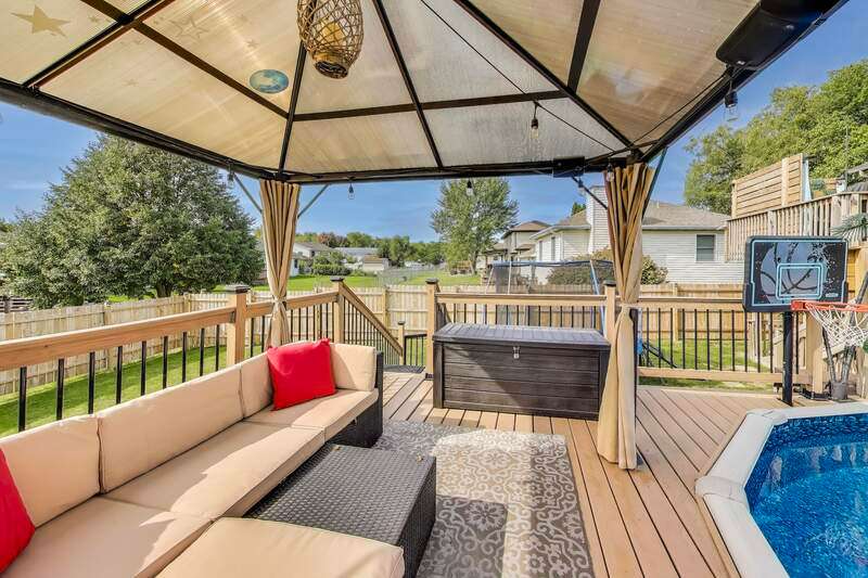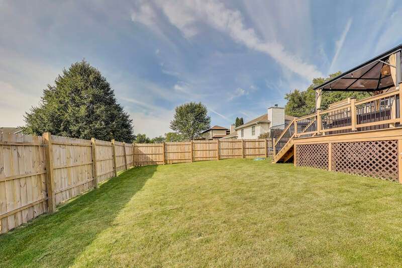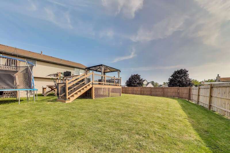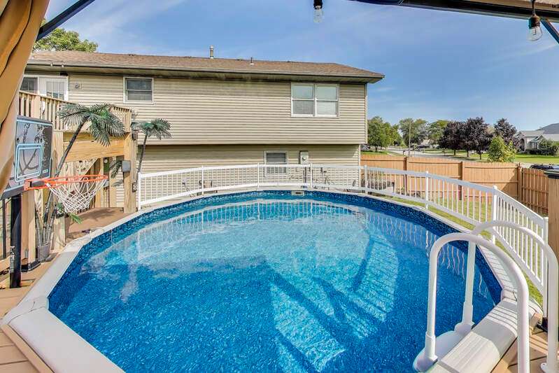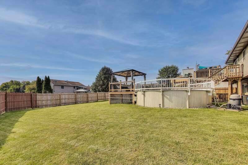 MOTIVATED SELLER! Very well-maintained and move-in ready bi-level home situated on a spacious corner lot! Inside, you'll find an updated kitchen featuring stone countertops, a tile backsplash, and stainless steel appliances that remain with the home. The adjoining dining and living rooms boast high ceilings, newer light fixtures, and plenty of room for gatherings. From the dining area, step onto the newer 12x12 deck and enjoy morning coffee overlooking the backyard oasis. The newly added fenced-in backyard is designed for entertaining and relaxation, complete with a 3-year-old above-ground pool with a swim-up tiki bar, gazebo, motion-activated hardwired lighting, and even a trampoline that can stay. Upstairs, the spacious primary suite offers an updated private bath, while two additional bedrooms and a full hallway bath complete the level. The lower level features a large second living area with a stylish bar, recessed lighting, a 3/4 bath, and a laundry room with a utility sink. Additional highlights include ceiling fans throughout, Xfinity WiFi connectivity, and programmable lighting. This home is full of charm and ready for its next owner--don't miss your chance to call it yours!