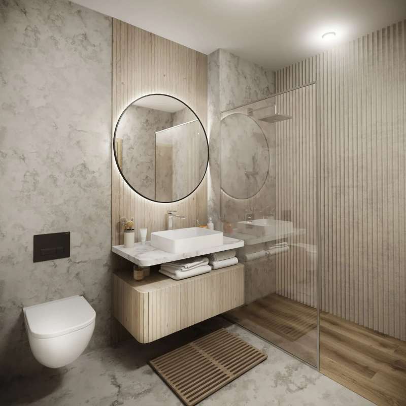 Among the standard equipment, we can mention, for example: windows with insulating triple glazing, multi-layer wooden floors, large-format tiles, frameless interior doors, premium sanitaryware and faucets, underfloor heating, and security entrance doors.