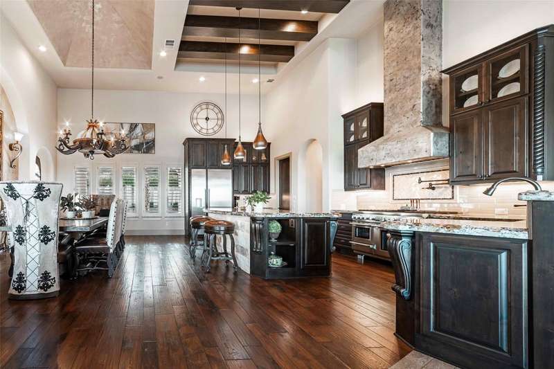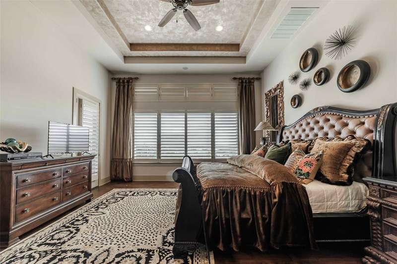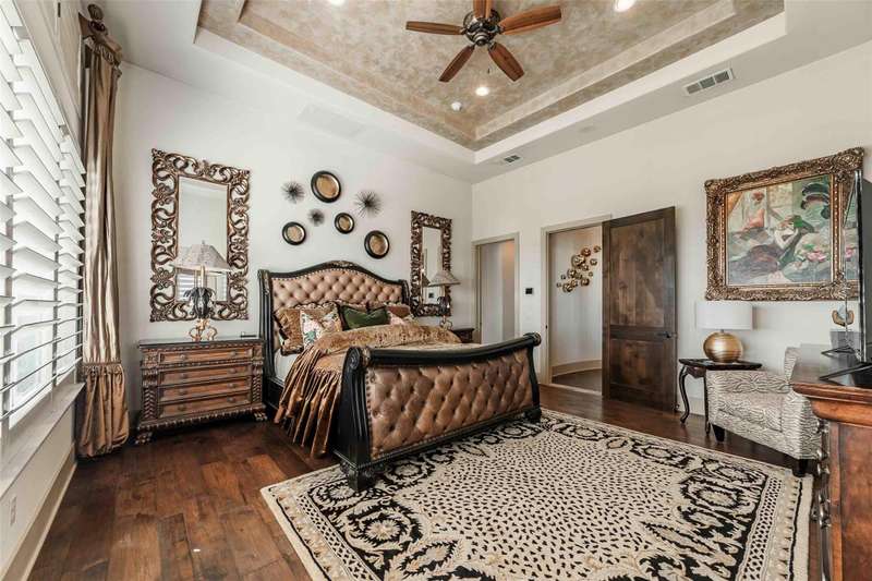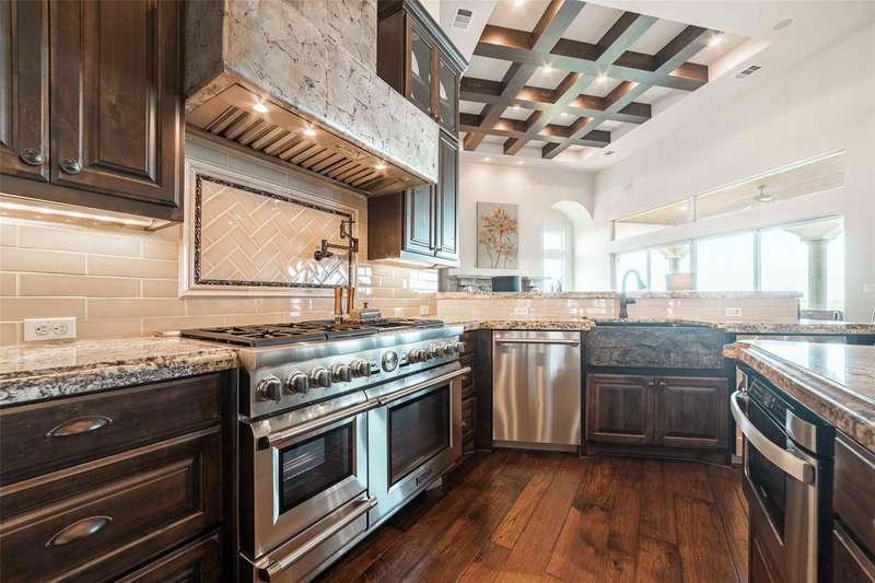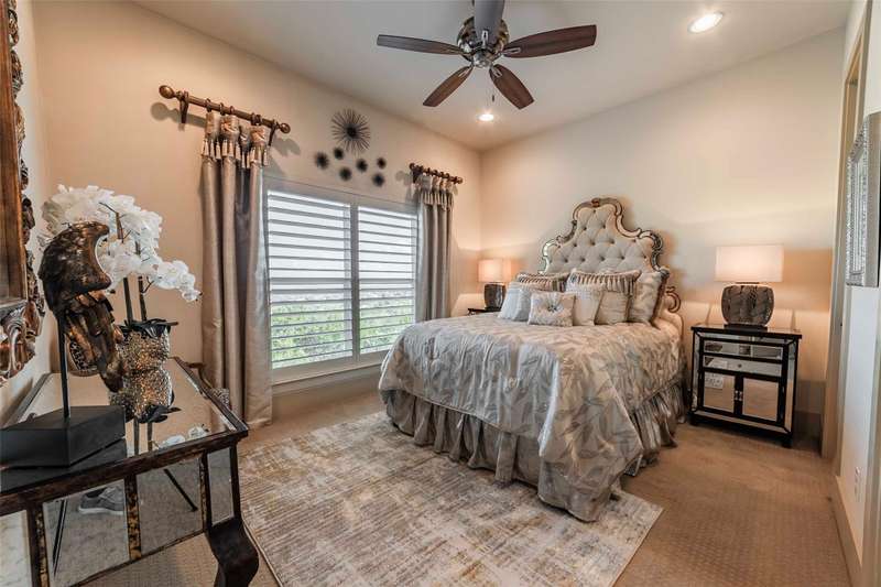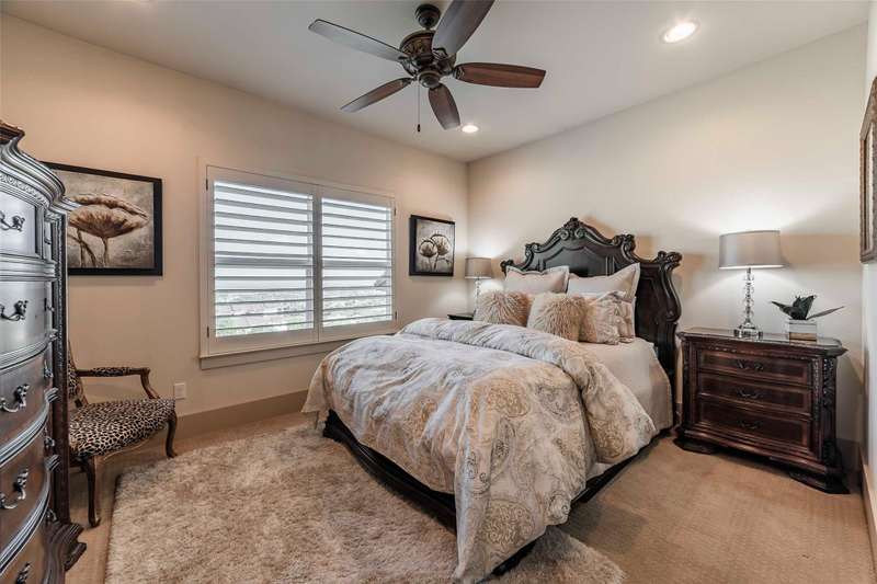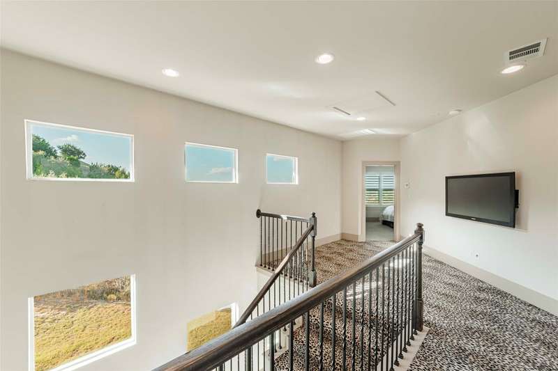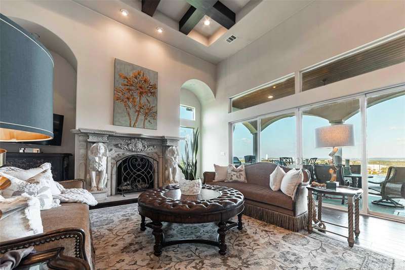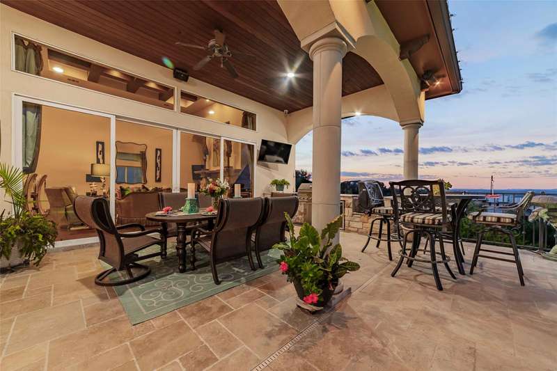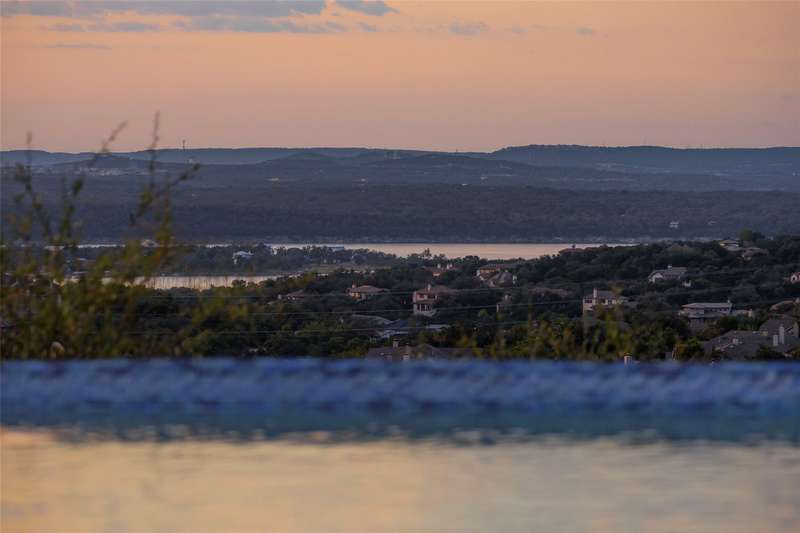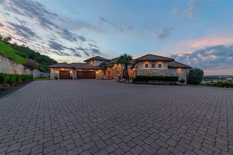 he signature showcase of Bella Montagna--this commanding hilltop estate blends architectural mastery with endless Lake Travis + Hill Country vistas, delivering an exceptional equilibrium of privacy, presence, and enduring style. A gated approach leads you to an expansive motor court accommodating 15+ cars, immediately signaling the scale and intention of the home. Through double Cantera iron doors, a hand-painted barrel ceiling foyer sets the tone as it frames unobstructed panoramic views. Inside, elevated craftsmanship is ever-present--towering ceilings, exposed beams, and carefully curated architectural finishes throughout. Primarily single-level living, every bedroom features an en-suite bath + walk-in closet, with an upper wing providing two additional guest suites, a living room, and its own dedicated HVAC. The kitchen/dining/family core centers on an oversized double-ogee granite island--surrounded by chef-caliber features: double dishwashers, six-burner cooktop w/ griddle, convection + steam ovens, warming drawer, pot filler, built-in refrigerator, walk-in pantry, copper prep sink, and extensive custom cabinetry. A Cantera-door wine room with bar + wine refrigerator completes the entertainer's program. The owner's retreat opens onto approx. 1,000 sq ft of covered outdoor living with summer kitchen, hot tub, and resort-style pool positioned to capture year-round breezes. The suite also includes an exercise alcove overlooking the views, a custom stone soaking tub, and a triple-sized designer closet. Additional features include 3 oversized garage bays w/ storage + attic access, granite window sills, a custom-carved stone fireplace, plantation shutters, and manicured landscape across 1.3 acres. With a low tax rate, low HOA, and protected unobstructed vistas from every room--this home stands as one of Lakeway's most iconic and admired hilltop estates in Bella Montagna.