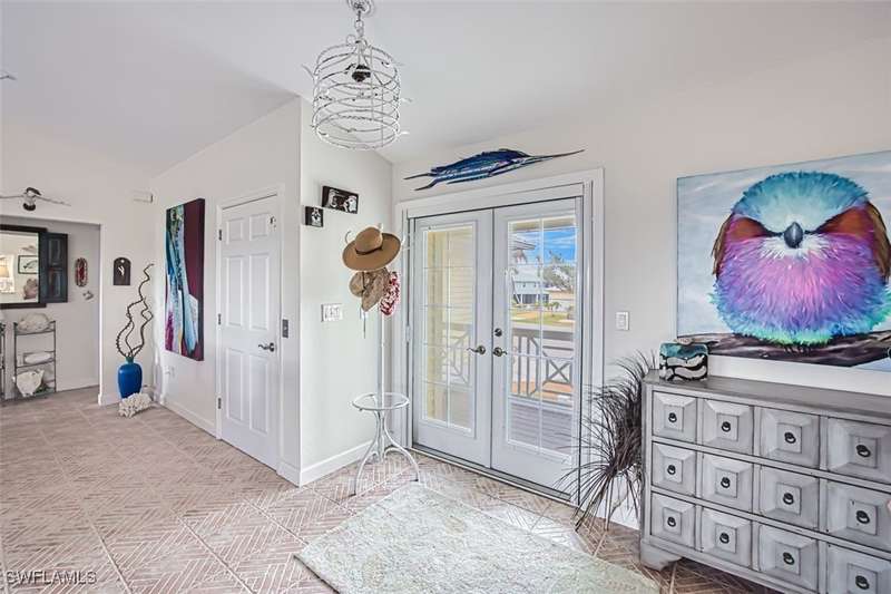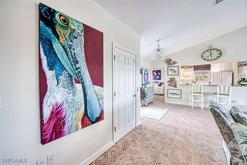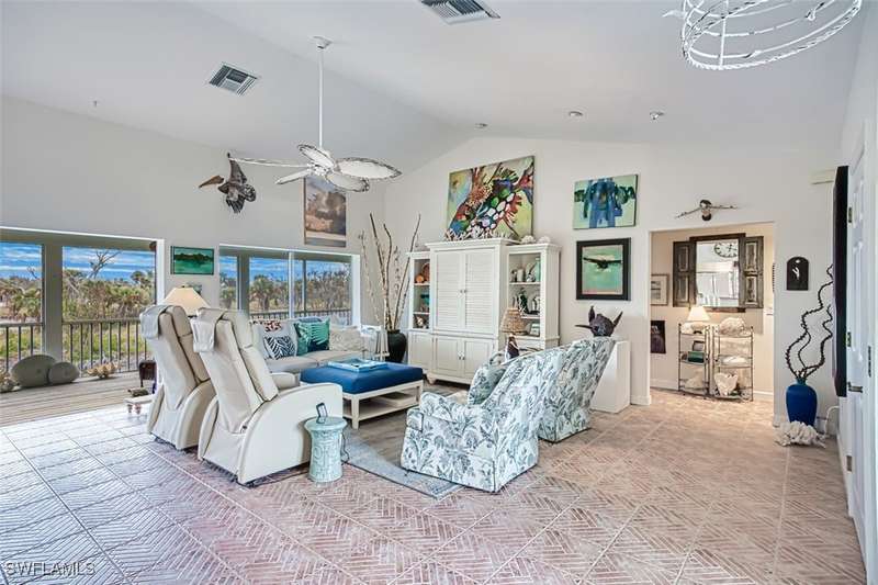 Near beach elevated home overlooking a private lake which the wildlife love to call home.. 2 bedroom 2 bath with den and ELEVATOR. Great room with volumn ceilings and unique tile flooring opens to kitchen and dining room. Sliding glass doors open to a screened lanai that extends across the entire back of home and makes indoor outdoor dining delightful.. Large garage with generous storage. Come and enjoy this lovely creative home. Being sold furnished with exceptions. You will love it!!