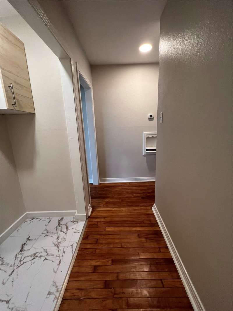 Lovely Duplex on corner lot. Hard-to-beat Monticello location between University Dr and Bailey Ave. Walk to UNT Health Science Center, restaurants, museums, shopping, and 7th St corridor. Remodeled with hardwood floors, updated kitchen and bath, newer appliances, new cabinets, and new fixtures. Full size washer and dryer utility closet. Decorative fireplace in Living Area. Open concept and breakfast bar in addition to dining area. Detached garage with garage opener. Wonderful natural light. Covered front porch. Landlord responsible for lawn maintenance. Up to two pets allowed. Ready for new tenant right now!