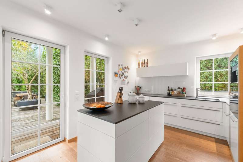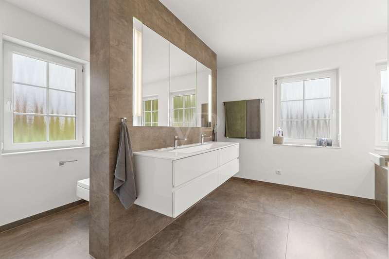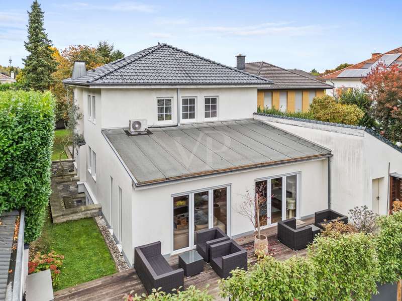VON POLL IMMOBILIEN presents this detached, high-quality detached house with a classic hipped roof, which was built in 1997 on a plot of approx. 614 m² and is in an extremely well-kept condition. With a generous living space of approx. 231.7 m² and a total of seven rooms, the property offers a variety of uses for families and discerning couples who value a high-quality living environment. The floor plan impresses with its clear, well thought-out layout over three levels: The open-plan living and dining area forms the heart of the house. An extension built in 2006 has created a spacious and prestigious living area with a fireplace of approx. 78.6 m². Floor-to-ceiling windows provide plenty of natural light and offer direct access to the two spacious terraces and the balcony on the upper floor. Here you can spend relaxing hours outdoors or enjoy social gatherings with family and friends. The custom-made eat-in kitchen from 2015 is another highlight. It combines an exclusive look with a high level of functionality and, with its seamless transition to the adjoining dining area, leaves nothing to be desired in terms of modern living comfort. Culinary ideas can be realized here. A total of three generously proportioned bedrooms are available, offering flexible layout options for family, guests or home offices. Two elegantly appointed bathrooms allow for comfortable living. There is also a separate guest WC, which is particularly useful when guests are visiting. High-quality materials characterize the ambience throughout the house: the parquet, marble and tiled flooring was renewed in 2013 and underlines the high standard of the furnishings. Electric shutters offer additional comfort and ensure pleasant temperature regulation as well as increased security. The property has been continuously modernized technically. The gas central heating system was replaced in 2015, ensuring efficient and reliable heating. The entire building is in a very well-kept condition - move in and feel good is the motto here. No wishes remain unfulfilled when it comes to storage options: In addition to a parking space in the garage, there are two further outdoor parking spaces, which make it easy to park several vehicles. The offer is rounded off by the quiet yet central location, which offers excellent connections to infrastructure, shopping facilities and schools. The private outdoor areas open up a wide range of design options - garden lovers can realize their ideas here. This detached house combines generous space with contemporary furnishings and attractive architecture. Arrange a viewing appointment and see the special character of this offer for yourself.