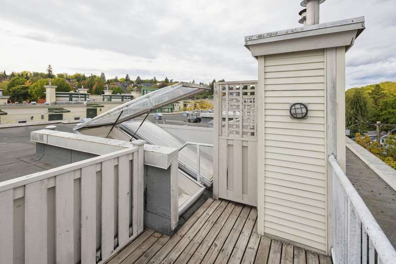 Welcome to The Folkstone a charming 2-bedroom, 2-bathroom townhome situated on the QUIET side of the building. Featuring both north & south facing windows, providing natural light. The reverse floorplan offers a living room w/gas fireplace & balcony, the dining area & kitchen, with a sunny South-facing breakfast nook/home office. Enjoy a rooftop deck with 360°city & mountain views. Primary suite w/a lovely bay window & an ensuite, & S-facing bedrm w/French doors & an adjacent full bathrm. Unbeatable location w/convenient transit access to UBC & downtown. Everything is closeby: Pacific Spirit Park, excellent schools, UBC Golf Course, hospital, restaurants, cafés, shopping & Jericho Beach. Building repiped in 2019. Quick completion ok. Pet & rental friendly. Open Houses Sat&Sun 2-4pm.