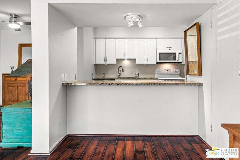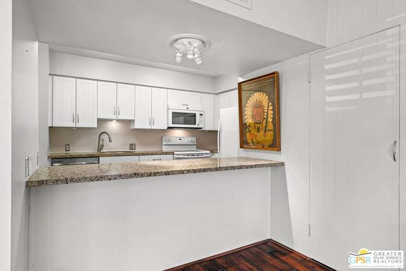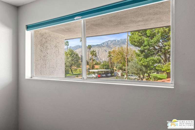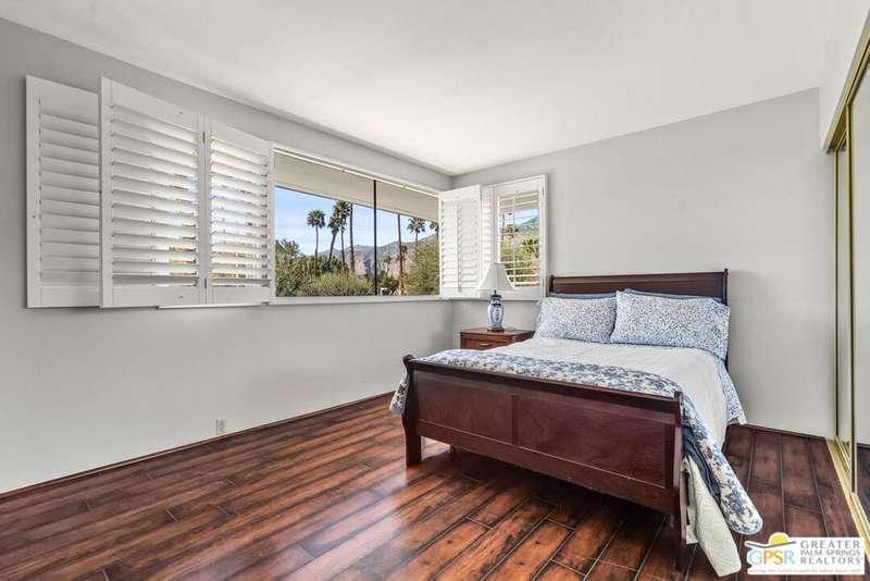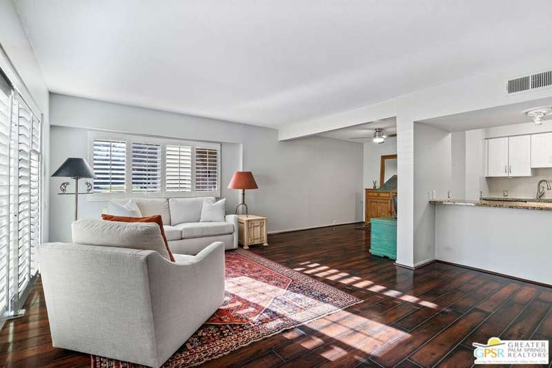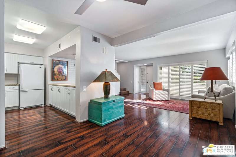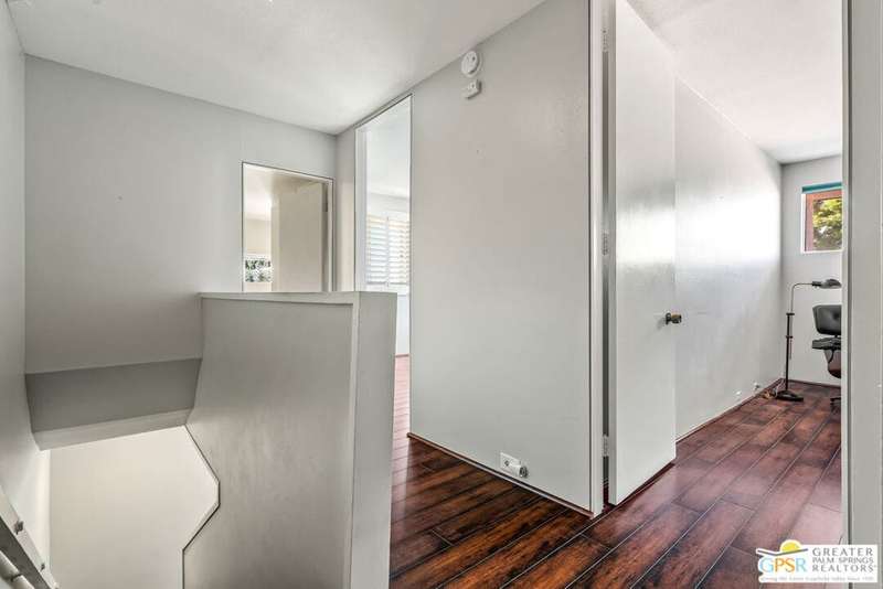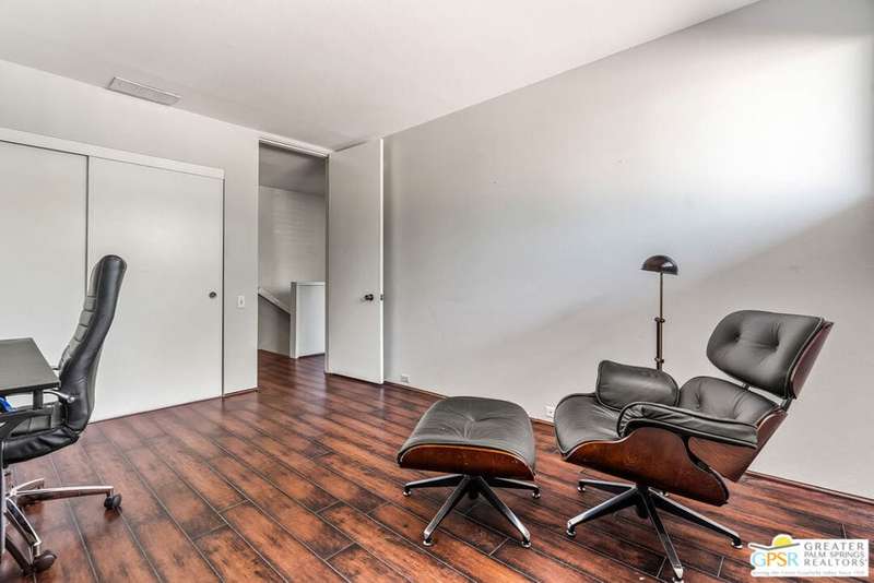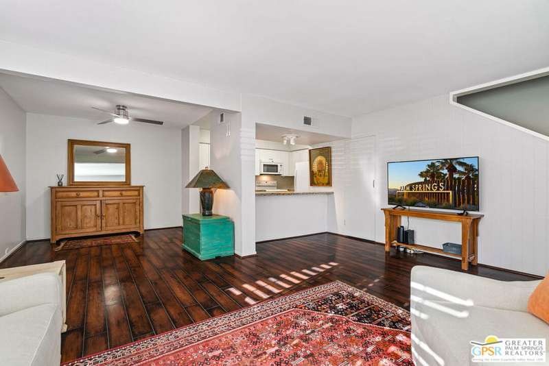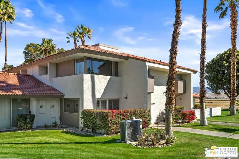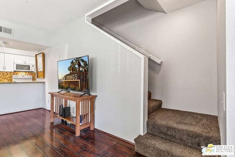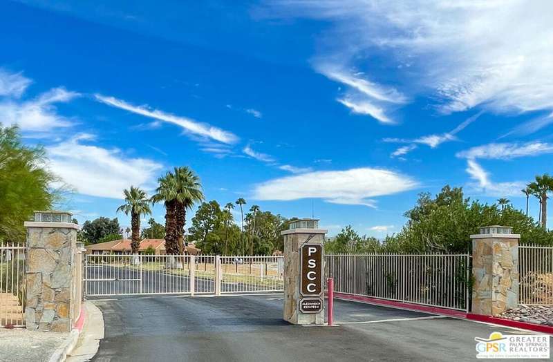 Welcome to Palm Springs Country Club Phase One, a hidden gem designed by William Cody AIA, one of Palm Springs' best-kept secrets. This architectural townhouse-style condo features 2 bedrooms, 1.5 baths, an updated kitchen, and an updated powder room downstairs. It offers laminate flooring throughout, except for the staircase, and stunning views of the San Jacinto mountains from both the living room and bedrooms. The HOA fees include basic cable and internet. The property is conveniently located near unassigned, uncovered parking. Fee simple land.