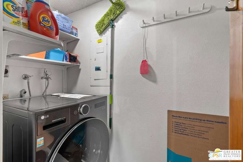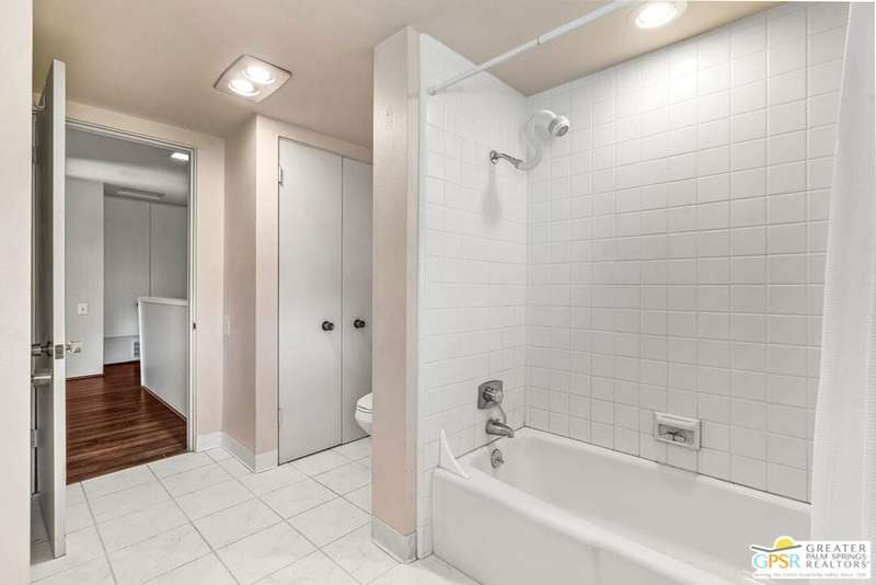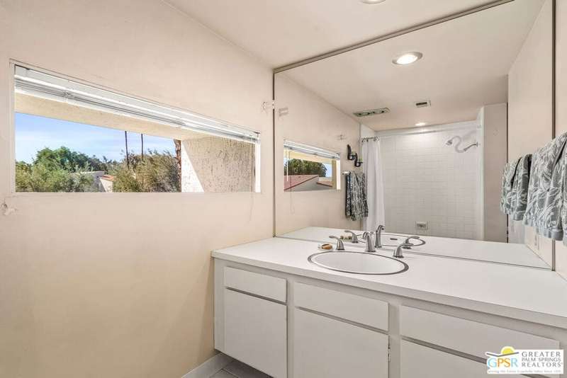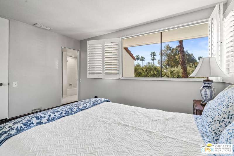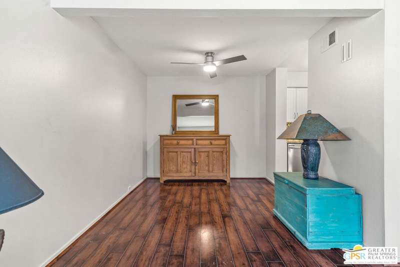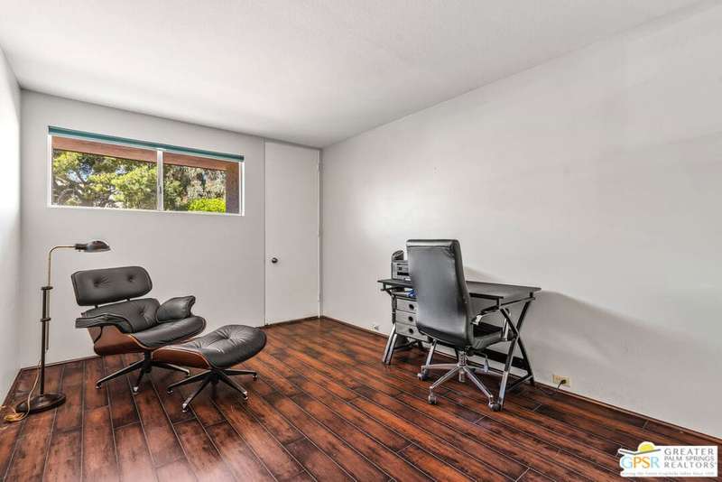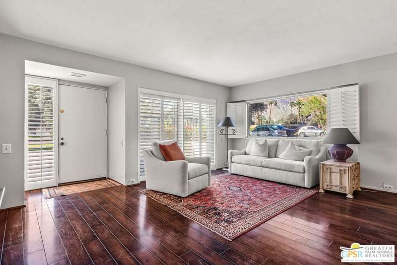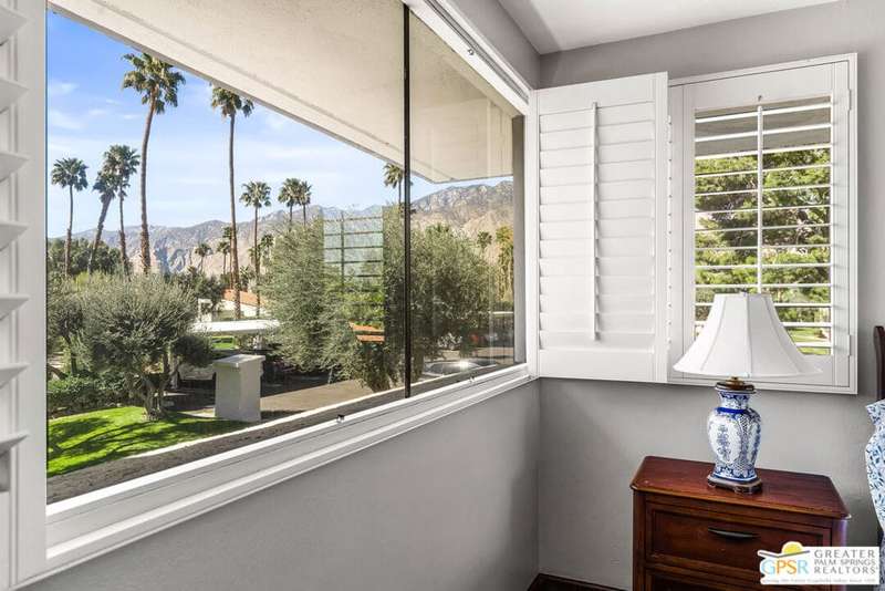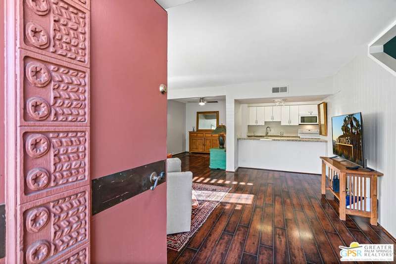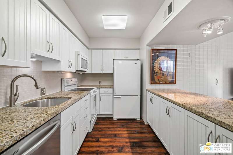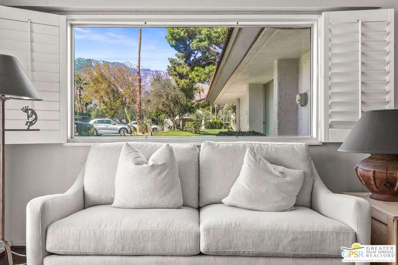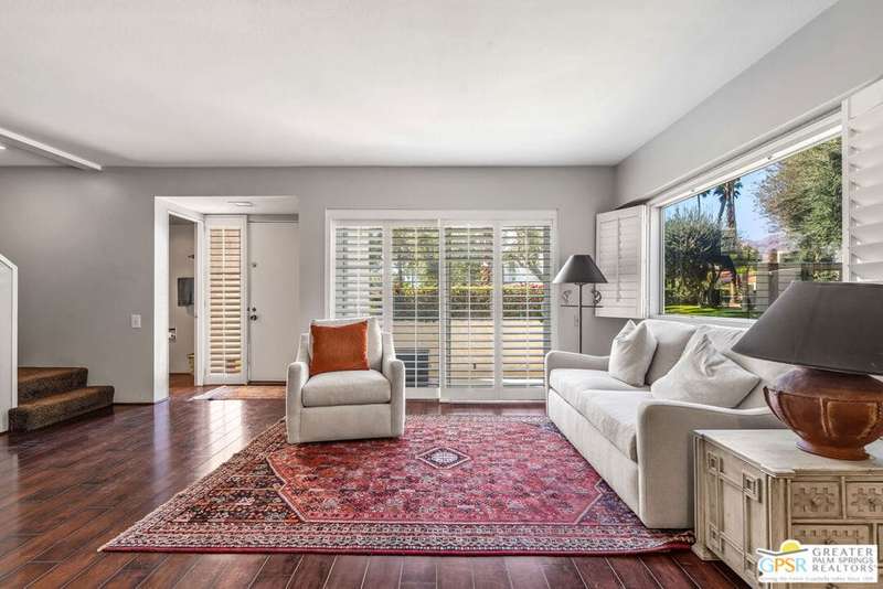 Welcome to Palm Springs Country Club Phase One, a hidden gem designed by William Cody AIA, one of Palm Springs' best-kept secrets. This architectural townhouse-style condo features 2 bedrooms, 1.5 baths, an updated kitchen, and an updated powder room downstairs. It offers laminate flooring throughout, except for the staircase, and stunning views of the San Jacinto mountains from both the living room and bedrooms. The HOA fees include basic cable and internet. The property is conveniently located near unassigned, uncovered parking. Fee simple land.