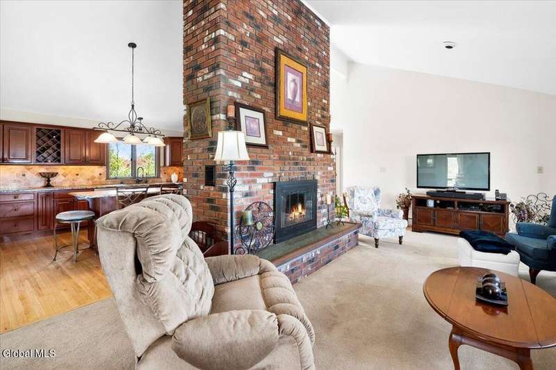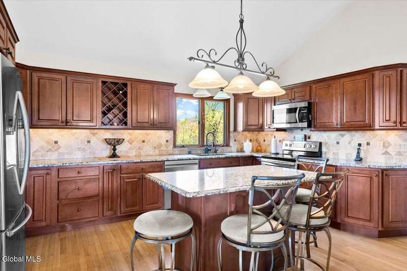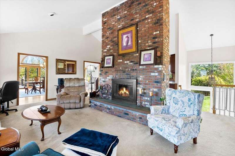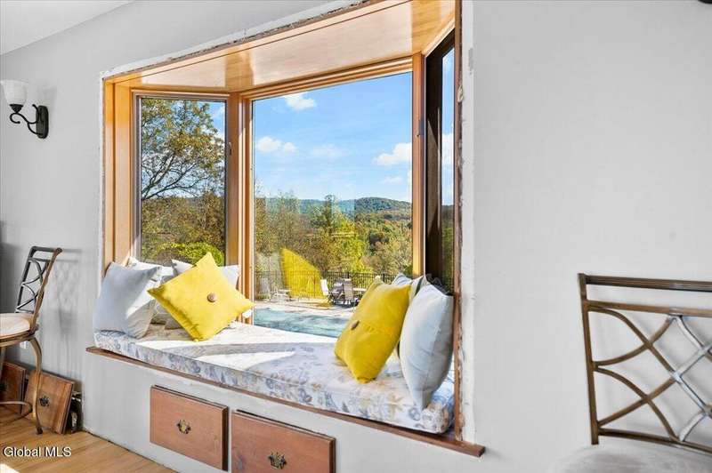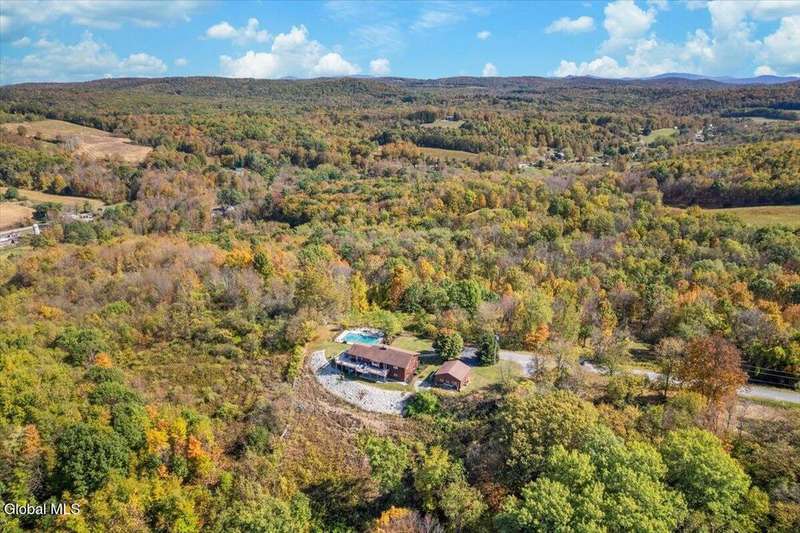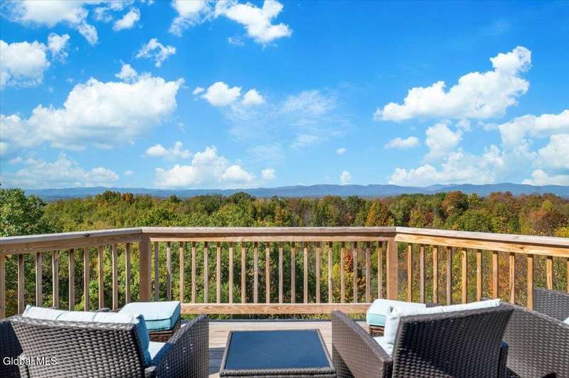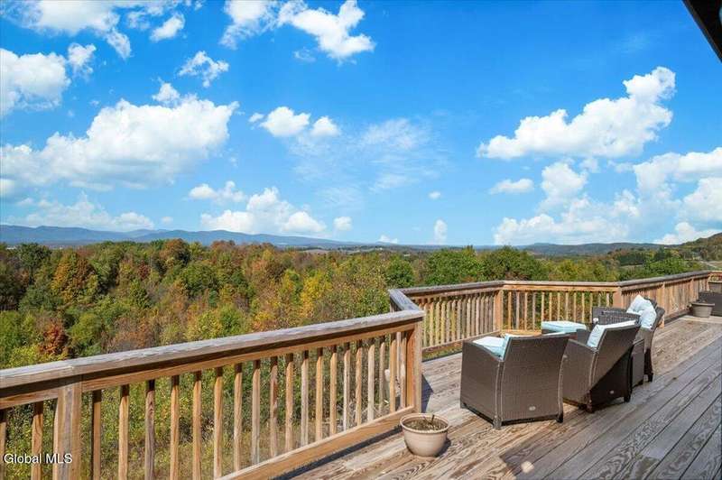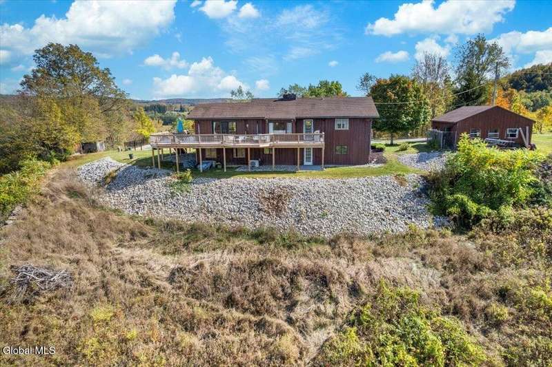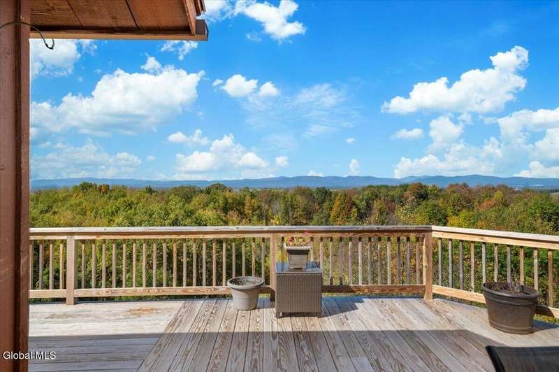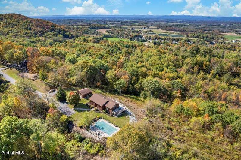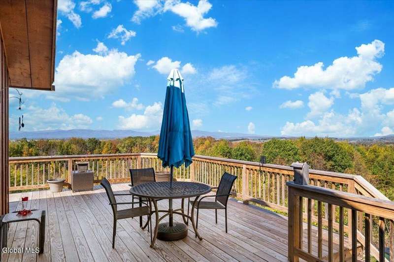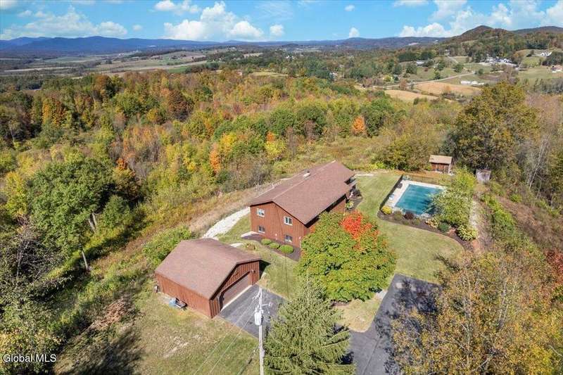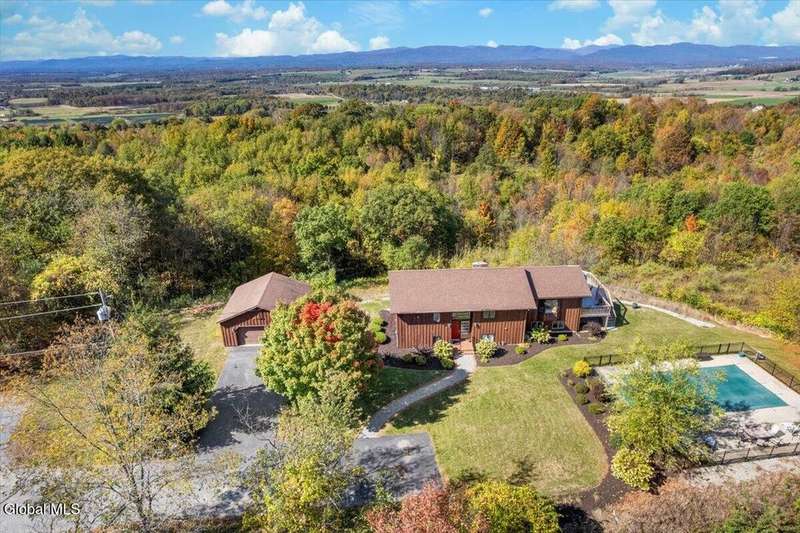 Perched high on Gilchrist hill with commanding 270? views, this beautiful home offers an ever-changing panorama of sunlight and sunsets. The property sits privately surrounded by nature on almost 2 acres, yet is designed for entertaining and relaxation. A massive 740sf wraparound deck provides the perfect vantage point to take in the sweeping countryside and mountain views. Enjoy summer days by the in-ground pool and patio area, or unwind in the spacious interior featuring an open-concept living and dining space that captures the scenery through large windows. The living room offers the warmth of a fireplace while the downstairs family room offers the efficiency of a wood stove. Two oversized bedrooms on each floor could each serve as a primary bedroom, offering flexibility and comfort for guests or multi-generational living. The detached two car garage adds convenience and storage. If you've been searching for a peaceful country setting with modern comfort and year-round natural beauty, this property delivers unlike anything else. Welcome home.