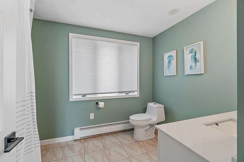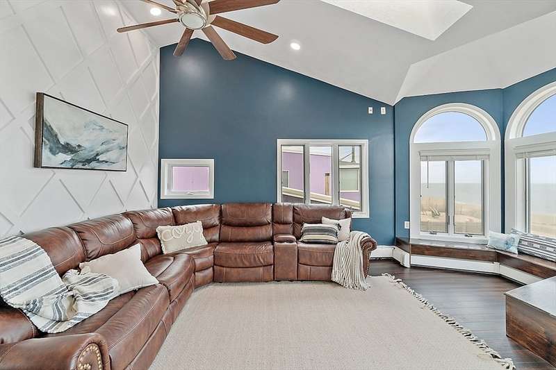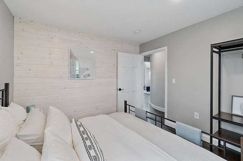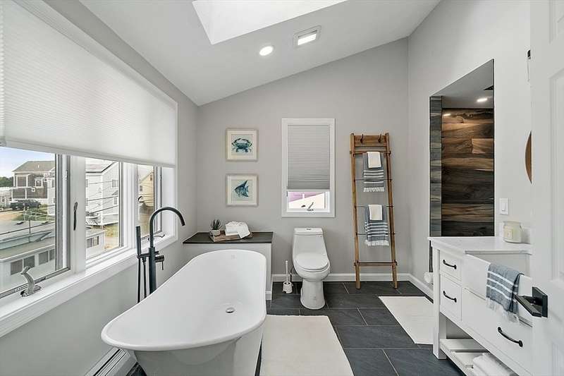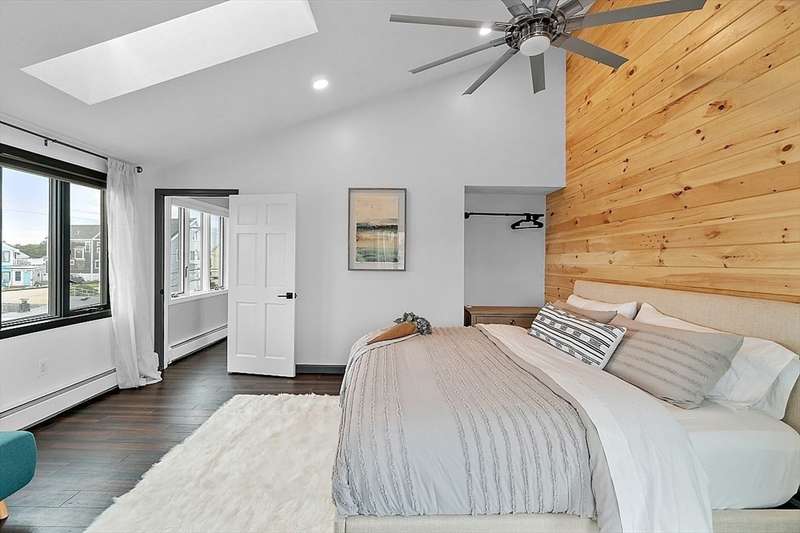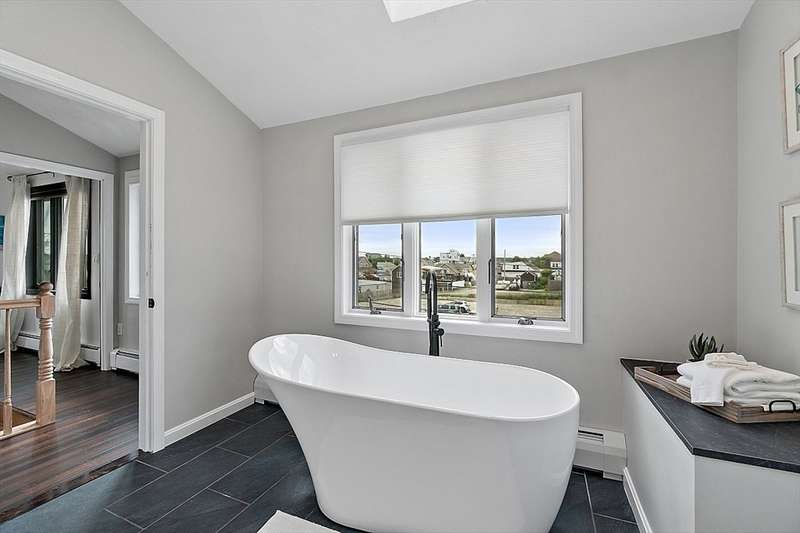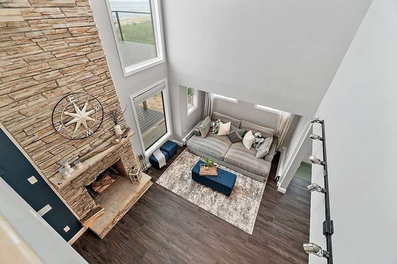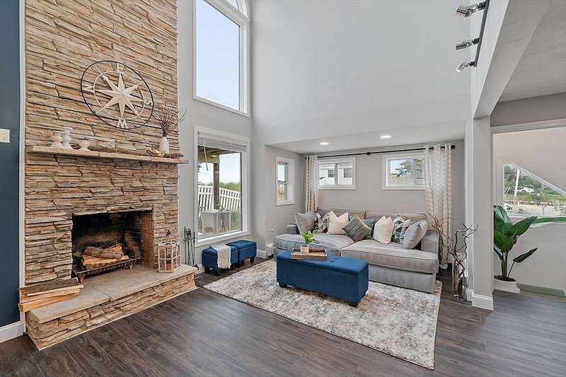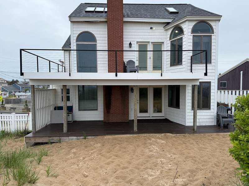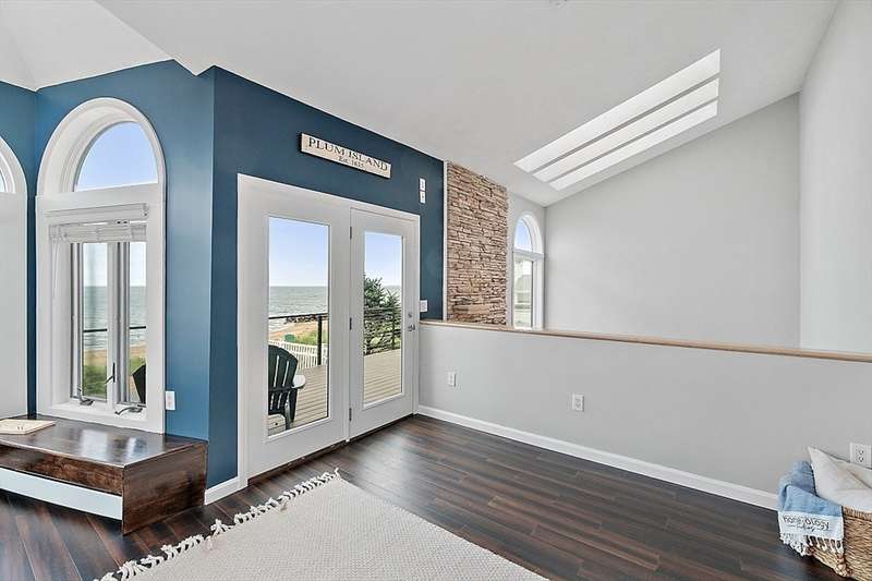 Oceanfront with a working fireplace on Plum Island! Plus the local restaurants and businesses remain OPEN all year round. This home offers stunning views from generous windows that create a feeling that only living on the ocean can give you. The waves are a show on their own! A modern open design, newer furnishings and appliances, a soaring ceiling in the living room with a two story working stone fireplace. This house is being offered fully furnished from Nov - April. Ideally for 2-4 people, the monthly rent + fixed $500 in utilities. Enter at ground level, the mostly finished bunk room to the L and stairs to main level. On main lv you’ll find an open Living room, Fireplace, Kitchen/dining, a King bedroom, Laundry room and full bathroom. Next level up is the Main King Bedroom with private top deck access, large full bathroom with soaker tub and oversized rain shower and the Great room with door to upper deck and halfwall overlooking lower living room.