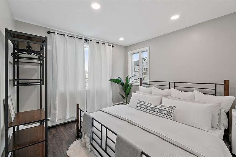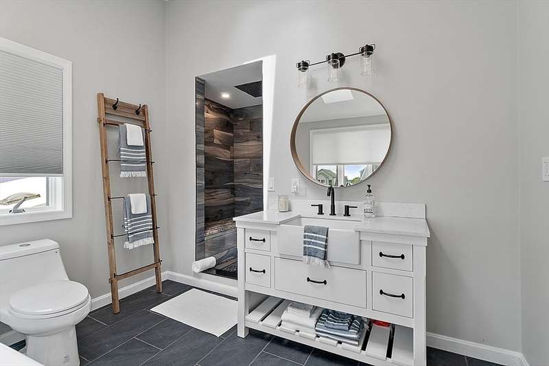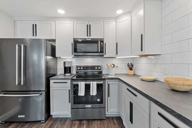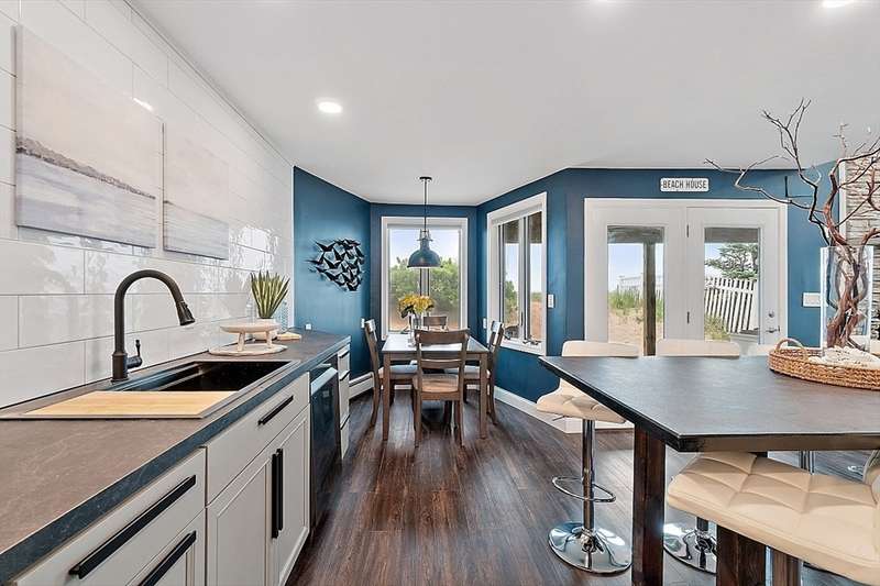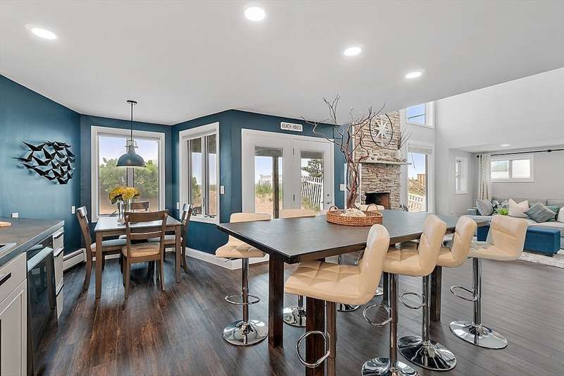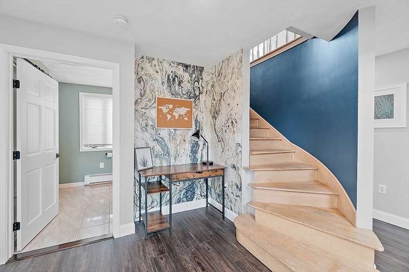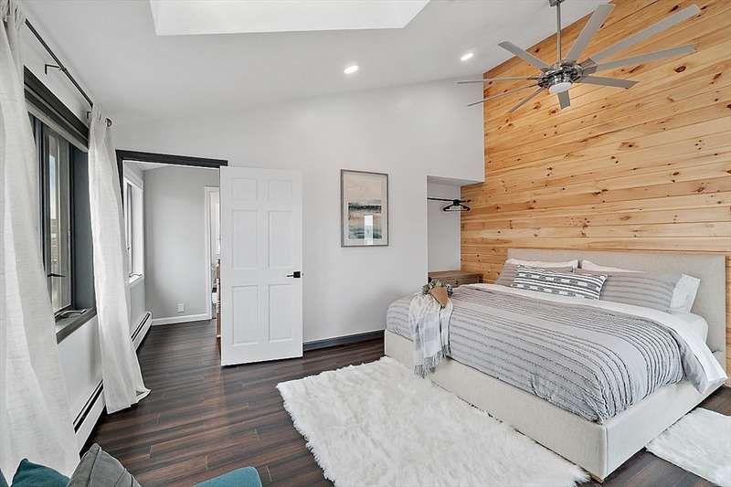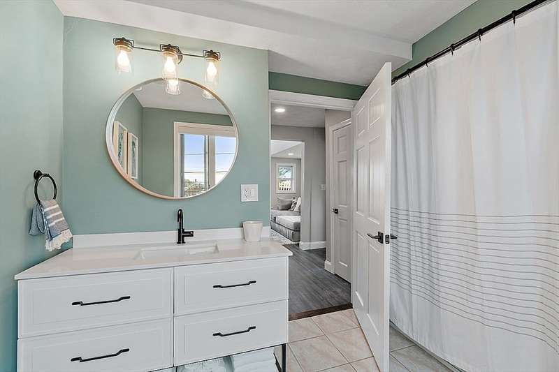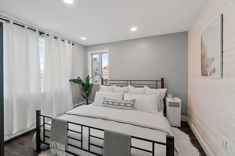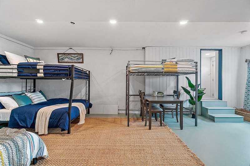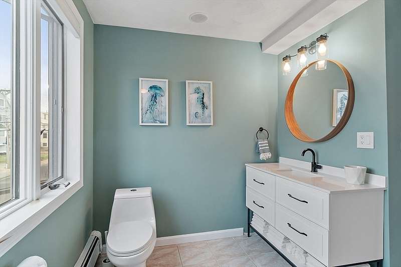 Oceanfront with a working fireplace on Plum Island! Plus the local restaurants and businesses remain OPEN all year round. This home offers stunning views from generous windows that create a feeling that only living on the ocean can give you. The waves are a show on their own! A modern open design, newer furnishings and appliances, a soaring ceiling in the living room with a two story working stone fireplace. This house is being offered fully furnished from Nov - April. Ideally for 2-4 people, the monthly rent + fixed $500 in utilities. Enter at ground level, the mostly finished bunk room to the L and stairs to main level. On main lv you’ll find an open Living room, Fireplace, Kitchen/dining, a King bedroom, Laundry room and full bathroom. Next level up is the Main King Bedroom with private top deck access, large full bathroom with soaker tub and oversized rain shower and the Great room with door to upper deck and halfwall overlooking lower living room.