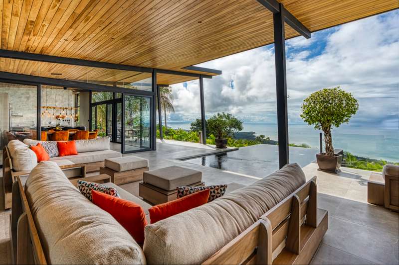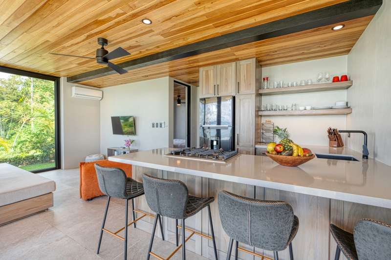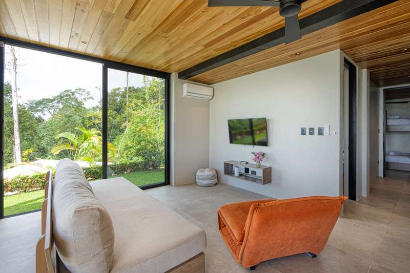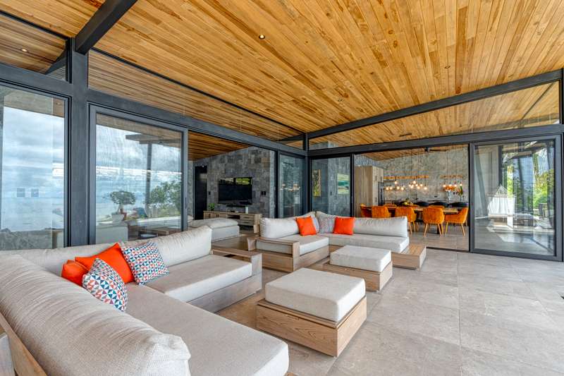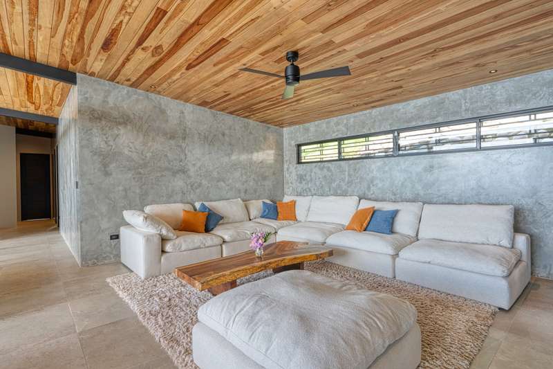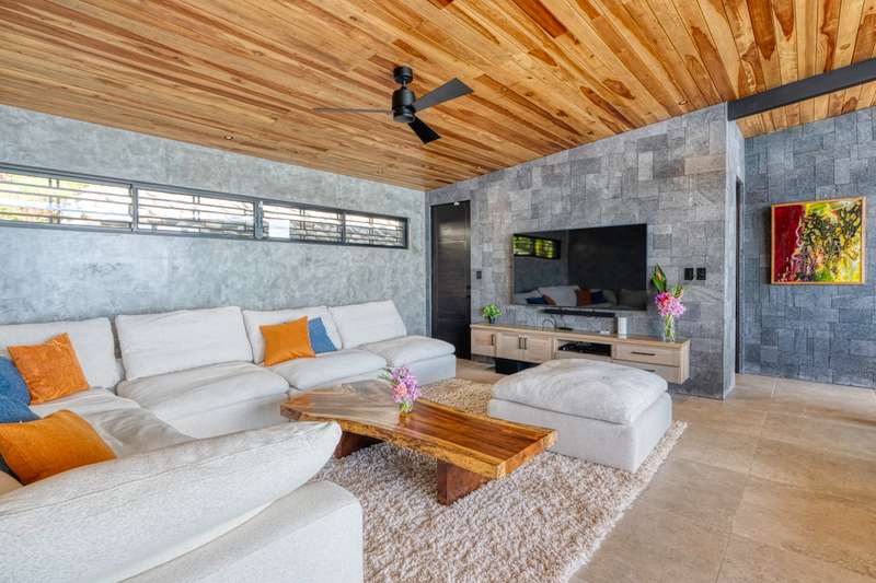 Step into the living space of Hermosa Retreat, a masterpiece of tropical sophistication, where every corner whispers luxury. Here, the indoors seamlessly blend with the outdoors, leading you to an expansive terrace. Imagine lounging on sofas, feeling the gentle breeze, or swaying peacefully in a hammock. This outdoor haven is not just a place but an experience, offering a serene backdrop for relaxation, yoga sessions, or meditative escapes amidst the embrace of nature's splendor.