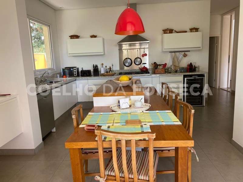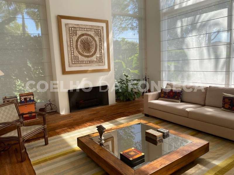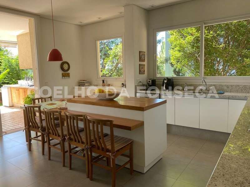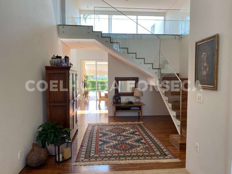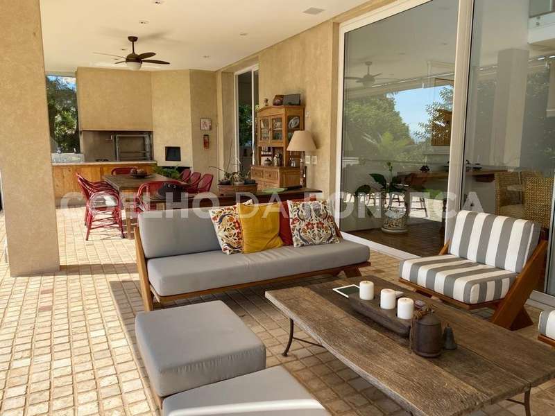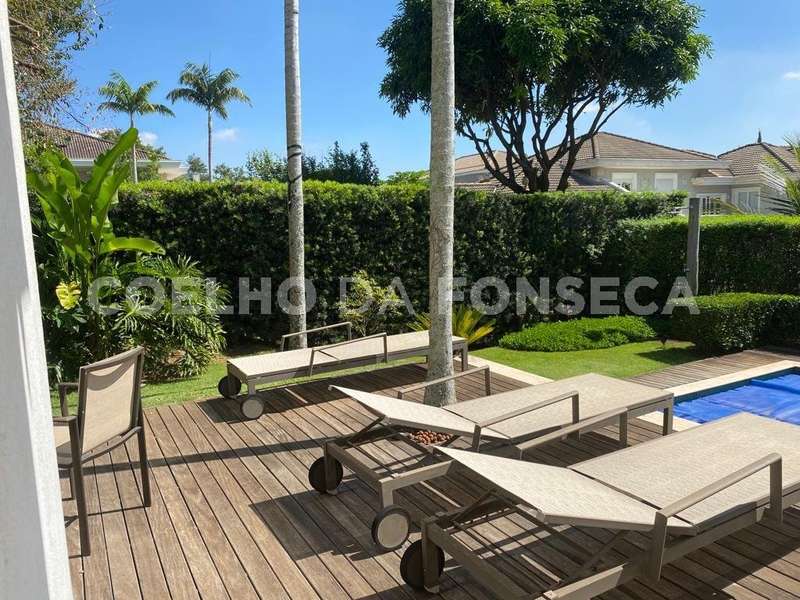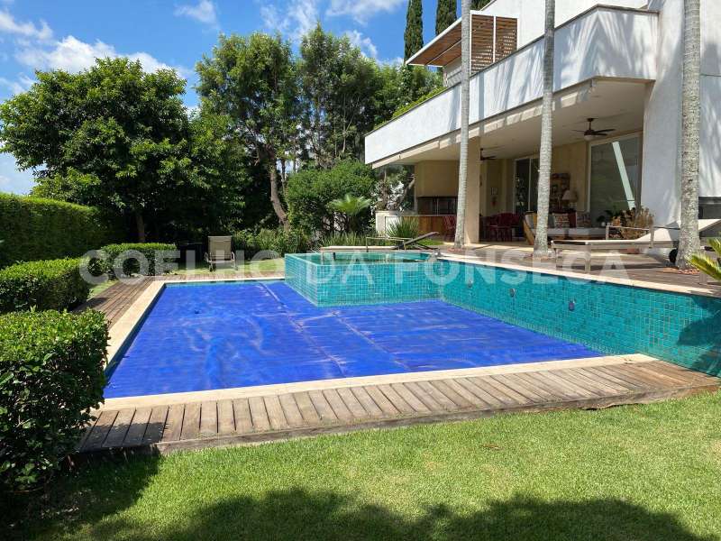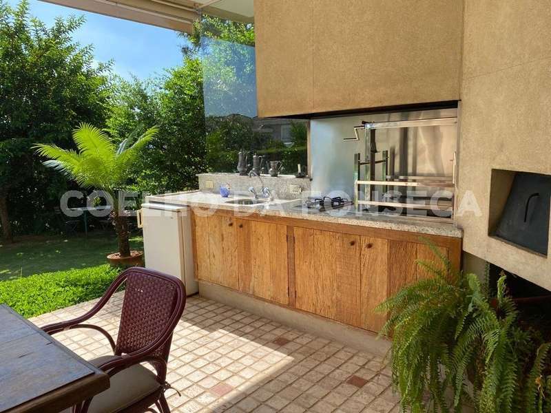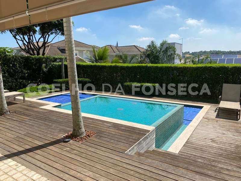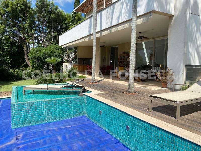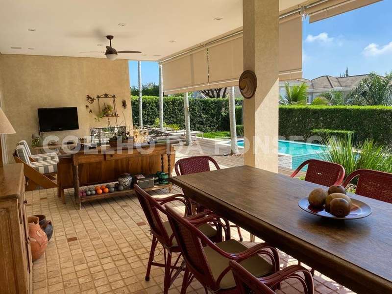 Linda casa em condomínio com três suítes com closet e varanda no andar superior, uma suíte no térreo, escritório, living com pé direito duplo, lareira, deliciosa varanda gourmet integrada a piscina.