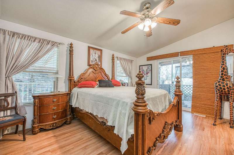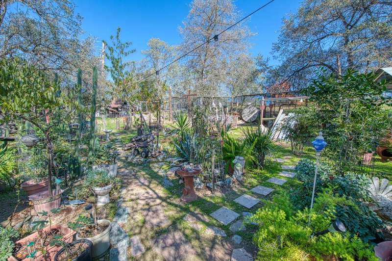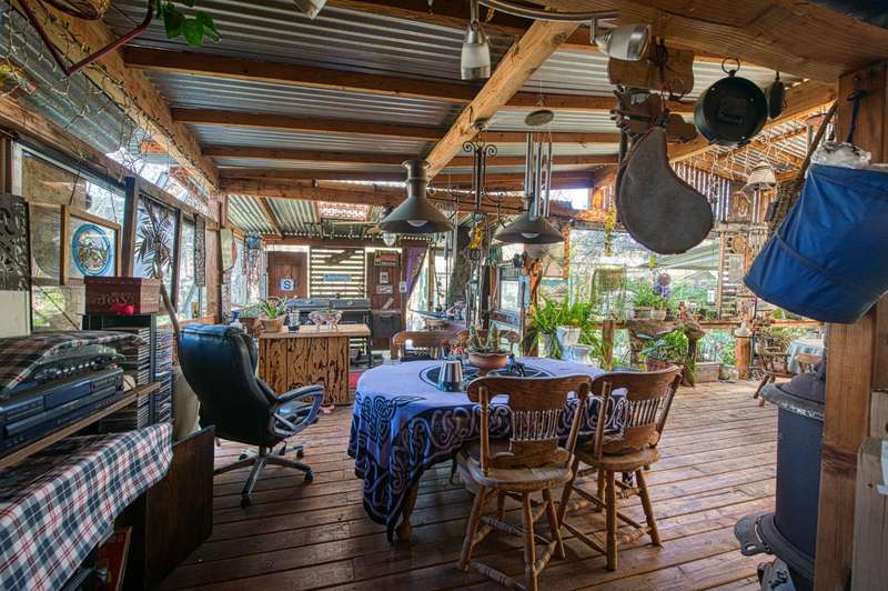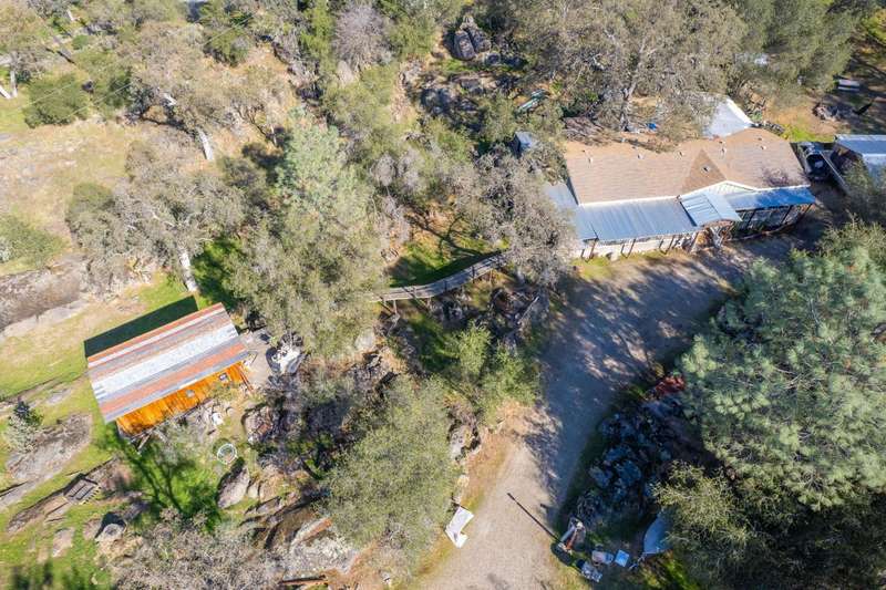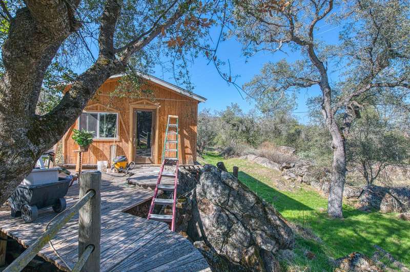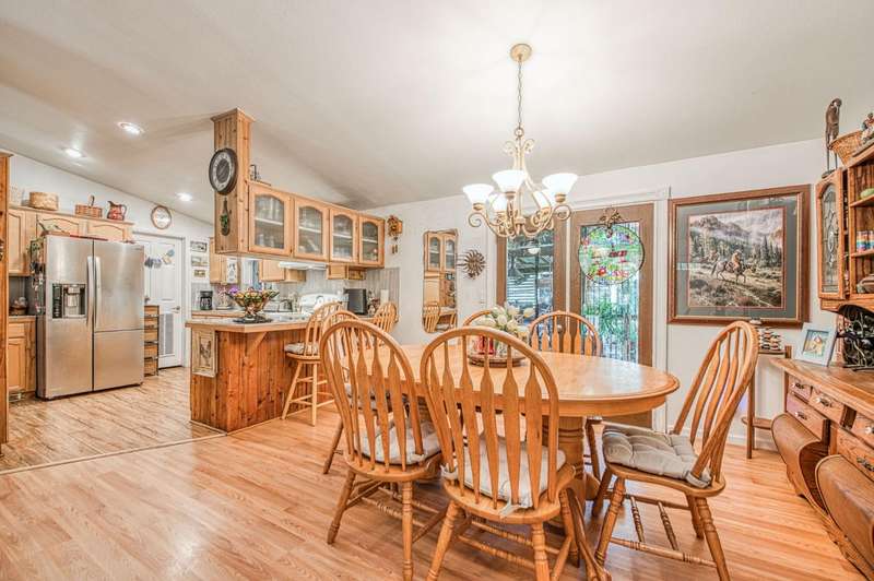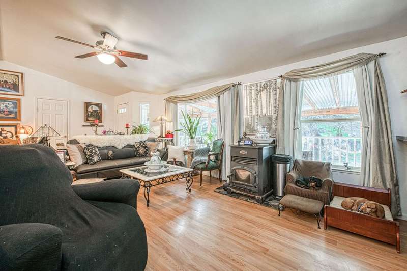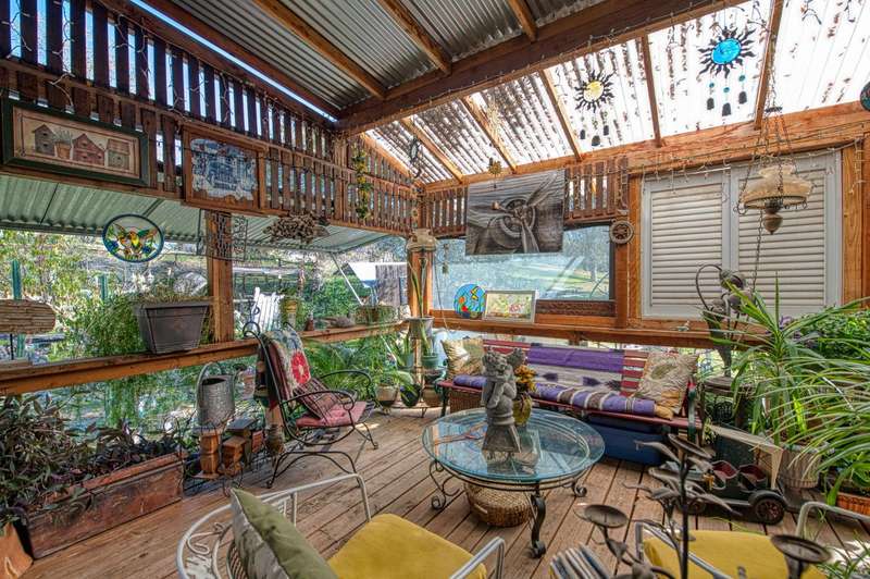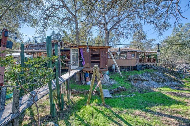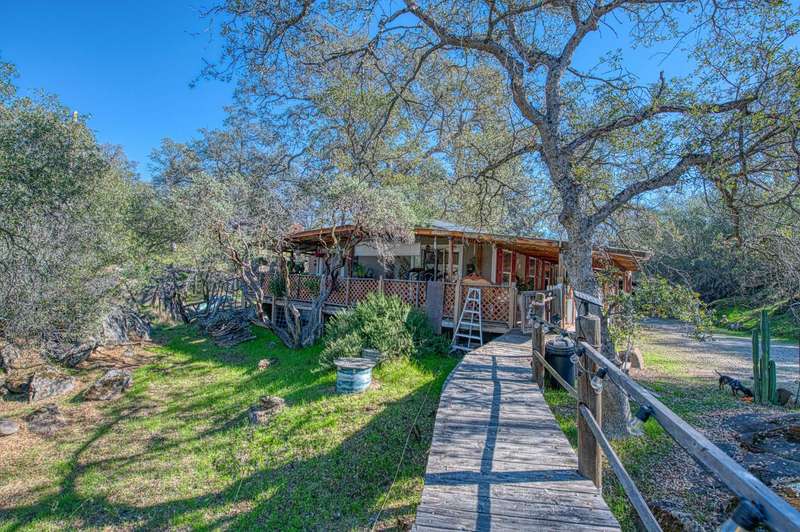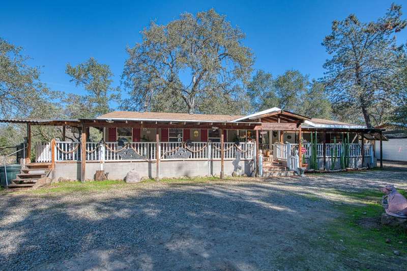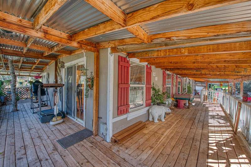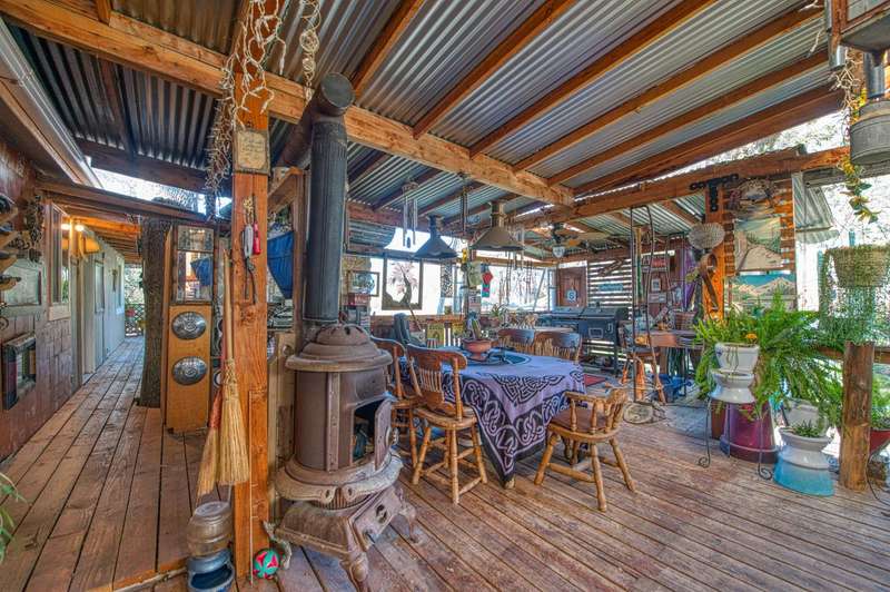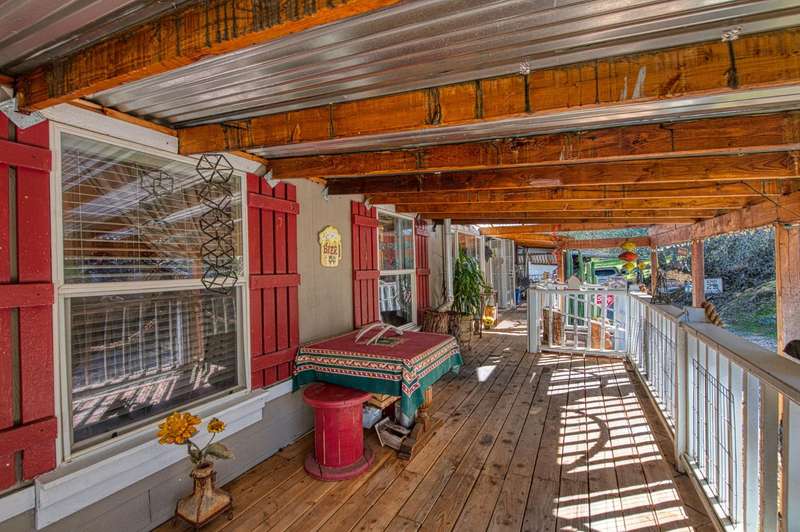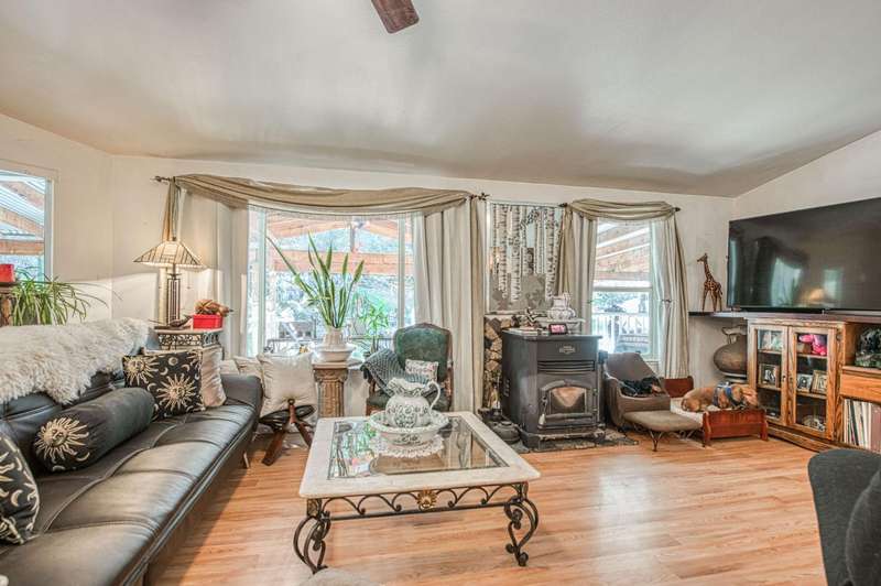 Welcome to your eclectic bohemian style private 1.21-acre retreat where indoor and outdoor living blend seamlessly. This charming 3-bedroom, 2-bathroom manufactured home on a foundation built in 2003 showcases the relaxed elegance of mountain living with spaces designed for both everyday comfort and memorable entertaining.The spectacular wraparound porch is the heart of this property a generous, covered extension that invites you to enjoy the fresh mountain air year-round. Whether you're sipping morning coffee as sunlight filters through the leaves, working remotely with nature as your backdrop, or hosting intimate evening gatherings, this versatile space adapts to your lifestyle. The thoughtful timber-and-metal construction provides shelter from the elements while providing a view to the wooded outdoors.Step into the expansive back patio area and discover your new favorite gathering spot. Nestled among mature trees, this spacious outdoor room is perfect for summer barbecues, starlit dinners, or quiet afternoons with a good book. The covered section creates a cozy, protected hangout area that extends your living space well beyond the home's walls. Imagine entertaining friends and family in this picturesque setting with room for everyone to spread out and relax.Inside, you'll find a welcoming kitchen that balances character with functionality, updated appliances, ample counter space, and thoughtful storage beneath warm wood cabinetry. The antique wood stove adds authentic mountain ambiance and supplemental heat on chilly evenings. Throughout the home, unique architectural details and creative touches reflect a one-of-a-kind personality.The thoughtfully landscaped grounds feature established garden beds, artistic plantings, and charming outdoor seating areas tucked throughout. Lush greenery, mature trees, and creative hardscaping create multiple inviting spots to unwind. This is a property that's been loved and cultivated with care.With over an acre of wooded privacy and access to community amenities and a converted storage unit with kitchenette and an unfinished bathroom for potential ADU completion, this property offers the perfect balance of seclusion and convenience. This is more than a house, it's a lifestyle for those seeking authentic mountain living with room to breathe.