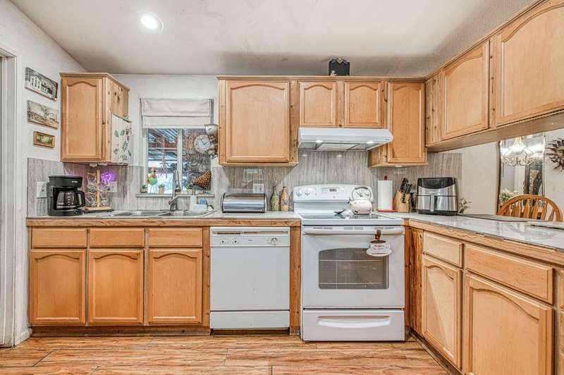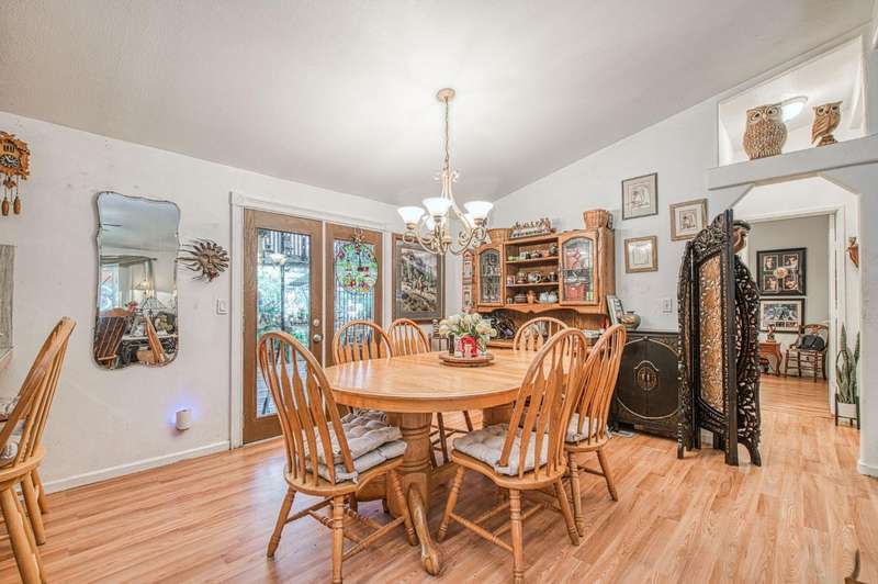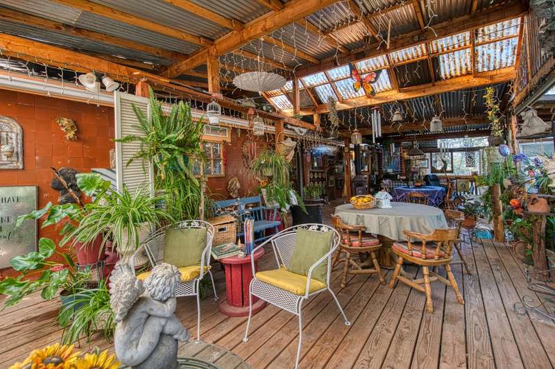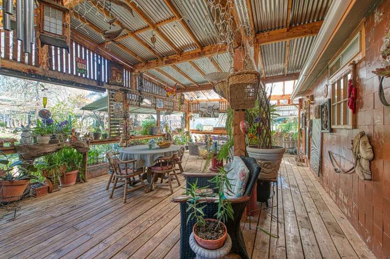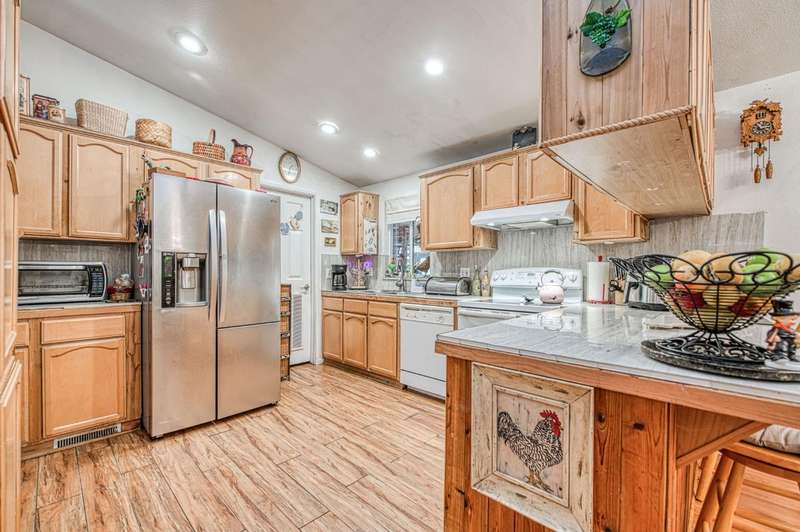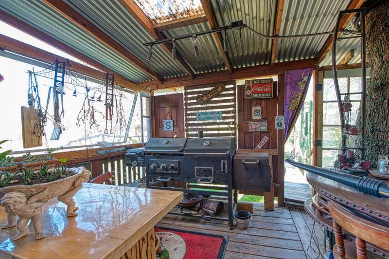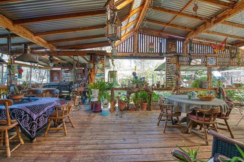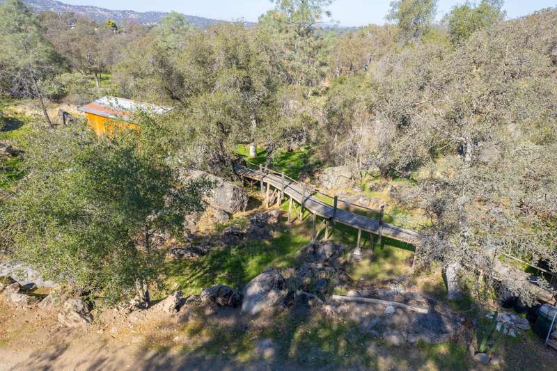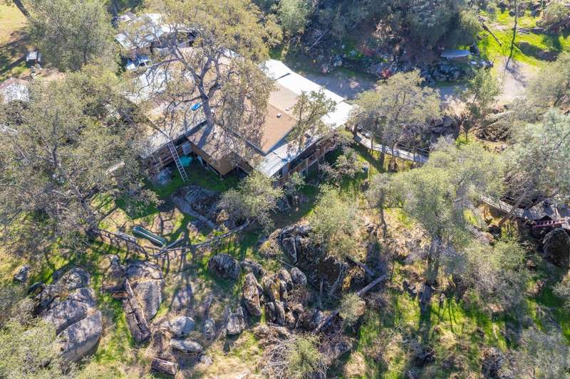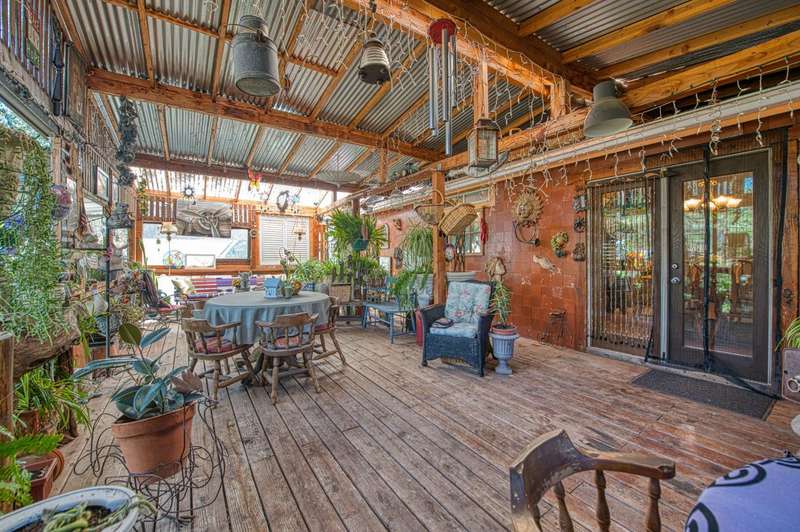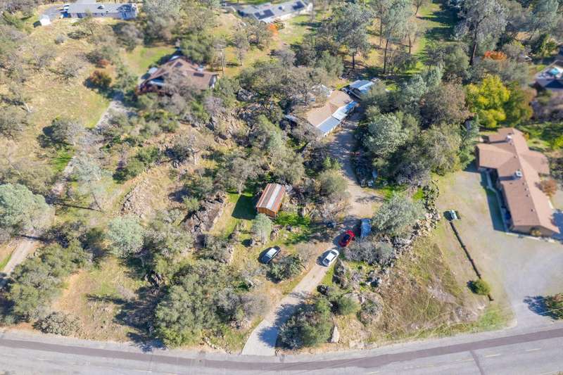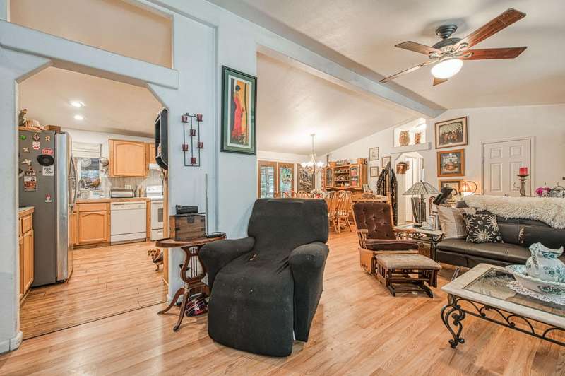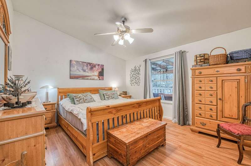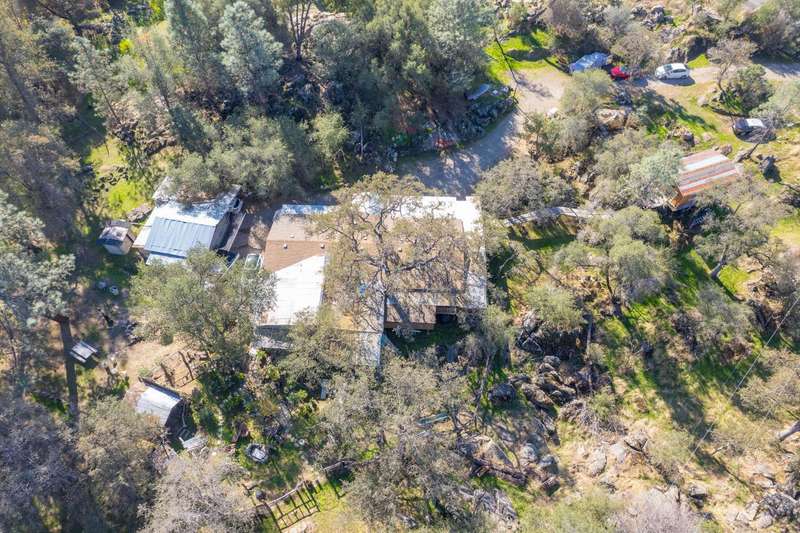 Welcome to your eclectic bohemian style private 1.21-acre retreat where indoor and outdoor living blend seamlessly. This charming 3-bedroom, 2-bathroom manufactured home on a foundation built in 2003 showcases the relaxed elegance of mountain living with spaces designed for both everyday comfort and memorable entertaining.The spectacular wraparound porch is the heart of this property a generous, covered extension that invites you to enjoy the fresh mountain air year-round. Whether you're sipping morning coffee as sunlight filters through the leaves, working remotely with nature as your backdrop, or hosting intimate evening gatherings, this versatile space adapts to your lifestyle. The thoughtful timber-and-metal construction provides shelter from the elements while providing a view to the wooded outdoors.Step into the expansive back patio area and discover your new favorite gathering spot. Nestled among mature trees, this spacious outdoor room is perfect for summer barbecues, starlit dinners, or quiet afternoons with a good book. The covered section creates a cozy, protected hangout area that extends your living space well beyond the home's walls. Imagine entertaining friends and family in this picturesque setting with room for everyone to spread out and relax.Inside, you'll find a welcoming kitchen that balances character with functionality, updated appliances, ample counter space, and thoughtful storage beneath warm wood cabinetry. The antique wood stove adds authentic mountain ambiance and supplemental heat on chilly evenings. Throughout the home, unique architectural details and creative touches reflect a one-of-a-kind personality.The thoughtfully landscaped grounds feature established garden beds, artistic plantings, and charming outdoor seating areas tucked throughout. Lush greenery, mature trees, and creative hardscaping create multiple inviting spots to unwind. This is a property that's been loved and cultivated with care.With over an acre of wooded privacy and access to community amenities and a converted storage unit with kitchenette and an unfinished bathroom for potential ADU completion, this property offers the perfect balance of seclusion and convenience. This is more than a house, it's a lifestyle for those seeking authentic mountain living with room to breathe.