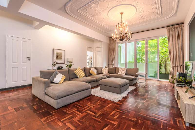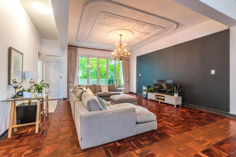 Vast multiple receptions with teak parquet ,pressed ceiling and decorative crystal style chandelier flows seamlessly