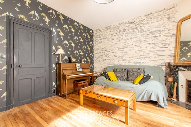 The ground floor opens onto a cozy living room, enhanced by refined parquet flooring and a suspended fireplace, creating a friendly and authentic atmosphere.