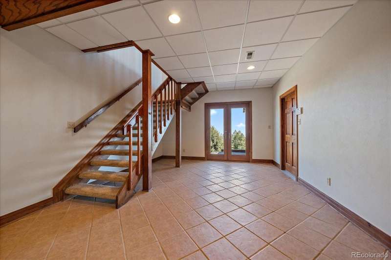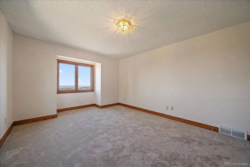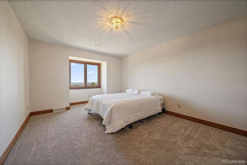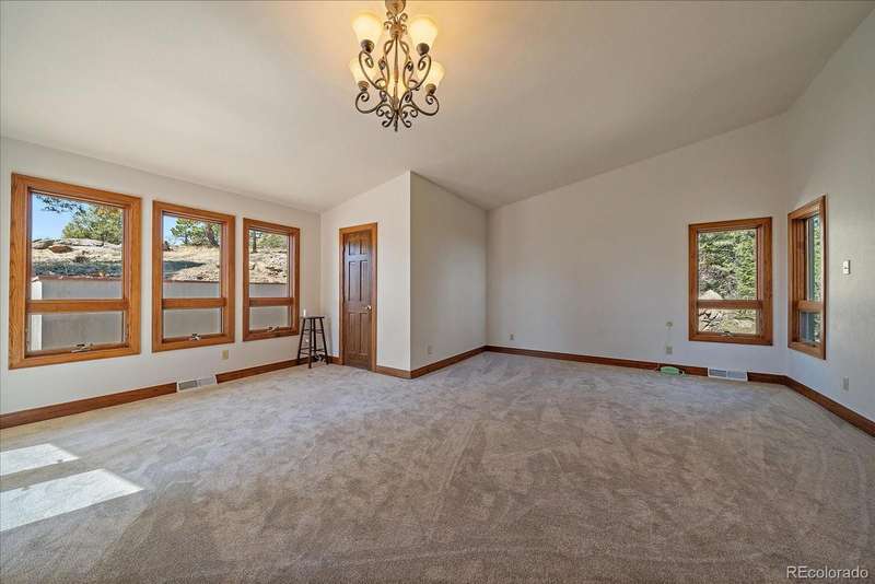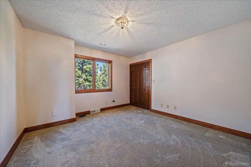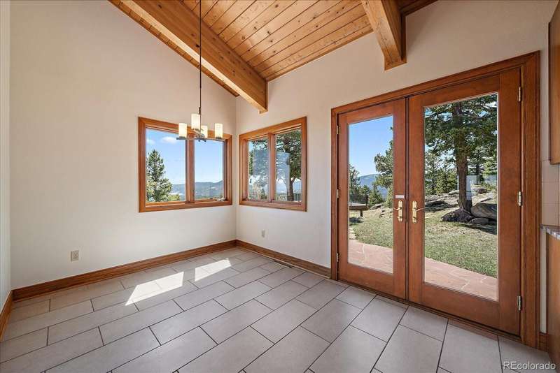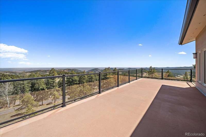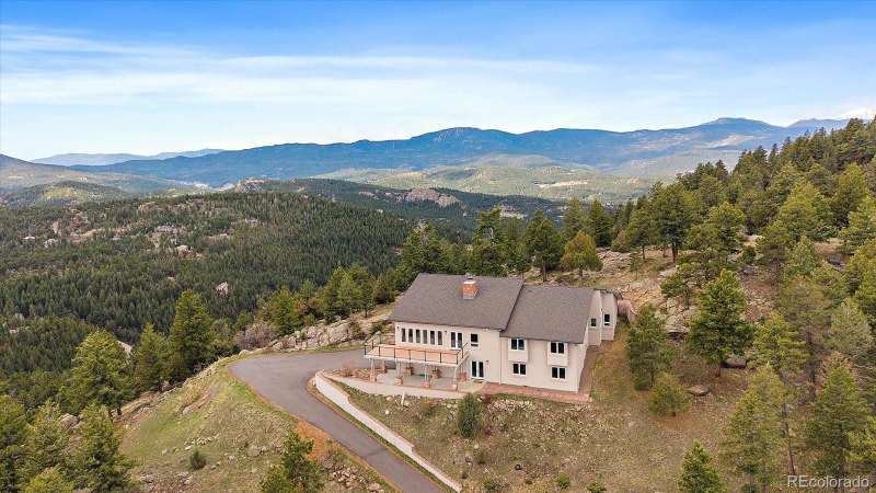 A true mountain top experience! 5197 S. Bear Mountain Dr. is a luxurious 6-bedroom, 4-bathroom mountain retreat located in Evergreen. Perched in the trees atop an 11.32-acre lot, this property offers stunning 360-degree views of the Denver valley and the mountains to the west, including a clear view of Pikes Peak from the south side. The home features four bedrooms on the main floor, including a spacious walk-out primary bedroom with a beautiful en-suite five-piece bathroom. The basement includes two additional bedrooms and a bathroom, as well as a wet bar and built-in shelving, making it an ideal space for entertainment. Updated in 2015, this secluded mountain getaway features new carpet, fresh paint, and a remodeled kitchen and bathrooms. The in-floor electric heating system is more efficient than traditional electric baseboard heating, providing warmth during the winter months, along with excellent passive solar heat from the large windows that encase the main floor. The landscaping has been carefully designed to mitigate fire danger, with trees thinned around the home and rock gardens installed around the perimeter. The stucco exterior finish also enhances fire resistance. Additional features of the home include a security system, three 300-gallon water storage tanks, a new sewer line and septic tank installed in 2020, a 50-gallon water heater, and a new furnace installed in 2012.