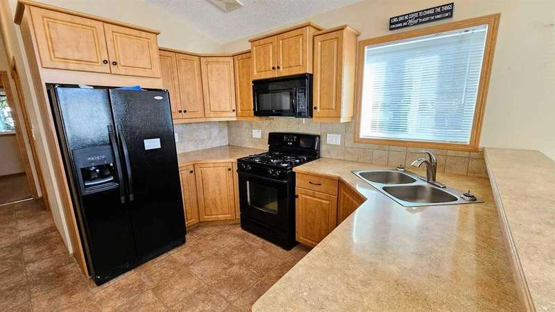Step into the best of golf course living at this impeccably maintained year-round Park Model home, nestled on a beautifully landscaped & oversized corner lot (0.09 acres) in the prestigious Coyote Creek Golf & RV Resort near Sundre. This one-bedroom, one-bathroom, 586 sq ft home is designed for comfort, function, & relaxation — with year-round appeal. Inside, enjoy the open-concept layout flooded with natural light from large south-facing windows. The spacious kitchen boasts ample counter space, pantry storage, & room for an island — ideal for entertaining or prepping meals after a day on the course. Vaulted ceilings & warm finishes complement the drywalled interior (no panels here!), & the home is fully insulated (R30 walls/R40 roof) for true four-season use. The bedroom features custom built-in cabinetry, while the 3-piece bathroom includes a stacking washer/dryer & a generous corner shower for everyday convenience. A new water pump (2024) supports a fully winterized cistern system with water trailer heater, ensuring functionality even in -40°C. Step outside & relax on the impressive 12’8" x 40’4" covered deck — nearly doubling your living space! Included are a fire table, dining set, outdoor couch, & BBQ — making this your go-to outdoor retreat. The property includes a full concrete pad, low-maintenance landscaping, & extensive extras such as a 200-gallon cistern & 200-gallon water trailer (heated). A10x12 hardwired & finished golf garage/workshop. A 8x12 hardwired & finished storage shed with shelving & deep freeze. AND THE GOLF CART IS INCLUDED! Located just minutes from Sundre, where you'll find shopping, schools, an Aquaplex, gym, arenas, public library, & the Arts Centre. Whether you're a passionate golfer, nature lover, or simply looking to downsize or invest in a secondary residence — this home delivers an unmatched RV lifestyle opportunity with all the amenities of a full-time home. “Home Is Where Your Story Begins!”