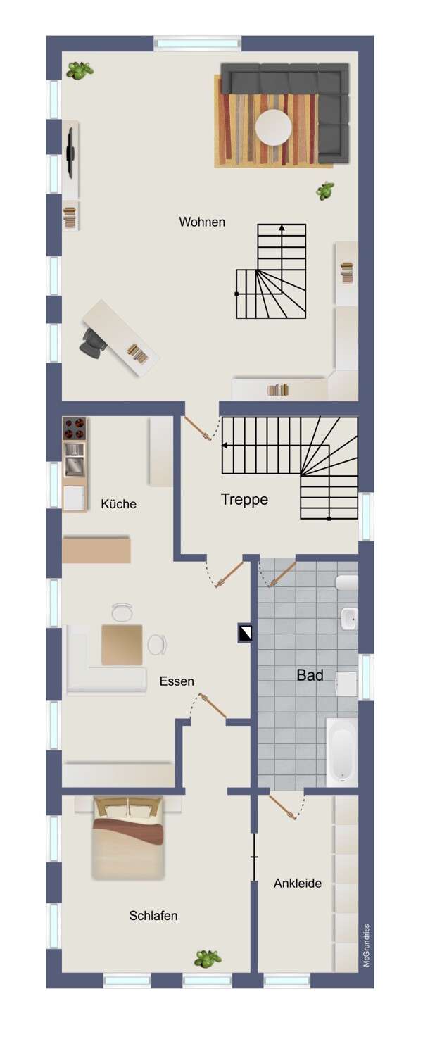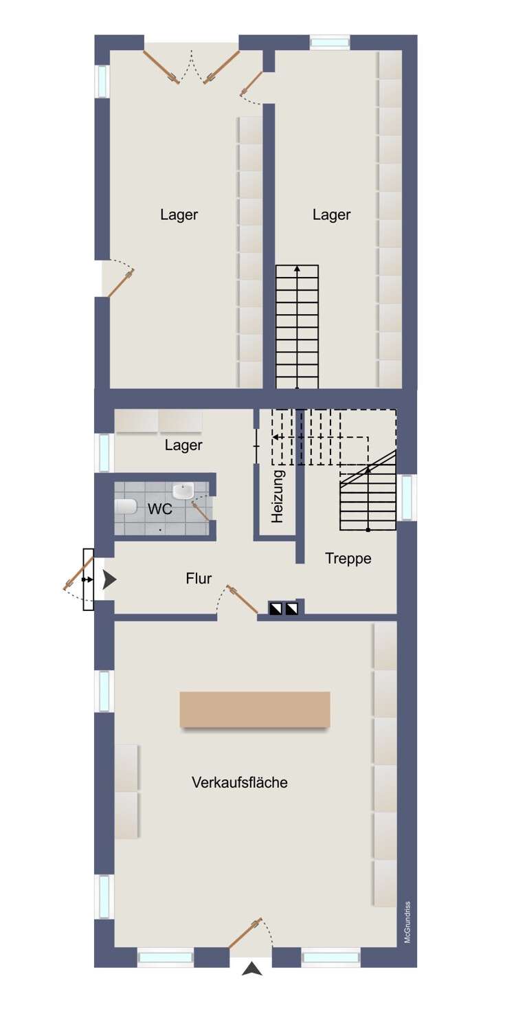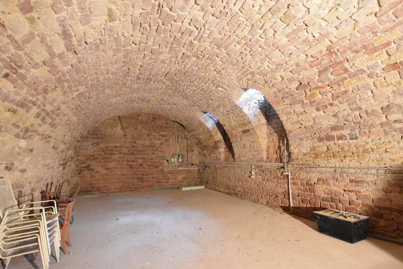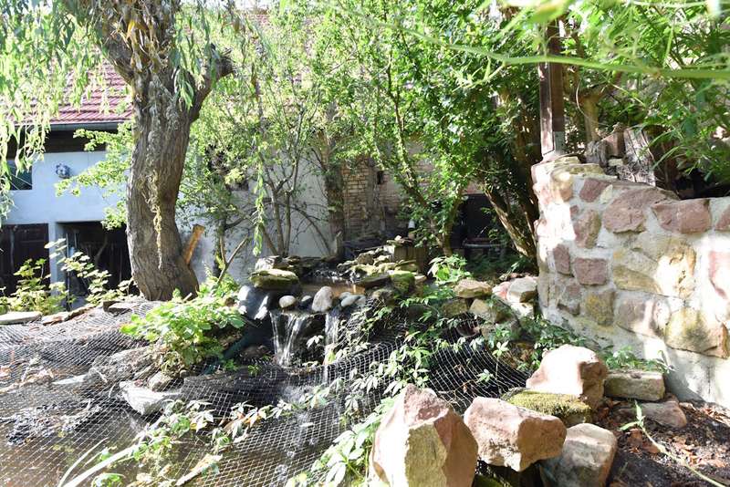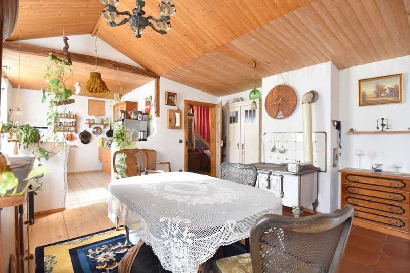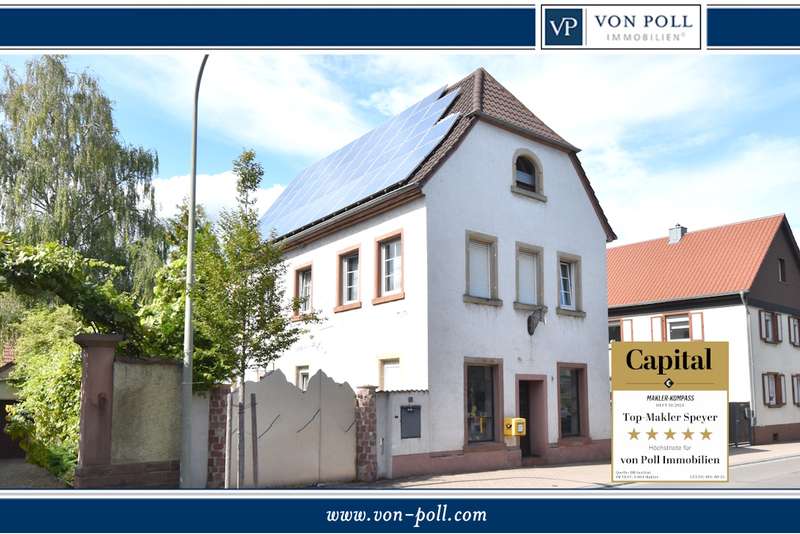 This property, built around 1750 and formerly used as a residential and commercial building, is located in a beautiful and central residential area of Römerberg. Currently three rooms spread over approx. 132 sqm of living space on the 1st floor and plenty of expansion potential on the ground floor and attic offer you space to fulfill your personal dream home. The former business premises are located on the first floor of the house. There is a large sales area, a storage and boiler room and a WC. Conversion into living space is just as conceivable here as setting up an office or store. A wooden staircase leads to the 1st floor, directly into the living room with exposed beams and wooden floorboards. The adjoining cooking and dining area impresses with its authentic charm: a high wood-panelled ceiling, an antique kitchen stove and original wooden doors will make the hearts of country house lovers beat faster. A bedroom with separate dressing room and a daylight bathroom with bathtub complete the floor plan. The spacious plot with its mature trees offers a paradise for hobby gardeners and children. With a view of the lovingly landscaped natural stone pond, you will find a haven of peace here after long days. There is also an old barn on the grounds. The building has a partial basement with a traditional vaulted cellar. The electrics, gas heating and water pipes were renewed at the end of the 1980s. Double-glazed plastic and wooden windows were also installed. The roof was re-roofed and a 10.44 kWp PV system was installed in 2008. Overall, the property is due for significant modernization work, giving you plenty of scope to design the floor plan and room layout according to your personal wishes and needs.