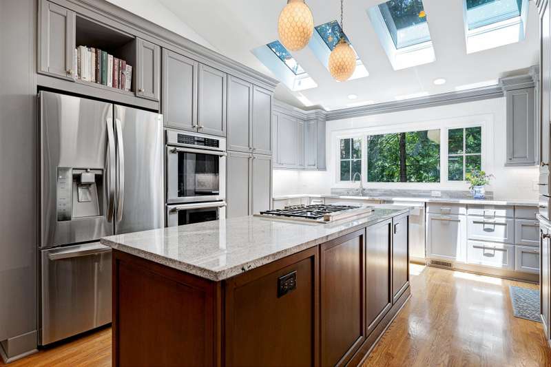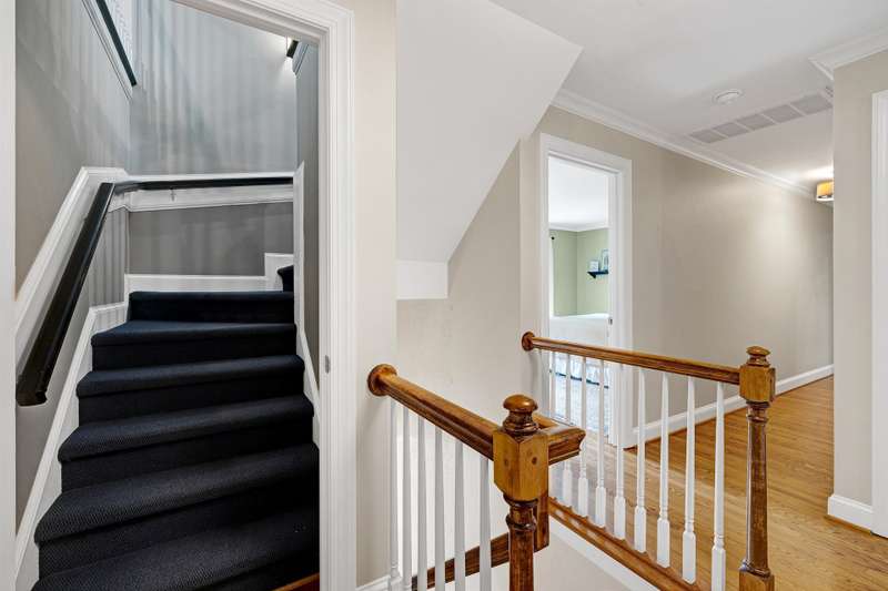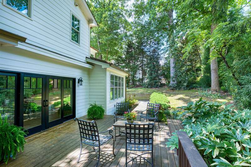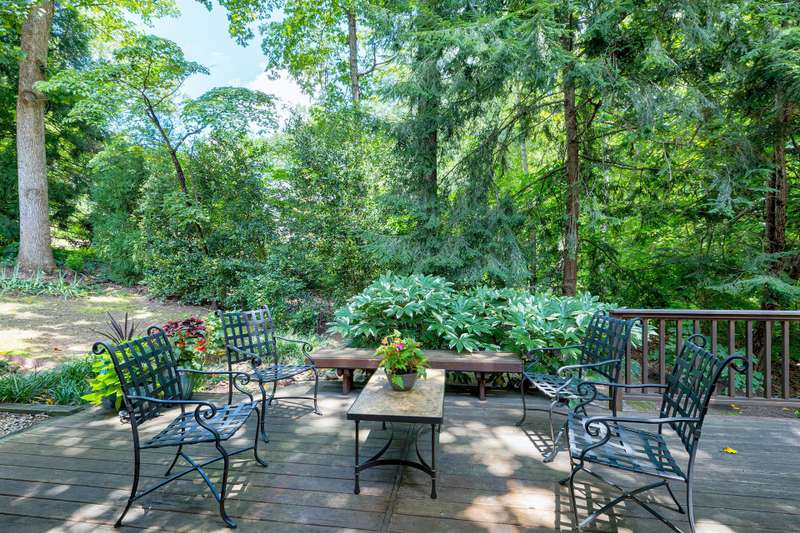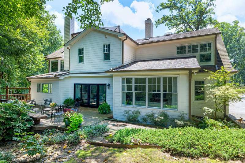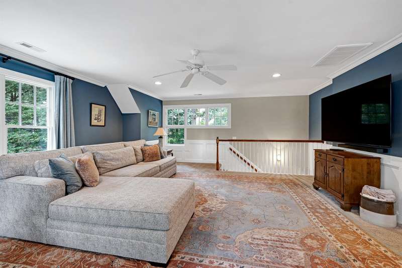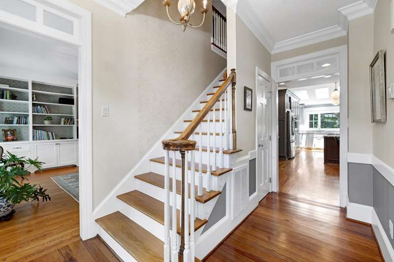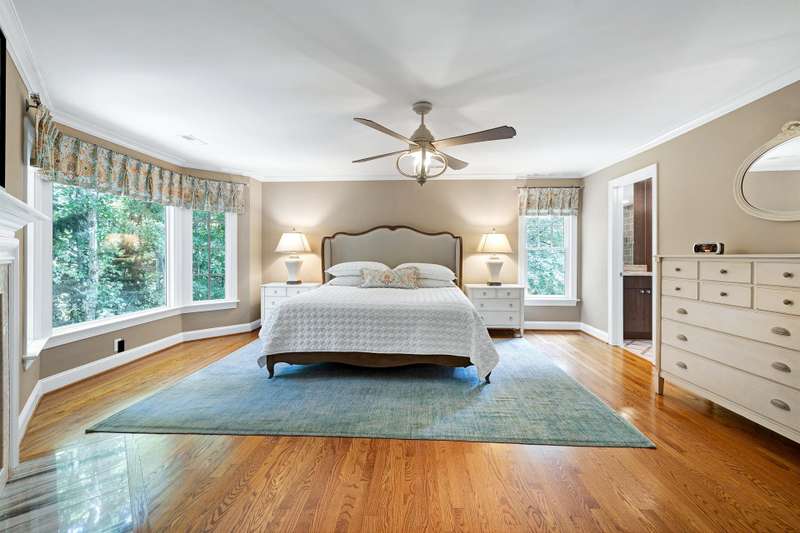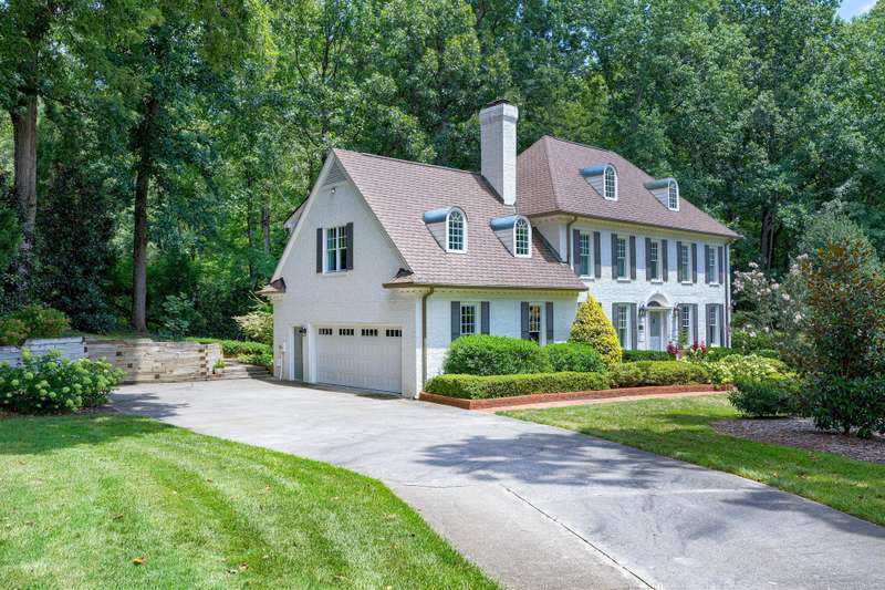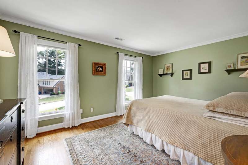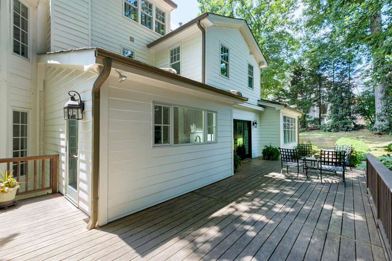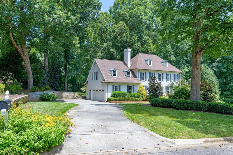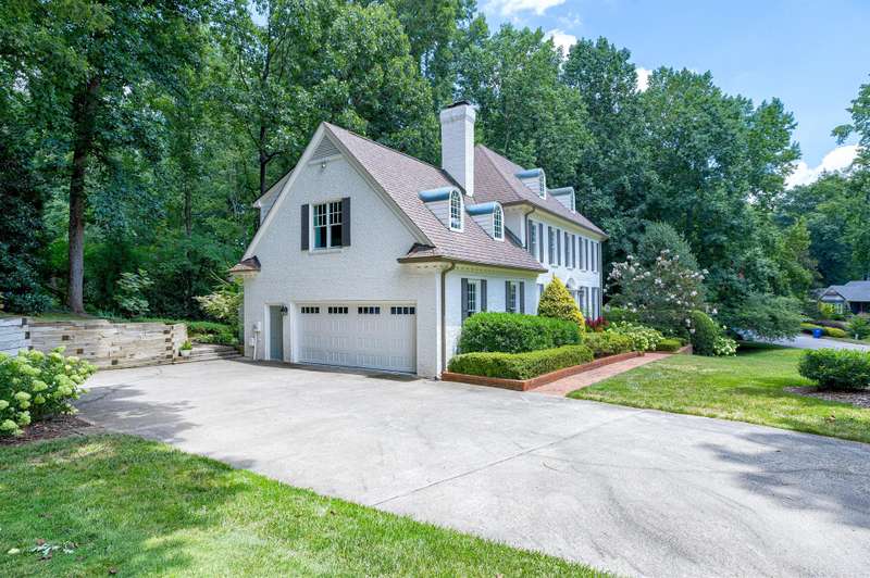 Set on a peaceful cul-de-sac with no through traffic, this 4-bed, 4-bath home offers nearly 4,300 sq ft of beautifully updated living. A major two-story rear addition expands the living space with a renovated kitchen and double sunrooms. All new Pella windows, new skylights, updated HVAC systems on every level, and major plumbing replacement mean the big projects are done. Quiet location, quality finishes, and a strong price point make this one of the best values in North Raleigh.Light-filled interiors begin with a welcoming foyer and continue into a versatile living/billiards room with built-ins and a gas fireplace. The formal dining room features a beamed ceiling and space to host a crowd. The kitchen includes a center island, gas cooktop, wet bar, granite counters, new skylights, and a sunny breakfast banquette. Two adjoining sunrooms create relaxed spaces for reading, entertaining, or enjoying the quiet setting. The primary suite offers a fireplace, double closets, and a newly renovated bath. Upstairs are two additional bedrooms, a full bath, and a spacious bonus room with rear-stair access. The third floor provides a private guest suite with full bath. Outside, a two-level deck overlooks a landscaped yard with magnolias, hydrangeas, and towering oaks, backing to a creek and forest.