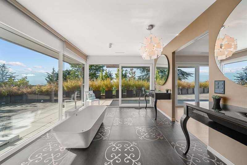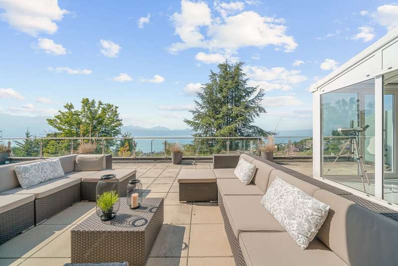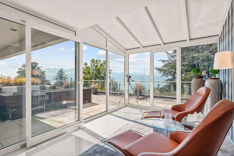 Discover this duplex penthouse apartment, located in a prestigious residence composed of two apartments. This exceptional property, spread over two floors, offers breathtaking views of Lake Geneva, blending modernity and elegance in an idyllic setting. The first level, spanning 136 sqm, opens onto a vast 180-sqm terrace, perfect for enjoying the stunning lake & Alps panorama. This level features four bedrooms, including two en-suites. The master suite is a true invitation to relaxation, with an open bathroom equipped with a shower and hammam, separate toilets, and a spacious walk-in closet. The second suite also has its own shower room and WC. Two additional bedrooms, an extra dressing room, and a bathroom with a shower and separate WC complete this floor. The second level, covering 160 sqm, is distinguished by its vast, light-filled living room, extended by a winter garden with direct access to a 107 sqm terrace wrapping around the floor. An elegant and functional open-plan kitchen seamlessly integrates with the dining area in this convivial living space. This floor also includes an en-suite bedroom with a shower room and separate WC, a guest WC, and an entrance with a cloakroom. The apartment benefits from four indoor parking spaces and a private garage (in addition), and two 12.5-square-meter cellars, providing generous storage space. A bright and elegant entry hall leads to the lift from the garage. The apartment benefits from Minergie-certified construction, ensuring high energy performance and a healthy living environment. For added convenience, central vacuuming is installed throughout the entire space. Additionally, the geocooling system provides natural and eco-friendly cooling during summer.