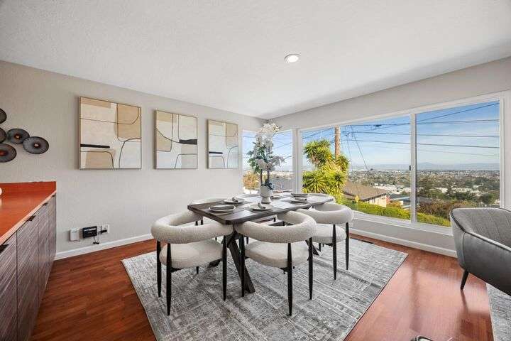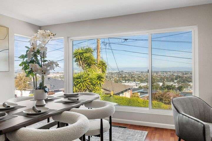 Bay Views during the Day - Acres of Diamond Lights in the Evening. Total move-in condition. Light flows throughout the rooms from the almost new Milgard custom dual pane windows. New paint throughout the entire interior. Engineered hardwood floors. Refaced Kitchen cabinets. Quality stainless steel appliances. Kitchen and Living Room - Dining Room Combination open to straight on Bay and Neighborhood Views. Newer vanities in both Bathrooms. Refinished with white gloss - shower and bathing tub. Updated electrical. Newer Bitumen Roof. Spacious Primary Bedroom. Rear two Bedrooms with plenty of light and closet space. Interior Laundry area with storage cabinets. Low maintenance rear patio nicely extends the living area. Space insulation with the expansive upper hill. Endless possibilities...Garden? Pets or Children at Play? Downstairs is the spacious 2 Car Garage with storage under the stairwell plus high ceiling. Extras include air conditioning, updated tile bathroom floors, new stairwell railings. Nestled in the lower Belmont Hills, near shopping, restaurants and transportation. Just moments away from 101 and 92. Truly, the only thing missing is you.