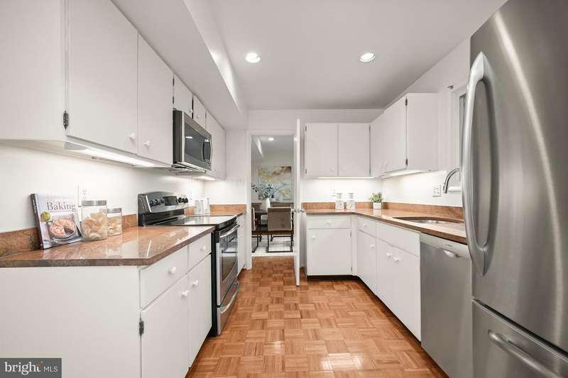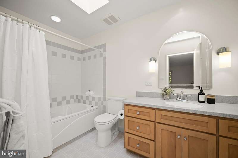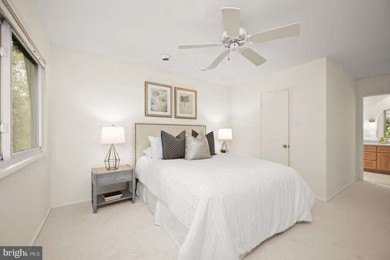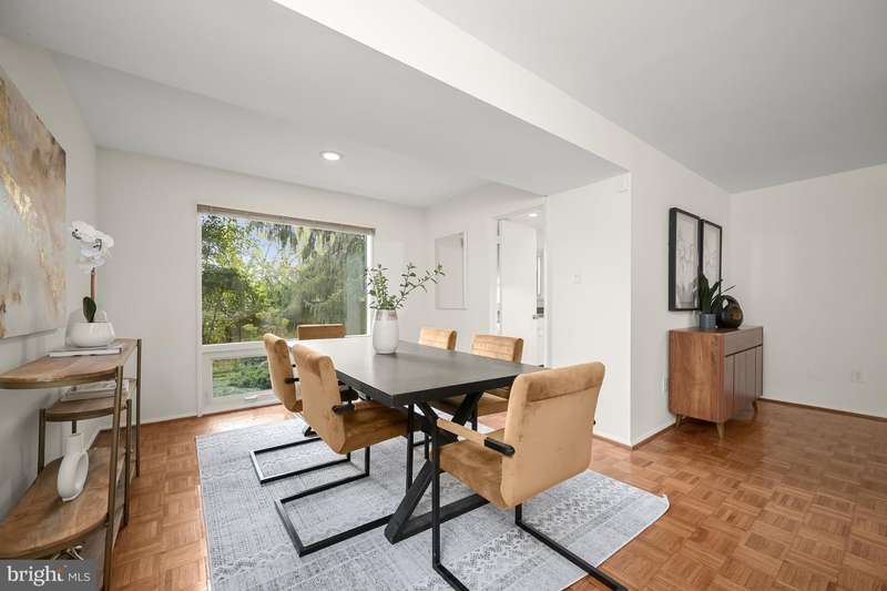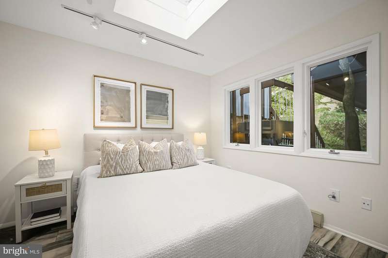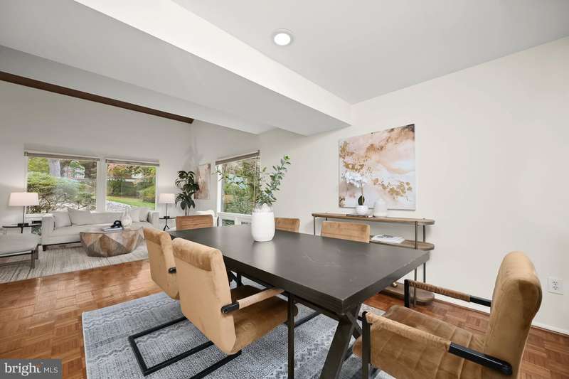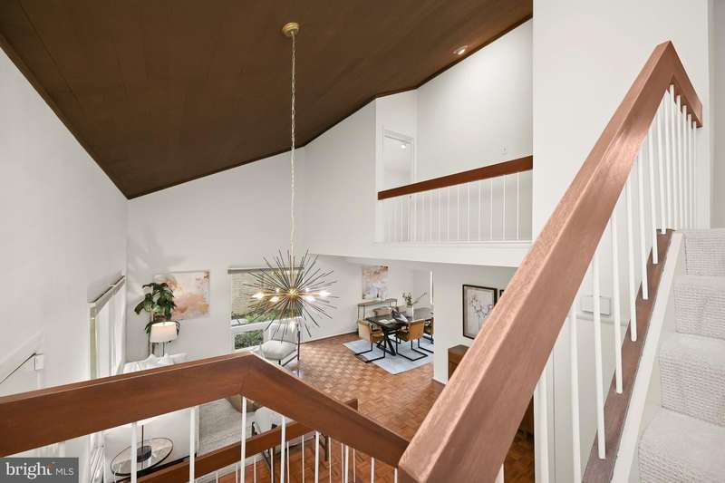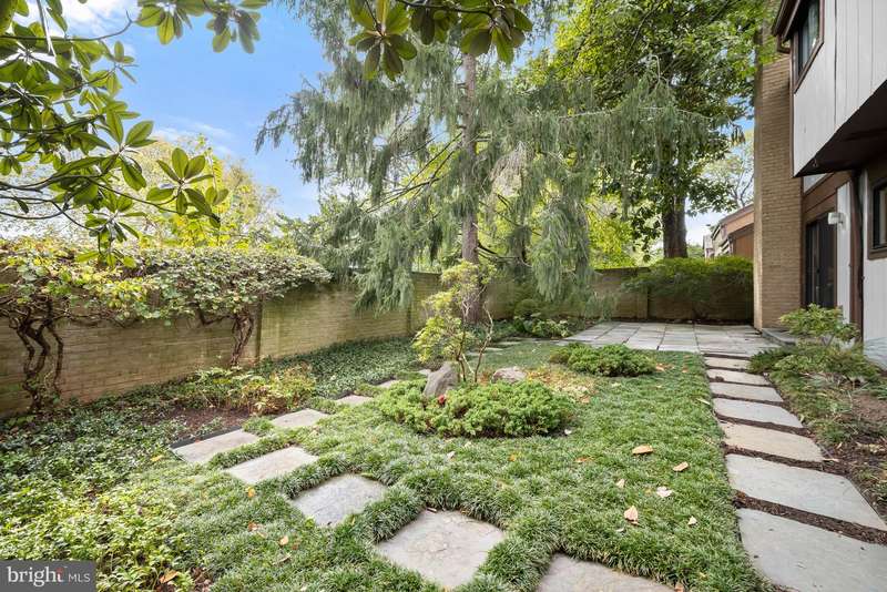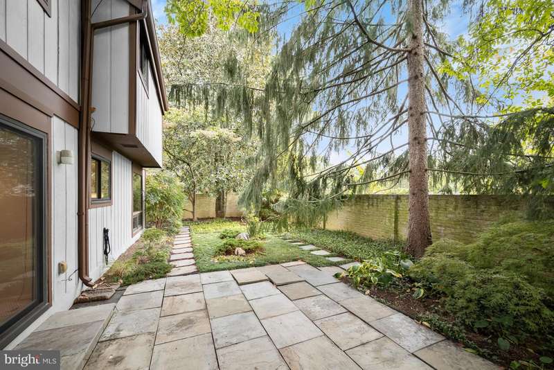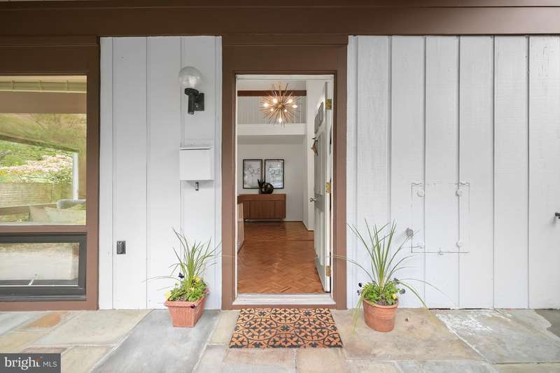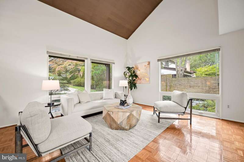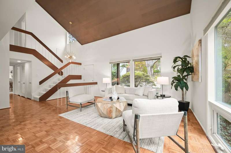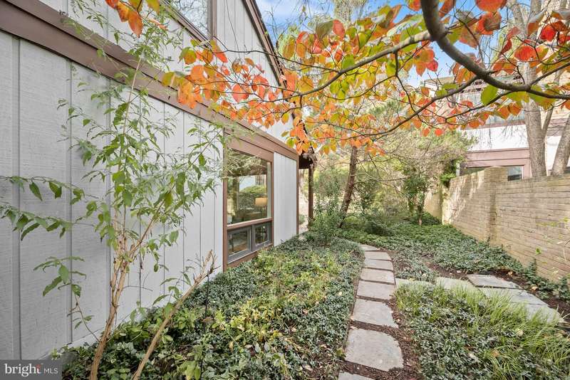 Finally - a wonderful mid-century modern home in the heart of Bethesda! Sited within a walled garden on a quiet cul-de-sac in Drumaldry, this sparkling Courts of Wyngate home is filled with light! The welcoming entry opens to the 17+ soaring ceilings of the foyer and living room and showcases the open mid-century stairway. The main level also includes a dining room, kitchen adjacent to a family room with wood-burning fireplace and an entry level bedroom with study plus an ensuite bath. Three additional bedrooms and two more full baths are found upstairs, including a primary with an ensuite bath and a walk-in cedar closet. The family room walks out to the lovely, serene patio and lush gardens. The driveway, which offers parking for two additional cars, also leads to an oversized two-car garage as well as the enclosed front gardens, which are deep and tranquil. The neighborhood is beloved for its quiet cul-de-sacs and mid-century modern design. Access points to Wyngate Elementary and North Bethesda Middle School are located at the ends of cul-de-sacs within the community. The shops and restaurants of Bethesda and North Bethesda are nearby, and the Beltway and other major arteries provide easy commutes to DC, MD and VA.