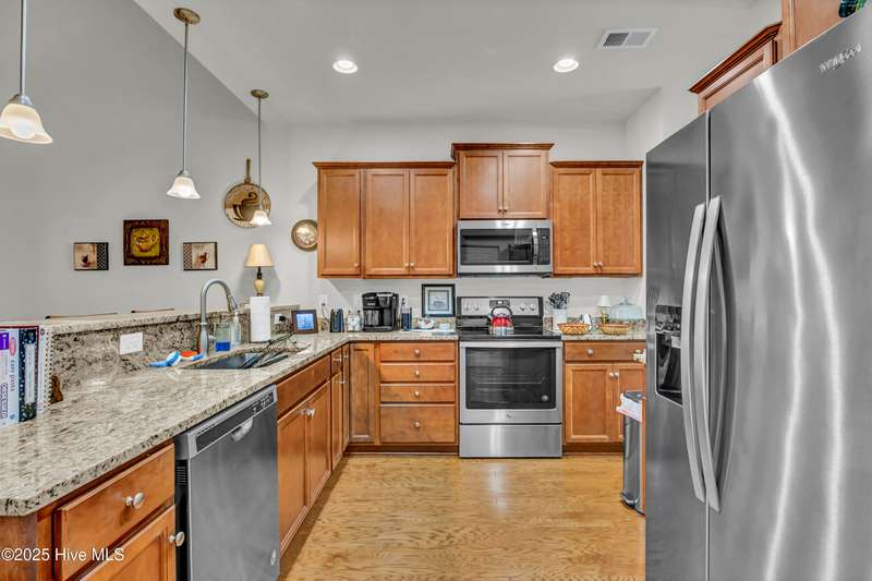 Step through the double-entry foyer of 315 Bulkhead Bend and feel instantly at home in this beautifully maintained condo nestled in the Beacon Towne community. The warm laminate wood flooring guides you past a formal dining room that features a new light fixture, setting the tone for stylish gatherings. The living room and kitchen area provide open living concept space. The kitchen impresses with Whirlpool stainless steel appliances, granite countertops, pendant lighting, and a bar-height counter perfect for casual meals. Vaulted ceilings expand the main living area, and the home is being sold partially furnished (minus the bistro table and personal items, 2 tvs), making it move-in ready. Step out onto the screened porch for peaceful outdoor moments to enjoy the backyard setting. A spacious primary suite featuring tray ceilings, Bassett furniture, blinds, double vanity, walk-in shower, tile flooring, linen closet, and walk-in closet. Upstairs, you'll find a cozy loft area, guest bath with vanity bench and tub/shower combo, and Updates include a new HVAC (2024), garbage disposal, shower head, and flushed water heater (2024). Additional features: stainless appliances include Fridge, washer, dryer. HOA maintains landscapingincluding pressure washer and lawn maintenance. Rental-friendly with a 90-day minimum. Living in Calabash and Carolina Shores, NC, offers a relaxed coastal lifestyle with all the charm of small-town living and the convenience of nearby amenities. Known as the ''Seafood Capital of the World,'' Calabash boasts an incredible culinary scene, especially for seafood lovers. The town is also just minutes from Sunset Beach, providing easy access to sun, sand, and water activities like kayaking and paddleboarding. With a potential for lower cost of living than national averages, Calabash is appealing by seeking affordability without sacrificing quality of life.