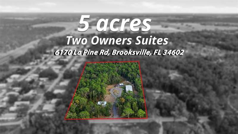 WELCOME HOME ACREAGE LOVERS — your slice of paradise awaits in Brooksville, Florida! Situated on 5 fully usable acres, this built-in-2023 retreat offers 4 bedrooms (including TWO owner’s suites), 3 bathrooms, 2,400 sq ft of living space, a stunning screened-in saltwater pool, and a large detached garage/workshop — all surrounded by the peaceful beauty La Pine Road is known for. Set among well-kept parcels, beautiful homes, and the simple charm of horses and cattle grazing nearby, this property captures the best of Florida’s pastoral living with modern comforts throughout. Inside, the home features two spacious family rooms, three fireplaces, and a thoughtful layout ideal for multi-generational living, extended guests, or just room to breathe. The gorgeous modern kitchen includes premium finishes, a walk-in pantry, and all the space a home chef could ask for. Step outside to the fully screened-in saltwater pool, perfectly positioned among mature trees for added privacy. The grounds include your own little fruit orchard (bananas, avocados, and more) plus a vegetable and herb garden tucked inside a charming greenhouse. The detached garage/workshop accommodates 3–4 vehicles, offers abundant storage, and includes a 220-amp–ready setup, making it ideal for hobbies, equipment, or home projects. Every structure, including the home, pool, and workshop, is just two years old and built for longevity with a metal roof, tankless water heater, private well and septic — all built in 2023. The acreage also offers potential to subdivide for future flexibility (buyer to verify). Brooksville is known for its rolling hills, natural beauty, and historic small-town charm. Located about 40 minutes north of Tampa and 15 miles from the Gulf, you’ll enjoy quiet country living with convenient access to parks, shops, restaurants, and everyday amenities. 30 minutes to local beaches, 20 minutes to Weeki Wachee State Park. Downtown Brooksville is only 12 minutes away and growing with a thoughtful vision for expanded shoppimg, dining and walkable spaces. Centrally located with quick access to I-75, this home offers an easy commute to all things Tampa Bay, making it perfect whether you're seeking land for a specific purpose or simply want a spacious, modern home with more bang for your buck. Zoned Agricultural-Residential, the possibilities are endless. This is a rare opportunity in one of Hernando County’s most sought-after areas. Schedule your private tour today!