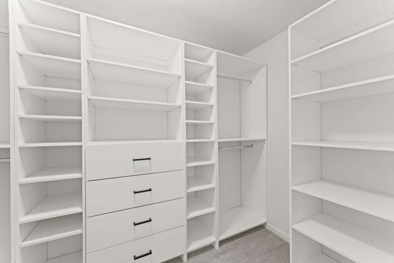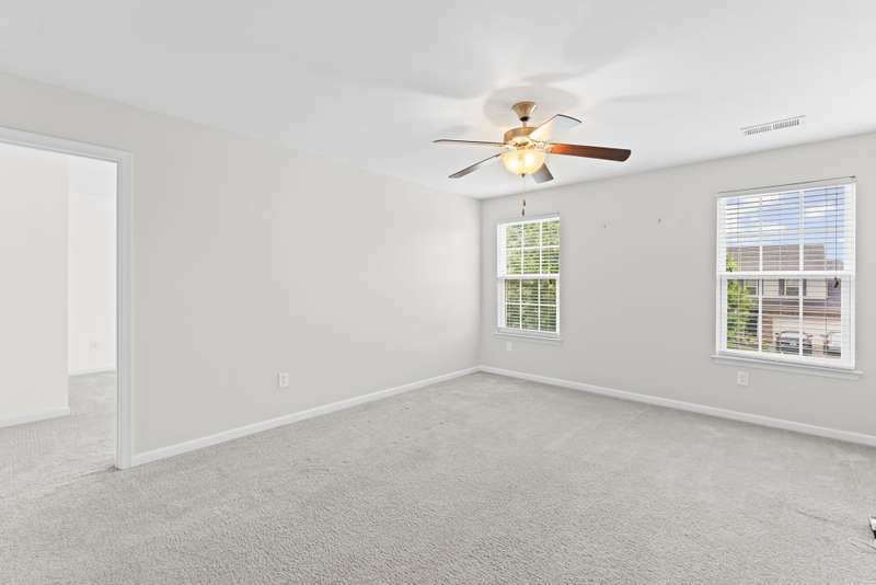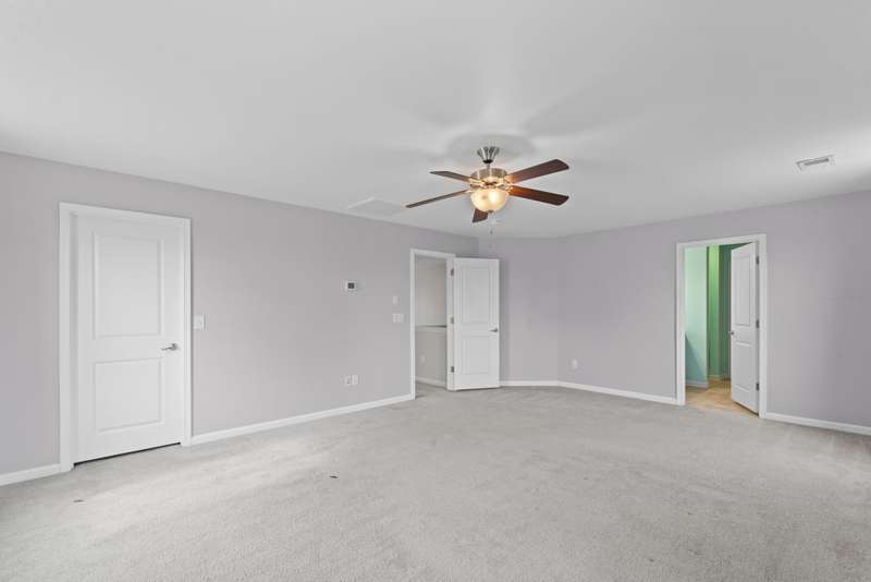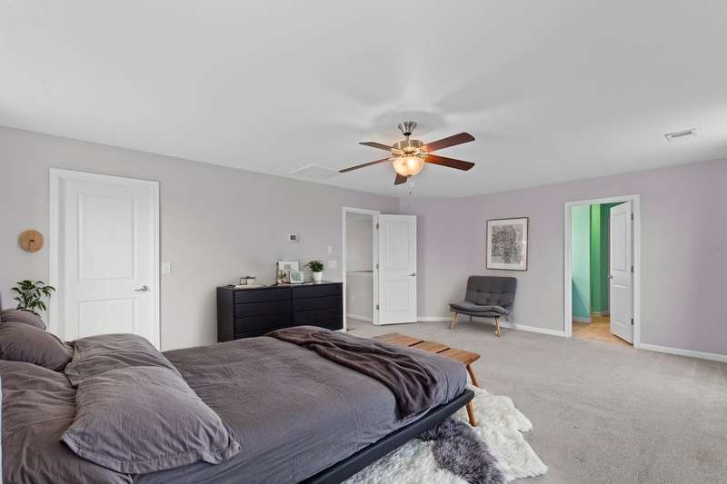 The home features three spacious bedrooms and two and a half baths, including a luxurious primary suite with expansive his-and-her closets and a double vanity sink.