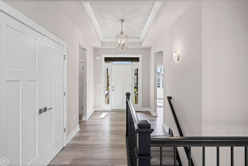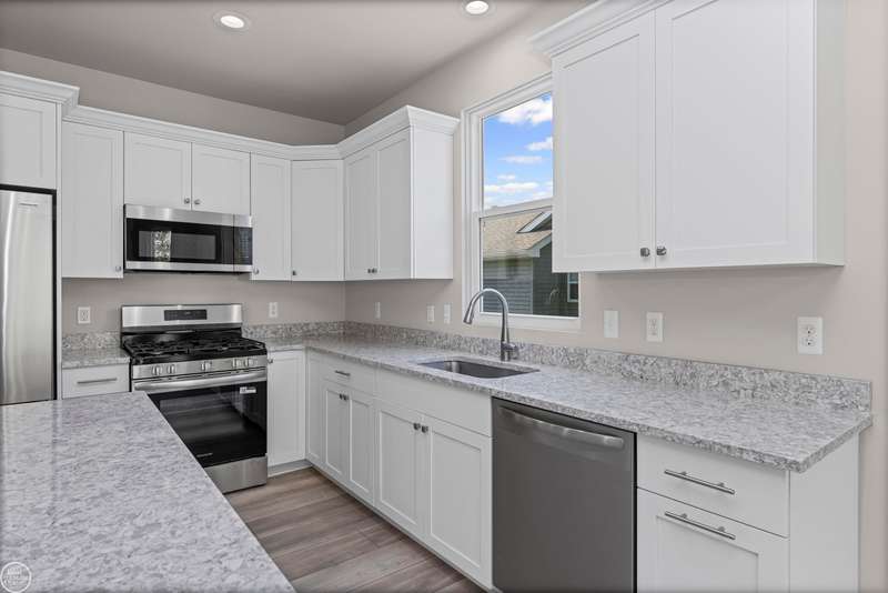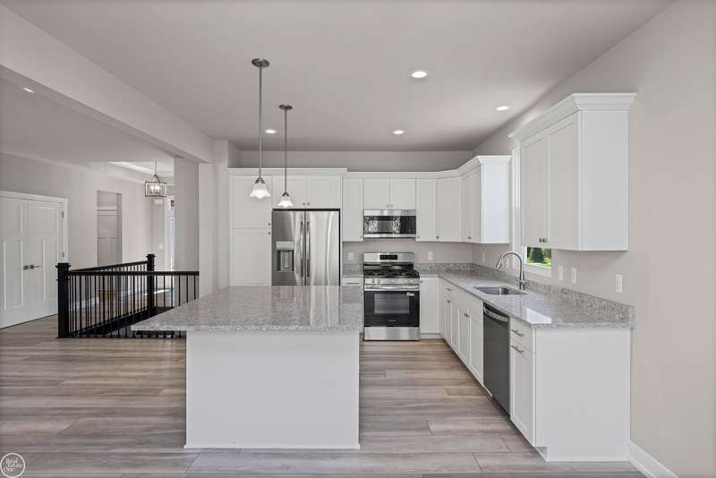 Welcome to the Rockland Ranch! Step inside to 9-foot ceilings on the main floor and a spacious family room with a dramatic cathedral ceiling. The open-concept kitchen features a charming bay window, an abundance of premium maple cabinetry with soft-close doors, recessed lighting, quartz countertops, and stainless-steel appliances. The spacious owner's suite is a true retreat, complete with a step ceiling, a cozy coffee bar area, a private bath with double sinks and quartz countertops, and a generous walk-in closet. Convenient features include a mudroom with built-in bench, a first-floor laundry room, and ceramic tile bathrooms outfitted with Kohler fixtures. Enjoy a comprehensive lighting and decorative trim package, nickel door hardware, and high-efficiency systems including a 96% efficient furnace, a 50-gallon energy-efficient water heater and central A/C. The full basement includes 9' walls, 3 plumbing preps and an egress window for future finishing potential. Conveniently located near Hess Hathaway Park and White Lake Oaks Golf Course. Don't miss your chance to call the Rockland Ranch "HOME" offering comfort and timeless design!