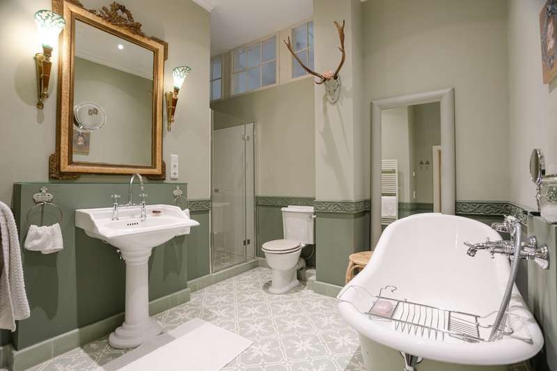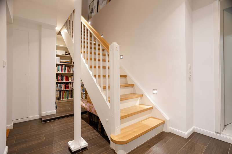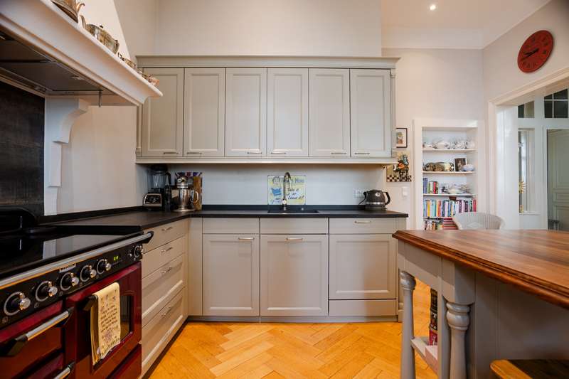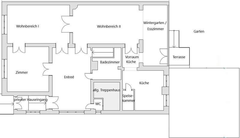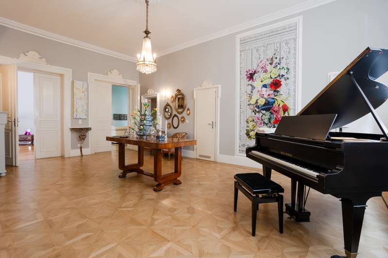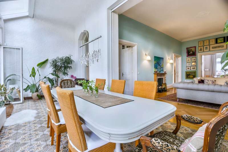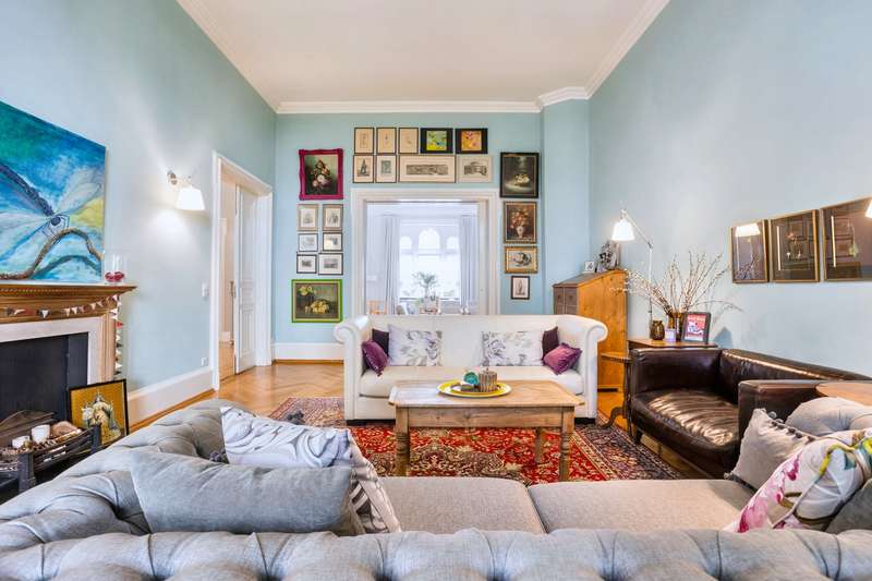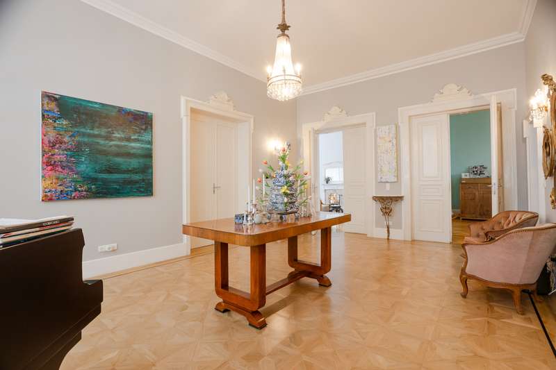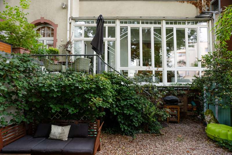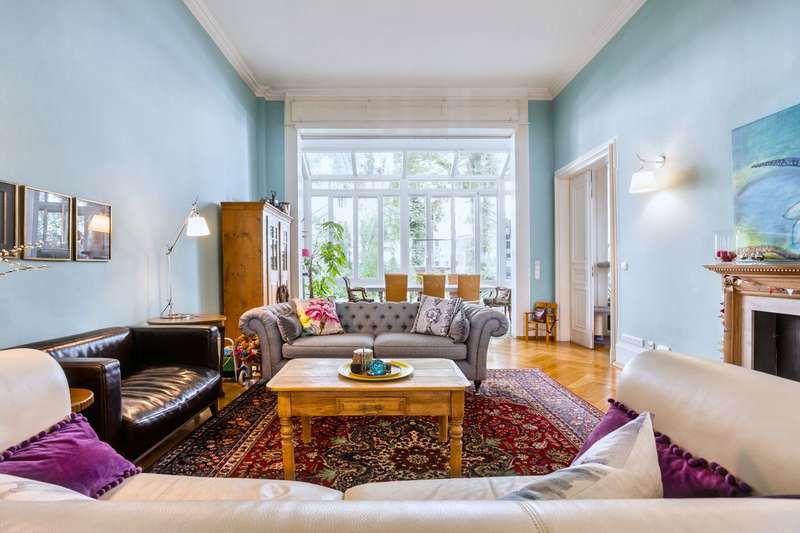 This unique period apartment with an idyllic garden is located on the mezzanine floor of a prestigious 4-family house built in 1900. The stately apartment impresses with approximately 4 meter high ceilings and original style elements typical of the construction period around 1900, such as majestic double doors and a sliding door, artfully decorated door frames, herringbone parquet flooring and high window elements in the style of the original year of construction. The stylish domicile is accessible via a private entrance and, with its two floors and garden, conveys the feeling of living in a townhouse. The spacious entrance hall on the mezzanine floor, with its elegant historical character, is suitable as a prestigious reception room with flair. As was customary in the Wilhelminian style, the three stately rooms are connected by double doors or the imposing sliding door. The dining area is housed in the fully glazed, very decorative conservatory, which is also around 4 meters high and faces directly onto the garden. The impressive, very stylish rooms are flooded with light from morning to night and offer beautiful views. The dining room leads onto the terrace and down a few steps into the idyllic garden with its English character. The large eat-in kitchen is equipped with a custom-made luxury kitchen in a historically authentic style and, in addition to modern appliances, offers a free-standing Falcon De Luxe range stove with multifunction oven and much more to match the flair of the kitchen. The bathroom on the mezzanine floor is also furnished in the Wilhelminian style. All bathrooms have underfloor heating. On the lower level of the maisonette-style apartment is a spacious, bright bedroom with high ceilings and a modern daylight bathroom. This area has a separate entrance via the general staircase. This exceptionally beautiful apartment delights with its incomparable charm and harmoniously designed, luxurious interior. The romantic garden complements the historic ambience. Part of the garden can be cut back to make use of the two parking spaces.